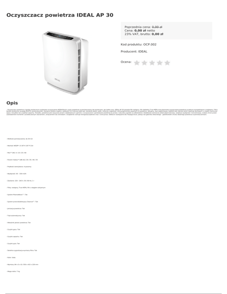 Oczyszczacz powietrza IDEAL AP 30 Poprzednia cena: 0,00 zł Cena: 0,00 zł netto 23% VAT, brutto: 0,00 zł Kod produktu: OCP.002 Producent: IDEAL Ocena: Opis - Oczyszczacz powietrza z bardzo skutecznym systemem oczyszczania AEON Blue® czyści powietrze w pomieszczeniu tak skutecznie, jak żaden inny. IDEAL AP 30 posiada filtr wstępny, filtr dokładny True HEPA oraz plazmowe oczyszczanie powietrza w jednym kompaktowym urządzeniu. Filtry bardzo skuteczne usuwają 99,97% zanieczyszczeń. Zarówno drobne cząstki o wielkości 0,3 mikrona takie jak: zarodniki pleśni, pyłki, roztocza, większość mikroorganizmów zawartych w powietrzu, alergeny, dym papierosowy, bakterie jak również sierść zwierząt domowych, a nawet chemiczne opary i brzydkie lub uciążliwe zapachy. Ponadto, powietrze jest nasycane jonami naładowanymi ujemnie, a oczyszczone i zjonizowane powietrze to prosty i naturalny sposób na odświeżenie. Dodatkowo wzmacnia układ odpornościowy, zwiększa wydajność i koncentrację, a także chroni przed uszkodzeniem komórek i przedwczesnym starzeniem, zmęczeniem lub chorobami. Urządzenie cechuje energooszczędność oraz i cicha praca. IDEALne rozwiązanie dla Twojego biura, pokoju lub gabinetu lekarskiego - gdziekolwiek chcesz idealnego powietrza w pomieszczeniach. - Wielkość pomieszczenia: do 30 m2 - Wartość WSOP*: D 197 K 197 P 214 - Moc** [W]: 4 / 10 / 25 / 60 - Poziom hałasu** [dB (A)]: 26 / 35 / 46 / 55 - Prędkość wentylatora: 4 poziomy - Wydajność: 65 - 330 m3/h - Zasilanie: 220 - 240 V, 50 / 60 Hz, 1~ - Filtry: wstępny, True HEPA, filtr z więglem aktywnym - System PlasmaWave™: Tak - System przeciwbakteryjny Cleancel™: Tak - Jonizacja powietrza: Tak - Tryb automatyczny: Tak - Wskaźnik jakości powietrza: Tak - Czujnik gazu: Tak - Czujnik zapachu: Tak - Czujnik pyłu: Tak - Świetlna sygnalizacja wymiany filtra: Tak - Kolor: biały - Wymiary (W x S x G): 550 x 415 x 220 mm - Waga netto: 7 kg - Jednostka sprzedazy 1 sztuka *WSOP – Współczynnik Szybkości Oczyszczania Powietrza (z ang. CADR - Clean Air Delivery Rate). Wartość ta informuje o skuteczności oczyszczaczy powietrza. Im jest ona wyższa, tym szybciej są usuwane z powietrza zanieczyszczenia takie jak dym (D), kurz (K) czy pyłki (P). Sprawdzone i certyfikowane przez AHAM (z ang. Association of Home Appliance Manufacturers - Stowarzyszenie Producentów Sprzętu Gospodarstwa Domowego). **wartości dotyczą odpowiednio trybów: cichy, średni, wysoki oraz turbo. Powered by TCPDF (www.tcpdf.org)