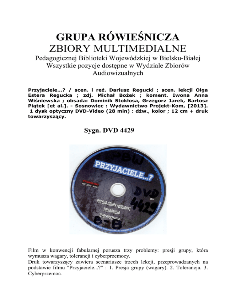 GRUPA RÓWIEŚNICZA ZBIORY MULTIMEDIALNE Pedagogicznej Biblioteki Wojewódzkiej w Bielsku-Białej Wszystkie pozycje dostępne w Wydziale Zbiorów Audiowizualnych Przyjaciele...? / scen. i reż. Dariusz Regucki ; scen. lekcji Olga Estera Regucka ; zdj. Michał Bożek ; koment. Iwona Anna Wiśniewska ; obsada: Dominik Stokłosa, Grzegorz Jarek, Bartosz Piątek [et al.]. - Sosnowiec : Wydawnictwo Projekt-Kom, [2013]. 1 dysk optyczny DVD-Video (28 min) : dźw., kolor ; 12 cm + druk towarzyszący. Sygn. DVD 4429 Film w konwencji fabularnej porusza trzy problemy: presji grupy, która wymusza wagary, tolerancji i cyberprzemocy. Druk towarzyszący zawiera scenariusze trzech lekcji, przeprowadzanych na podstawie filmu "Przyjaciele...?" : 1. Presja grupy (wagary). 2. Tolerancja. 3. Cyberprzemoc. Zgrana klasa / koment. Hanna Kubica ; wyk. uczniowie klasy 2d Gimnazjum nr 10 w Chorzowie. - Sosnowiec : Wydawnictwo Projekt-Kom, [2011]. 1 dysk optyczny DVD-Video (38 min) : dźw., kolor ; 12 cm. Filmy z serii Nie zamykaj oczu zalecane dla klas III – VI Szkoły Podstawowej i Gimnazjum oraz dla wychowawców i psychologów. Film dla uczniów: czas trwania filmu 22min Jak stworzyć zgrany, lubiący się wzajemnie i otwarty na działania społeczne zespół? Jak kształtować dobre relacje między uczniami? Jak sprawić, aby każdy w grupie czuł się bezpiecznie i odnalazł własne miejsce? Jak ważny jest wzajemny szacunek i akceptacja? Bohaterowie filmu – uczniowie 2 klasy Gimnazjum w Chorzowie uznani za najbardziej zgraną klasę w szkole wypowiadają się na temat atmosfery panującej w ich grupie. Młodzi ludzie pokazują, jak istotne są: wzajemne wsparcie, zrozumienie, tolerancja, uczciwość i zaufanie oraz podejście samego wychowawcy. Film dla nauczycieli: czas trwania filmu 16min. Hanna Kubica – pedagog i mediator sądowy, w osobnej części przeznaczonej dla nauczycieli, udziela wychowawcom wskazówek pozwalających zbudować zgrany zespół klasowy. Podkreśla jak ważne jest motywowanie uczniów, pomoc w znalezieniu własnego miejsca wśród rówieśników oraz kształtowanie umiejętności współpracy z innymi. Udziela odpowiedzi na wiele pytań m.in. Jak stworzyć zgraną klasę? Jak kształtować dobre relację w zespole klasowym? Sygn. DVD 3641 Moja tolerancja wobec odmienności : lekcje wychowawcze na DVD. Poznań : Wydawnictwo Forum, 2008. 1 dysk optyczny DVD-Video (8 min) : dźw., kolor ; 12 cm + druk towarzyszący. Sygn. DVD 1054 Komplet materiałów dydaktycznych poświęcony problemowi tolerancji wsród uczniów. Stanowi pomoc w przeprowadzeniu lekcji wychowawczej i motywowaniu uczniów do właściwych zachowań. Materiały obejmują film, scenariusz do przeprowadzenia 45-minutowych zajęć oraz opracowane przez pedagogów i psychologów wskazówki merytoryczne do rozwiązywania problemów wychowawczych. Akceptacja w grupie rówieśników : lekcje wychowawcze na DVD. Poznań : Wydawnictwo Forum, 2007. 1 dysk optyczny DVD-Video (11 min) : dźw., kolor ; 12 cm + druk towarzyszący. Sygn. DVD 1055 Komplet materiałów dydaktycznych poświęcony problemowi akceptacji i integracji wsród uczniów. Stanowi pomoc w przeprowadzeniu lekcji wychowawczej i motywowaniu uczniów do właściwych zachowań. Materiały obejmują film, scenariusz do przeprowadzenia 45-minutowych zajęć oraz opracowane przez pedagogów i psychologów wskazówki merytoryczne do rozwiązywania problemów wychowawczych. Oprac. A. Kulczycka