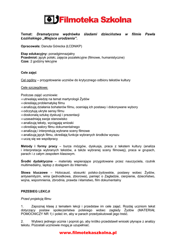 Temat: Dramatyczna wędrówka Łozińskiego „Miejsce urodzenia”. śladami dzieciństwa w filmie Pawła Opracowała: Danuta Górecka (ŁCDNiKP) Etap edukacyjny: ponadgimnazjalny Przedmiot: język polski, zajęcia pozalekcyjne (filmowe, humanistyczne) Czas: 2 godziny lekcyjne Cele zajęć Cel ogólny – przygotowanie uczniów do krytycznego odbioru tekstów kultury Cele szczegółowe: Podczas zajęć uczniowie: • utrwalają wiedzę na temat martyrologii Żydów • określają problematykę filmu • analizują działania bohaterów filmu, oceniają ich postawy i dokonywane wybory • odczytują ukryte sensy filmu • doskonalą sztukę dyskusji i prezentacji • uzasadniają swoje stanowisko • analizują teksty, wyciągają wnioski • określają walory filmu dokumentalnego • analizują i interpretują wybrane sceny filmowe • analizują język filmu, określają funkcje wybranych środków wyrazu • uczą się we współpracy Metody i formy pracy – burza mózgów, dyskusja, praca z tekstem kultury (analiza i interpretacja wybranych tekstów, a także wybranej sceny filmowej), praca w grupach, parach i z całym zespołem klasowym. Środki dydaktyczne – materiały wspierające przygotowane przez nauczyciela, rzutnik multimedialny, laptop z dostępem do Internetu Słowa kluczowe – Holocaust, stosunki polsko-żydowskie, postawy wobec Żydów, antysemityzm, wina (jednostkowa, zbiorowa), pamięć o Zagładzie, cierpienie, dzieciństwo, wojna, wspomnienia, zbrodnia, prawda i kłamstwo, film dokumentalny PRZEBIEG LEKCJI Przed projekcją filmu 1. Zapoznaj klasę z tematem lekcji i przedstaw im cele zajęć. Rozdaj uczniom tekst dotyczący postaw społeczeństwa polskiego wobec zagłady Żydów (MATERIAŁ POMOCNICZY NR 1) i poleć im, aby w parach przedyskutowali jego treść. 2. Wybierz jednego ucznia i poproś go, aby krótko przedstawił wnioski płynące z analizy tekstu. Pozostali uczniowie mogą je uzupełniać. www.filmotekaszkolna.pl 3. Przed projekcją filmu wyjaśnij uczniom, kim są Henryk Grynberg i Paweł Łoziński (MATERIAŁ POMOCNICZY NR 2), jakie okoliczności towarzyszyły powstawaniu filmu. Po projekcji filmu 4. Zapisz na tablicy tytuł filmu. Zapytaj uczniów o ich miejsce urodzenia. Czy jest ono dla nich ważne? Dlaczego? 5. Nawiąż do filmu: „Gdzie znajdowało się miejsce urodzenia Henryka Grynberga?” 6. Przypomnij uczniom początek filmu (ujęcie przedstawiające lądujący w zimowy dzień samolot). Uświadom im, że w filmie często widzimy Grynberga podróżującego (samochodem, chłopską furmanką), idącego drogą itd. Zapytaj młodzież, jakie podróże odbył Henryk Grynberg w filmie Miejsce urodzenia. Poproś o ich nazwanie. • • • PODRÓŻ DO POLSKI POCZĄTKU LAT 90. POWRÓT DO PRZESZŁOŚCI, DO CZASÓW DZIECIŃSTWA WĘDRÓWKA ŚLADAMI DZIECIŃSTWA W POSZUKIWANIU PRAWDY 7. Zapowiedz uczniom, że będą w grupach zastanawiali się nad znaczeniami podróży odbytych przez Henryka Grynberga. Podziel klasę na sześć zespołów. Przydziel im zadania (MATERIAŁ POMOCNICZY NR 3), krótko je omów, przypomnij zasady pracy grupowej (MATERIAŁ POMOCNICZY NR 4) i określ czas, w którym grupy muszą się zmieścić (15 minut). 8. Monitoruj pracę grup. Po wyznaczonym czasie poproś sprawozdawców, aby zaprezentowali wyniki prac swoich zespołów. (Powinno to wyglądać w ten sposób, że sprawozdawca grupy I omawia zagadnienie dyskutowane przez jego grupę, a sprawozdawca grupy II, która rozpracowywała to samo zadanie, uzupełnia wypowiedź kolegi itd.) Do tych wypowiedzi mogą swoje spostrzeżenia wnosić również inni uczniowie. 9. Podsumuj wyniki pracy grupowej. Zapytaj uczniów, jakie postawy wobec Żydów odnajdujemy w filmie. W jaki sposób w języku rozmówców Grynberga odzwierciedla się ich stosunek do Żydów? Przytocz słowa Jana Tomasza Grossa1, który w jednym z telewizyjnych wywiadów powiedział, że w czasie wojny niektórzy „Polacy przeszkadzali Żydom w przeżyciu”2. Czy w filmie Pawła Łozińskiego znajdziemy potwierdzenie tych gorzkich słów? 10. Zapytaj uczniów, dlaczego wyjawienie prawdy i odkopanie szczątków Abrama (ojca Grynberga) było ważne nie tylko dla pisarza, ale również dla mieszkańców jego rodzinnej wsi. 1 Jan Tomasz Gross - polski socjolog żydowskiego pochodzenia, na stałe zamieszkały w Stanach Zjednoczonych. Zajmuje się naukami politycznymi i społecznymi, a w tym kontekście szczególnie problematyką wojenną. Autor między innymi Sąsiadów - książki o pogromie w Jedwabnem dokonanym 10 lipca 1941 na żydowskich mieszkańcach miasta. 2 http://www.youtube.com/watch?v=4uKATSUttRk www.filmotekaszkolna.pl 11. Przypomnij młodzieży, że inspiracją do powstania filmu były książki Grynberga (np. Dziedzictwo). Rozdaj klasie MATERIAŁ POMOCNICZY NR 5 i poproś, aby zapoznali się z fragmentem książki Grynberga Żydowska wojna3, a następnie wyjaśnili, dlaczego bohaterowie tej prozy stali się dla swoich sąsiadów duchami. (Uczniowie mogą dyskutować na ten temat w parach). 12. Powróć do filmu. Zapytaj, kim staje się dla miejscowych chłopów Grynberg, który po wielu latach zjawia się w swoich rodzinnych stronach. 13. Pokaż uczniom fragment filmu przedstawiający rozmowę Grynberga z którymś z mieszkańców wsi i poproś ich, aby podczas tej krótkiej projekcji zwrócili uwagę na rozwiązania warsztatowe wprowadzone przez Pawła Łozińskiego. W jaki sposób filmowani są ludzie? Na co reżyser zwraca szczególną uwagę, portretując swoich bohaterów? W jaki sposób reżyser i jego ekipa kreują sytuacje, które sprawiają, że dla rozmówców Grynberga obecność kamery staje się czymś naturalnym? 14. Podziękuj uczniom za aktywność na zajęciach. Poproś ich o krótką refleksję na temat lekcji. (Co było dla nich interesujące? Czy dobrze im się pracowało na zajęciach? Z czego są zadowoleni? Co należałoby poprawić?). Objaśnij pracę domową. PRACA DOMOWA Prze