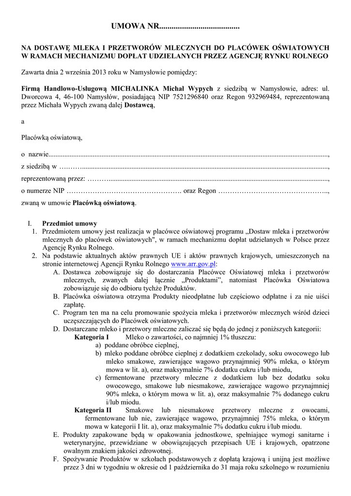 UMOWA NR....................................... NA DOSTAWĘ MLEKA I PRZETWORÓW MLECZNYCH DO PLACÓWEK OŚWIATOWYCH W RAMACH MECHANIZMU DOPŁAT UDZIELANYCH PRZEZ AGENCJĘ RYNKU ROLNEGO Zawarta dnia 2 września 2013 roku w Namysłowie pomiędzy: Firmą Handlowo-Usługową MICHALINKA Michał Wypych z siedzibą w Namysłowie, adres: ul. Dworcowa 4, 46-100 Namysłów, posiadającą NIP 7521296840 oraz Regon 932969484, reprezentowaną przez Michała Wypych zwaną dalej Dostawcą, a Placówką oświatową, o nazwie.............................................................................................................................................................., z siedzibą w ….……..........................................................................................................................................., reprezentowaną przez: ………............................................................................................................................, o numerze NIP …………………………………………. oraz Regon ……………………………………….., zwaną w umowie Placówką oświatową. I. Przedmiot umowy 1. Przedmiotem umowy jest realizacja w placówce oświatowej programu „Dostaw mleka i przetworów mlecznych do placówek oświatowych", w ramach mechanizmu dopłat udzielanych w Polsce przez Agencję Rynku Rolnego. 2. Na podstawie aktualnych aktów prawnych UE i aktów prawnych krajowych, umieszczonych na stronie internetowej Agencji Rynku Rolnego www.arr.gov.pl: A. Dostawca zobowiązuje się do dostarczania Placówce Oświatowej mleka i przetworów mlecznych, zwanych dalej łącznie „Produktami”, natomiast Placówka Oświatowa zobowiązuje się do odbioru tychże Produktów. B. Placówka oświatowa otrzyma Produkty nieodpłatne lub częściowo odpłatne i za nie uiści zapłatę. C. Program ten ma na celu promowanie spożycia mleka i przetworów mlecznych wśród dzieci uczęszczających do Placówek oświatowych. D. Dostarczane mleko i przetwory mleczne zaliczać się będą do jednej z poniższych kategorii: Kategoria I Mleko o zawartości, co najmniej 1% tłuszczu: a) poddane obróbce cieplnej, b) mleko poddane obróbce cieplnej z dodatkiem czekolady, soku owocowego lub mleko smakowe, zawierające wagowo przynajmniej 90% mleka, o którym mowa w lit. a), oraz maksymalnie 7% dodatku cukru i/lub miodu, c) fermentowane przetwory mleczne z dodatkiem lub bez dodatku soku owocowego, smakowe lub niesmakowe, zawierające wagowo przynajmniej 90% mleka, o którym mowa w lit. a), oraz maksymalnie 7% dodanego cukru i/lub miodu. Kategoria II Smakowe lub niesmakowe przetwory mleczne z owocami, fermentowane lub nie, zawierające wagowo, przynajmniej 75% mleka, o którym mowa w kategorii I lit. a), oraz maksymalnie 7% dodatku cukru i/lub miodu. E. Produkty zapakowane będą w opakowania jednostkowe, spełniające wymogi sanitarne i weterynaryjne, przewidziane w obowiązujących przepisach UE i krajowych, opatrzone owalnym znakiem jakości zdrowotnej. F. Spożywanie Produktów w szkołach podstawowych z dopłatą krajową i unijną jest możliwe przez 3 dni w tygodniu w okresie od 1 października do 31 maja roku szkolnego w rozumieniu G. H. I. J. K. Rozporządzenia Ministra Edukacji Narodowej i Sportu z dnia 18 kwietnia 2002r. w sprawie organizacji roku szkolnego (Dz. U. z 2002r. Nr 46, poz. 432, z późn. zm.) z wyłączeniem ferii i przerw świątecznych. W pozostałe dni od 1 października do 31 maja roku szkolnego oraz w miesiącu wrześniu i czerwcu roku szkolnego w rozumieniu Rozporządzenia Ministra Edukacji Narodowej i Sportu z dnia 18 kwietnia 2002r. w sprawie organizacji roku szkolnego (Dz. U. z 2002r. Nr 46, poz. 432, z późn. zm.) z wyłączeniem ferii i przerw świątecznych, dziecko w szkole podstawowej może spożywać Produkty po cenie uwzględniającej tylko dopłatę unijną. Pozostałe rodzaje placówek mogą korzystać z programu z uwzględnieniem dopłaty unijnej w każdy dzień roku szkolnego w rozumieniu Rozporządzenia Ministra Edukacji Narodowej i Sportu z dnia 18 kwietnia 2002r. w sprawie organizacji roku szkolnego (Dz. U. z 2002r. Nr 46, poz. 432, z późn. zm.) z wyłączeniem ferii i przerw świątecznych. Częstotliwość dostaw Produktów do Placówki Oświatowej będzie wynosić 1-5 razy w tygodniu. Do placówki uczęszcza: a) ................................... przedszkolaków, b) ................................... uczniów szkoły podstawowej, c) ................................... uczniów gimnazjum, d) ................................... uczniów szkoły średniej. Deklarację korzystania z programu złożyło: a) ................................... przedszkolaków, b) ................................... uczniów szkoły podstawowej, c) ................................... uczniów gimnazjum, d) ................................... uczniów szkoły średniej. II. Obowiązki Placówki oświatowej 1. Mleko i przetwory mleczne dostarczane do placówek oświatowych mogą być wykorzystywane do przygotowywania posiłków, które nie wymagają obróbki cieplnej. 2. Dopuszcza się podgrzewanie mleka i mleka smakowego (z kategorii I a) i b)). 3. Produkty będą codziennie wydawane i spożywane jedynie przez dzieci na terenie placówki oświatowej podczas zajęć szkolnych. Porcja wynosi 0,25L na jedno dziecko w danym dniu. 4. Produkty będą spożywane przez uprawnione dzieci tj. uczęszczające do danej Placówki oświatowej. 5. Dokumenty związane z realizacją programu tj. WZ, faktury VAT, potwierdzenia zapłaty przez dzieci, potwierdzenia dostaw oraz inne przechowywane będą przez okres 5 lat. 6. Placówka oświatowa ma obowiązek umieszczenia w swojej siedzibie plakatu informującego o uczestnictwie w programie dotowanym przez Unię Europejską. 7. Placówka oświatowa ma obowiązek poddania się wszelkim kontrolom i czynnościom sprawdzającym przeprowadzanym przez komórki organizacyjne pionu kontrolneg