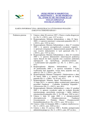URZĄD MIEJSKI W WAŁBRZYCHU PL. MAGISTRACKI 1, 58-300 WAŁBRZYCH TEL. 074/66 55 100, FAX 074/66 55 118 www.um.walbrzych.pl www.bip.um.walbrzych.pl KARTA INFORMACYJNA <REJESTRACJA UŻYWANEGO POJAZDU – ZAKUP NA TERENIE KRAJU> Podstawa prawna 1. Ustawa z dnia 20 czerwca 1997 r. Prawo o ruchu drogowym (j.t. Dz. U. z 2012 r., poz. 1137 ze zm.). 2. Rozporządzenie Ministra Infrastruktury z dnia 22 lipca 2002 r. w sprawie rejestracji i oznaczania pojazdów (Dz. U. z 2014 r., poz. 1522 ze zm.). 3. Rozporządzenie Ministra Infrastruktury z dnia 27 września 2003 r. w sprawie szczegółowych czynności organów w sprawach związanych z dopuszczeniem pojazdu do ruchu oraz wzorów dokumentów w tych sprawach (Dz. U. z 2014 r., poz. 1727 ze zm.). 4. Rozporządzenie Ministra Infrastruktury z dnia 24 września 2003 r. w sprawie dokumentów stanowiących podstawę wpisu danych do karty pojazdu oraz czynności jednostek zajmujących się dystrybucją, przechowywaniem i wydawaniem kart pojazdów (j.t. Dz. U. z 2014 r., poz. 431). 5. Rozporządzenie Ministra Infrastruktury z dnia 20 października 2003 r. w sprawie warunków i trybu wydawania kart pojazdów, wzoru karty pojazdu oraz jej opisu (j.t. Dz. U. z 2014 r., poz. 451). 6. Rozporządzenie Ministra Transportu i Budownictwa z dnia 28 marca 2006 r. w sprawie wysokości opłat za kartę pojazdu (Dz. U. z 2006 r. Nr 59, poz. 421). 7. Rozporządzenie Ministra Spraw Wewnętrznych z dnia 15 maja 2015 r. w sprawie opłaty ewidencyjnej stanowiącej przychód Funduszu – Centralna Ewidencja Pojazdów i Kierowców (Dz. U. z 2015 r., poz. 681). 8. Rozporządzenie Ministra Infrastruktury z dnia 22 grudnia 2003 r. w sprawie wysokości opłat za wydanie dowodu rejestracyjnego, pozwolenia czasowego i tablic (tablicy) rejestracyjnych pojazdów (Dz. U. Nr 230, poz. 2302 ze zm.). 9. Ustawa z dnia 22 maja 2003 r. o ubezpieczeniach obowiązkowych, Ubezpieczeniowym Funduszu Gwarancyjnym i Polskim Biurze Ubezpieczycieli Komunikacyjnych (j.t. Dz. z 2013 r., poz. 392 ze zm.). 10. Ustawa z dnia 16 listopada 2006 r. o opłacie skarbowej (j.t. Dz. U. z 2014 r., poz. 1628 ze zm.). 11. Ustawa z dnia 14 czerwca 1960 r. Kodeks postępowania administracyjnego (j.t. Dz. U. z 2013 r., poz. 267 ze zm.). Wymagane dokumenty Do wniosku o rejestrację pojazdu należy dołączyć: 1. oryginał dowodu własności pojazdu (umowa kupnasprzedaży, faktura VAT itp.), 2. dowód rejestracyjny pojazdu lub decyzja o czasowym wycofaniu pojazdu z ruchu, 3. kartę pojazdu, jeżeli była wydana, 4. tablice (tablicę) rejestracyjne, 5. zaświadczenie o pozytywnym wyniku badania technicznego, jeżeli termin następnego badania technicznego wpisany w dowodzie rejestracyjnym upłynął przed rejestracją lub jego termin nie przekracza 30 dni, 6. pełnomocnictwo – w przypadku działania przez pełnomocnika (oryginał lub urzędowo poświadczony odpis pełnomocnictwa art. 33 § 3 KPA). Jeżeli pojazd stanowi współwłasność – wszelkie sprawy związane z jego rejestracją załatwiają wszyscy współwłaściciele, bądź ich pełnomocnik/pełnomocnicy. Należy przedstawić do wglądu: - dowód osobisty, - aktualny odpis z Krajowego Rejestru Sądowego (KRS) oraz zaświadczenie REGON (dotyczy podmiotów posiadających osobowość prawną), - zaświadczenie o wpisie do ewidencji działalności gospodarczej (wpisy do ewidencji działalności gospodarczej wszystkich wspólników) – dotyczy osób prowadzących działalność gospodarczą, - dokument ubezpieczenia OC pojazdu. Wzory dokumentów do pobrania Wniosek o rejestrację, czasową rejestrację albo wyrejestrowanie (zał. Nr 1 do rozporządzenia Ministra Infrastruktury z dnia 22 lipca 2002 r. w sprawie rejestracji i oznaczania pojazdów (j.t. Dz. U. z 2014 r., poz. 1522). Komórka odpowiedzialna Biuro Komunikacji za prowadzenie sprawy tel. 74 64 88 577, fax: 74 64 88 585 Miejsce składania dokumentów Biuro Komunikacji jest usytuowane w pobliżu Ratusza – róg ulicy Sienkiewicza i Placu Magistrackiego - ul. Henryka Sienkiewicza 9 – wejście „A” Biuro Komunikacji przyjmuje klientów: w poniedziałki, środy i czwartki w godzinach od 7.30 do 15.30, we wtorki od 7.30 do 16.30, w piątki od 7.30 do 14.30. Termin załatwienia sprawy Niezwłocznie, nie później niż w ciągu miesiąca, a w przypadku sprawy szczególnie skomplikowanej nie później niż w ciągu dwóch miesięcy. Opłaty - samochód – 80,00 zł (tablice rejestracyjne), - motocykl – 40,00 zł (tablica rejestracyjna), - motorower – 30,00 zł (tablica rejestracyjna), - przyczepa – 40,00 zł, - tablice indywidualne – 1.000,00 zł, - tablice zabytkowe samochodowe – 100,00 zł, - tablice zabytkowe motocyklowe – 50,00 zł, - pozwolenie czasowe – 13,50 zł (wydawane z urzędu – po złożeniu wniosku o rejestrację pojazdu) + 0,50 zł (opłata ewidencyjna), - pozwolenie czasowe – 18,50 zł (wydane na wniosek właściciela pojazdu – w celu umożliwienia: wywozu pojazdu za granicę; przejazdu pojazdu z miejsca jego zakupu lub odbioru na teryt. RP; przejazdu pojazdu związanego z koniecznością dokonania jego badania technicznego lub naprawy) + 0,50 zł (opłata ewidencyjna), - dowód rejestracyjny – 54,00 zł + 0,50 zł (opłata ewidencyjna) - komplet znaków legalizacyjnych – 12,50 zł + 0,50 (opłata ewidencyjna), - nalepka kontrolna na szybę – 18,50 zł + 0,50 zł (opłata ewidencyjna), - karta pojazdu – 75,00 zł + 0,50 zł (opłata ewidencyjna). Przykładowe opłaty w przypadku wymiany tablic rejestracyjnych: -samochód osobowy, ciągnik siodłowy – 180,50 zł -motocykl, quad, przyczepa, ciągnik siodłowy – 121,50 zł -motorower – 111,50 zł -motocykl trójkołowy, homologacja L5, L2 – 161,50 zł -motorower trójkołowy, homologacja L5, L2 – 141,50 zł Tryb odwoławczy Odwołanie od decyzji można wnieść w terminie 14 dni od dnia jej otrzymania do Samorządowego Kolegium Odwoławczego w Wałbrzychu za pośrednictwem Prezydenta Miasta Wałbrzy