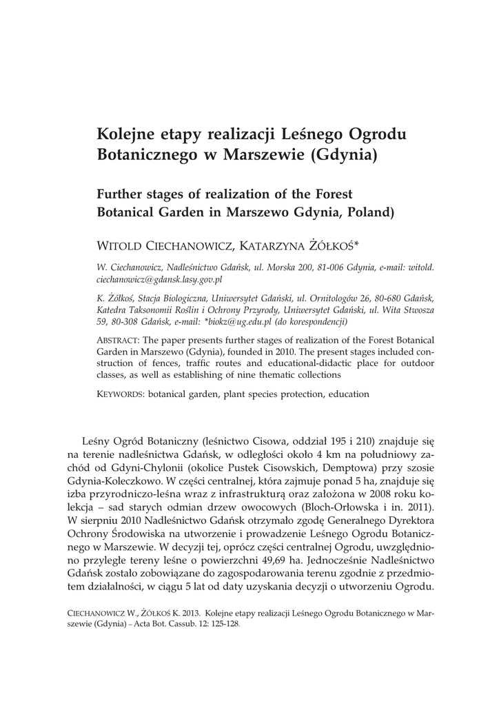 Kolejne etapy realizacji Leœnego Ogrodu Botanicznego w Marszewie (Gdynia) Further stages of realization of the Forest Botanical Garden in Marszewo Gdynia, Poland) WITOLD CIECHANOWICZ, KATARZYNA ¯Ó£KOŒ* W. Ciechanowicz, Nadleœnictwo Gdañsk, ul. Morska 200, 81-006 Gdynia, e-mail: witold. [email protected] K. ¯ó³koœ, Stacja Biologiczna, Uniwersytet Gdañski, ul. Ornitologów 26, 80-680 Gdañsk, Katedra Taksonomii Roœlin i Ochrony Przyrody, Uniwersytet Gdañski, ul. Wita Stwosza 59, 80-308 Gdañsk, e-mail: *[email protected] (do korespondencji) ABSTRACT: The paper presents further stages of realization of the Forest Botanical Garden in Marszewo (Gdynia), founded in 2010. The present stages included construction of fences, traffic routes and educational-didactic place for outdoor classes, as well as establishing of nine thematic collections KEYWORDS: botanical garden, plant species protection, education Leœny Ogród Botaniczny (leœnictwo Cisowa, oddzia³ 195 i 210) znajduje siê na terenie nadleœnictwa Gdañsk, w odleg³oœci oko³o 4 km na po³udniowy zachód od Gdyni-Chylonii (okolice Pustek Cisowskich, Demptowa) przy szosie Gdynia-Koleczkowo. W czêœci centralnej, która zajmuje ponad 5 ha, znajduje siê izba przyrodniczo-leœna wraz z infrastruktur¹ oraz za³o¿ona w 2008 roku kolekcja – sad starych odmian drzew owocowych (Bloch-Or³owska i in. 2011). W sierpniu 2010 Nadleœnictwo Gdañsk otrzyma³o zgodê Generalnego Dyrektora Ochrony Œrodowiska na utworzenie i prowadzenie Leœnego Ogrodu Botanicznego w Marszewie. W decyzji tej, oprócz czêœci centralnej Ogrodu, uwzglêdniono przyleg³e tereny leœne o powierzchni 49,69 ha. Jednoczeœnie Nadleœnictwo Gdañsk zosta³o zobowi¹zane do zagospodarowania terenu zgodnie z przedmiotem dzia³alnoœci, w ci¹gu 5 lat od daty uzyskania decyzji o utworzeniu Ogrodu. CIECHANOWICZ W., ¯Ó£KOŒ K. 2013. Kolejne etapy realizacji Leœnego Ogrodu Botanicznego w Marszewie (Gdynia) – Acta Bot. Cassub. 12: 125-128. 126 Witold Ciechanowicz, Katarzyna ¯ó³koœ Wspomniana dzia³alnoœæ obejmuje utworzenie kolekcji roœlin, uczestniczenie w badaniach, których priorytetem jest ochrona gatunków roœlin zagro¿onych wyginiêciem w stanie wolnym oraz edukowanie w zakresie ochrony gatunkowej roœlin oraz ich ekosystemów. W celu realizacji zadañ dotycz¹cych badañ naukowych na terenie Leœnego Ogrodu Botanicznego w Marszewie Nadleœnictwo Gdañsk podpisa³o umowê o wspó³pracy z Uniwersytetem Gdañskim. Jesieni¹ 2010 roku zapocz¹tkowano tworzenie kolekcji roœlin chronionych i zagro¿onych – z terenu powstaj¹cego Portu Lotniczego Gdynia-Kosakowo metaplantowano (przeniesiono) oko³o 400 egzemplarzy okazów kruszczyka szerokolistnego Epipactis helleborine (L.) Crantz (zgodnie z decyzj¹ Regionalnego Dyrektora Ochrony Œrodowiska w Gdañsku z dnia 04.10.2010 r.; pismo nr RDOŒ-22-PN.II-6631-1-29/10/ds.). W tym roku zlecono równie¿ biuru projektowemu „Maxprojekt” stworzenie projektu wykonawczego ci¹gów komunikacyjnych na terenie ogrodu (Bloch-Or³owska i in. 2011). Przyspieszenie realizacji projektu mo¿liwe by³o dziêki dotacji Narodowego Funduszu Ochrony Œrodowiska i Gospodarki Wodnej przyznanej nadleœnictwu na pocz¹tku 2012 roku. Podzielono j¹ na etapy. W pierwszym z nich wykonano ogrodzenie terenu, infrastrukturê komunikacyjn¹ (drogi, œcie¿ki, dwa parkingi, zatokê postojow¹ dla pojazdów, podjazdy dla osób niepe³nosprawnych), a tak¿e plac zabaw i oczko wodne. Stworzono równie¿ witrynê internetow¹ (strona internetowa, profil na portalu Facebook, reklama – www.marszewo.edu.pl, https://www.facebook.com/Marszewo), która stanowi promocjê Leœnego Ogrodu Botanicznego „Marszewo” w Internecie. Dzia³ania zwi¹zane z pierwszym etapem ukoñczono zgodnie z harmonogramem w grudniu 2012 roku. W styczniu 2013 roku, dziêki staraniom Nadleœnictwa Gdañsk, Zak³ad Komunikacji Miejskiej w Gdyni skorygowa³ godziny kursowania autobusu 288, na bardziej korzystne dla uczniów gdyñskich szkó³ i zmieni³ nazwê dotychczasowego przystanku z „Marszewska II” na „Ogród Botaniczny «Marszewo»”. Drugi etap wykonania projektu, przewidziany na 2013 rok, obejmowa³ przebudowê i urz¹dzenie placu dydaktyczno-edukacyjnego oraz za³o¿enie wybranych kolekcji roœlin. Centraln¹ czêœæ ekspozycji na placu dydaktyczno-edukacyjnym stanowi¹ dwa œciête drzewa (iglaste i liœciaste), wokó³ których ustawiono tablice obrazuj¹ce ¿ycie drzewa, powi¹zania drzew z innymi organizmami oraz miejsce drzew w ekosystemie leœnym, a tak¿e znaczenie drzew dla cz³owieka (fot. 1). Tablice zatytu³owano m.in.: „System korzeniowy”, „Wzrost i pokrój drzewa”, „Drewno i jego budowa”, „Koniec pierwszego ¿ycia drzewa”, „Drzewa a inne organizmy – huby”, „Drzewa a inne organizmy – owady ¿eruj¹ce na drzewie/drewnie i œlady ich dzia³alnoœci”, „Drzewo/drewno a inne organizmy – ptaki i nietoperze”, „Drzewo/drewno a inne organizmy – pn¹cza”, „Trzecie ¿ycie drzewa”. Na placu znajduj¹ siê tak¿e sto³y i ³awy, czyli „klasa pod chmurk¹”. Spoœród 27 kolekcji tematycznych, zaplanowanych w opracowaniu dotycz¹cym Leœnego Ogrodu Botanicznego w Marszewie (¯ó³koœ i in. 2008) wybrano dziewiêæ kolekcji roœlin, które za³o¿ono w terenie jesieni¹ 2013 roku (tab. 1). Kolejne etapy realizacji Leœnego Ogrodu Botanicznego w Marszewie (Gdynia) 127 Tabela 1. Wykaz kolekcji tematycznych za³o¿onych w Leœnym Ogrodzie Botanicznym „Marszewo” w 2013 r. Table 1. List of thematic collections established in the Forest Botanical Garden ‘Marszewo’ in 2013. Numer kolekcji [Collection no.] 1 2 3 4 5 6 7 8 9 Tytu³ kolekcji [Title of collection] Drzewa i krzewy obcego pochodzenia Krzewy obrze¿y lasów £¹ka Gatunki drzew i krzewów chronione i zagro¿one w regionie gdañskim Drzewa i krzewy o znaczeniu biocenotycznym Dziko rosn¹ce roœliny lecznicze rosn¹ce w lasach i na ³¹kac