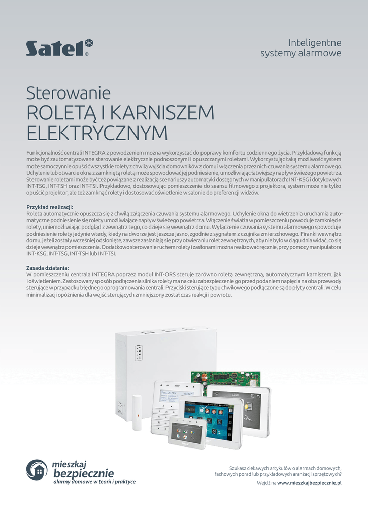 Inteligentne systemy alarmowe Sterowanie ROLETĄ I KARNISZEM ELEKTRYCZNYM Funkcjonalność centrali INTEGRA z powodzeniem można wykorzystać do poprawy komfortu codziennego życia. Przykładową funkcją może być zautomatyzowane sterowanie elektrycznie podnoszonymi i opuszczanymi roletami. Wykorzystując taką możliwość system może samoczynnie opuścić wszystkie rolety z chwilą wyjścia domowników z domu i włączenia przez nich czuwania systemu alarmowego. Uchylenie lub otwarcie okna z zamkniętą roletą może spowodować jej podniesienie, umożliwiając łatwiejszy napływ świeżego powietrza. Sterowanie roletami może być też powiązane z realizacją scenariuszy automatyki dostępnych w manipulatorach: INT-KSG i dotykowych INT-TSG, INT-TSH oraz INT-TSI. Przykładowo, dostosowując pomieszczenie do seansu filmowego z projektora, system może nie tylko opuścić projektor, ale też zamknąć rolety i dostosować oświetlenie w salonie do preferencji widzów. Przykład realizacji: Roleta automatycznie opuszcza się z chwilą załączenia czuwania systemu alarmowego. Uchylenie okna do wietrzenia uruchamia automatyczne podniesienie się rolety umożliwiające napływ świeżego powietrza. Włączenie światła w pomieszczeniu powoduje zamknięcie rolety, uniemożliwiając podgląd z zewnątrz tego, co dzieje się wewnątrz domu. Wyłączenie czuwania systemu alarmowego spowoduje podniesienie rolety jedynie wtedy, kiedy na dworze jest jeszcze jasno, zgodnie z sygnałem z czujnika zmierzchowego. Firanki wewnątrz domu, jeżeli zostały wcześniej odsłonięte, zawsze zasłaniają się przy otwieraniu rolet zewnętrznych, aby nie było w ciągu dnia widać, co się dzieje wewnątrz pomieszczenia. Dodatkowo sterowanie ruchem rolety i zasłonami można realizować ręcznie, przy pomocy manipulatora INT-KSG, INT-TSG, INT-TSH lub INT-TSI. Zasada działania: W pomieszczeniu centrala INTEGRA poprzez moduł INT-ORS steruje zarówno roletą zewnętrzną, automatycznym karniszem, jak i oświetleniem. Zastosowany sposób podłączenia silnika rolety ma na celu zabezpieczenie go przed podaniem napięcia na oba przewody sterujące w przypadku błędnego oprogramowania centrali. Przyciski sterujące typu chwilowego podłączone są do płyty centrali. W celu minimalizacji opóźnienia dla wejść sterujących zmniejszony został czas reakcji i powrotu. Szukasz ciekawych artykułów o alarmach domowych, fachowych porad lub przykładowych aranżacji sprzętowych? Wejdź na www.mieszkajbezpiecznie.pl Sterowanie ROLETĄ I KARNISZEM ELEKTRYCZNYM ,17(*5$ :5/ ,17.6*76*76+76, 9.3' &20 '70 &.0 $36 0 ,17256 0 $9' / 1 konfiguracja wejść SATEL sp. z o. o., ul. Budowlanych 66, 80-298 Gdańsk, tel. 58 320 94 00, fax 58 320 94 01, e-mail: [email protected] www.satel.pl • www.mieszkajbezpiecznie.pl (IND_0916) konfiguracja wyjść