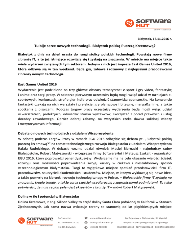Białystok, 18.11.2016 r. Tu bije serce nowych technologii. Białystok polską Puszczą Krzemową? Białystok z dnia na dzień urasta do rangi stolicy polskich technologii. Powstają nowe firmy z branży IT, a te już istniejące rozwijają się i zyskują na znaczeniu. W mieście ma miejsce także wiele wydarzeń związanych tym sektorem. Jednym z nich jest impreza East Games United 2016, która odbywa się w ten weekend. Będą gry, zabawa i rozmowy z najlepszymi pracodawcami z branży nowych technologii. East Games United 2016 Wydarzenie jest podzielone na trzy główne obszary tematyczne: e-sport i gry video, fantastykę i anime oraz targi pracy. W sektorze pierwszym uczestnicy będą mogli wziąć udział w turniejach esportowych, konkursach, strefie gier indie oraz odwiedzić stanowiska sponsorskie. Na konwencie fantastyki czekają na nich warsztaty i prelekcje, gry planszowe i bitewne, manga&anime, a także spotkania z pisarzami. Podczas targów pracy uczestnicy wydarzenia będą mogli wziąć udział w warsztatach, prelekcjach, odwiedzić stoiska wystawców, skorzystać z porad prawnych i usług doradcy zawodowego. Oprócz dobrej zabawy, na wszystkich czeka dawka solidnej wiedzy i merytorycznych informacji! Debata o nowych technologiach z udziałem Wiceprezydenta W sobotę podczas Targów Pracy w ramach EGU 2016 odbędzie się debata pt. „Białystok polską puszczą krzemową?” na temat technologicznego rozwoju Białegostoku z udziałem Wiceprezydenta Rafała Rudnickiego. W debacie wezmą udział również: Maciej Biernacki - najmłodszy radny Białegostoku, Robert Matyszewski - wiceprezes firmy SoftwareHut i Mateusz Szukajt - organizator EGU 2016, który poprowadzi panel dyskusyjny. Wydarzenie ma na celu ukazanie wielości ścieżek rozwoju oraz możliwości poprowadzenia swojej kariery w ciekawy i nieszablonowy sposób w technologicznym Białymstoku. Targi to wyjątkowe miejsce spotkań przedstawicieli firm IT, pracodawców, nauczycieli akademickich i studentów. Miejsce, w którym wykluwają się nowe idee, a także pomysły na kierunki rozwoju technologicznego w Polsce. – Białostockie firmy IT zyskują na znaczeniu, kreują trendy, a także coraz częściej współpracują z zagranicznymi podmiotami. To tylko potwierdza, że nasz region pełen jest ekspertów z branży IT – mówi Robert Matyszewski. Dolina w tle i potencjał w Białymstoku Dolina Krzemowa, z ang. Silicon Valley to część doliny Santa Clara położonej w Kalifornii w Stanach Zjednoczonych. Jak sama nazwa wskazuje tereny te stanowią od lat pięćdziesiątych miejsce SoftwareHut www.softwarehut.pl ul. Sienkiewicza 110 [email protected] 15-005 Białystok +48 602 700 009 Sąd Rejonowy w Białymstoku, XII Wydział Gospodarczy Krajowego Rejestru Sądowego KRS 0000565360 | NIP 9662098244 | REGON 361904992 nieprzerwanego rozwoju nowych technologii, głównie przemysłu komputerowego. To tutaj mieszczą się siedziby światowych gigantów technologicznych, w tym znajdujące się na liście „Fortune 1000” przedsiębiorstwa z branży high-tech m.in. Adobe Systems, Apple Inc., Facebook, Google czy Hewlett-Packard. Dolina Krzemowa powstała dzięki temu, że rząd amerykański po przystąpieniu USA do wojny rozpoczął finansowanie badań naukowych, które były przeprowadzane na uniwersytetach. Kończący uczelnie absolwenci byli namawiani do zakładania własnych przedsiębiorstw, produkujących sprzęt dla armii Stanów Zjednoczonych na bazie innowacyjnych rozwiązań wynalezionych podczas badań naukowych. W ten sposób wokół uniwersytetu Stanforda w Kalifornii rozwinęło się wiele technologicznych startupów, które funkcjonowały dzięki zleceniom rządowym. Technologiczne zagłębie rozwinęło się dzięki ścisłej współpracy przedsiębiorczych obywateli z administracją rządową i ośrodkami naukowobadawczymi. Teraz polską Doliną Krzemową staje się właśnie Białystok. W ostatnich latach powstaje tu wiele firm z branży IT, a do miasta przenoszą się także przedsiębiorstwa z całej Polski otwierając tutaj własne oddziały developerskie. Jest to niewątpliwie zasługa Politechniki Białostockiej i Uniwersytetu Białostockiego, które co roku wypuszczają na rynek pracy wielu uzdolnionych absolwentów, ale także fakt, że pod względem urzędowo - administracyjnym prowadzenie firmy w stolicy województwa podlaskiego jest łatwiejsze niż np. w Warszawie czy Krakowie. Firmy działające w Białymstoku stale się rozwijają i nieustannie przeprowadzają nabór nowych pracowników, co z kolei skłania studentów do pozostania w mieście i wykorzystania swojego potencjału w regionie. – Ofert pracy naprawdę nie brakuje. Swoich nowych pracowników wspieramy i szkolimy, a sektor nowych technologii to rozwój, nowe wyzwania i stabilna praca. Warto więc pomyśleć o swojej przyszłości i spróbować sił w branży IT – podsumowuje Robert Matyszewski. East Games United 2016 Data: 19-20 listopada 2016 r. od 10 do 18 Miejsce: Kampus Uniwersytecki w Białymstoku przy ul. Ciołkowskiego 1 Debata „Białystok polską Puszczą Krzemową?”: sobota, godz. 14:00, wydział Matematyczno – Informatyczny, Aula Panelowa 1 KONTAKT DO ORGANIZATORÓW: [email protected] KONTAKT DLA MEDIÓW: Paulina Fajtek [email protected] 22 544 05 12 SoftwareHut www.softwarehut.pl ul. Sienkiewicza 110 [email protected] 15-005 Białystok +48 602 700 009 Sąd Rejonowy w Białymstoku, XII Wydział Gospodarczy Krajowego Rejestru Sądowego KRS 0000565360 | NIP 9662098244 | REGON 361904992