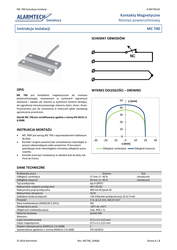 MC 740 Instrukcja instalacji 4-MC740-01 Kontakty Magnetyczne Montaż powierzchniowy Detektory Instrukcja instalacji MC 740 SCHEMAT OBWODÓW OPIS WYKRES ODLEGŁOŚCI – DREWNO MC 740 jest kontaktem magnetycznym do montażu powierzchniowego, stosowanym w systemach sygnalizacji włamania i napadu jak również w systemach kontroli dostępu, do sygnalizacji nieautoryzowanego otwarcia okien, drzwi i bram. Przeznaczony jest do stosowania w miejscach gdzie występują ograniczenia przestrzeni. 50 40 30 Wyrób MC 740 jest certyfikowany zgodnie z normą EN 50131-26:2008. 20 10 INSTRUKCJA MONTAŻU y [mm[ MC 740P jest wersją MC 740 z wyprowadzeniem kablowym do dołu. Kontakt i magnes powinny być zainstalowane równolegle w pozycji odpowiadającej sobie wzajemnie. Przesunięcie powodujące brak równoległości zmniejsza odległości pracy czujnika. Kontakt może być instalowany w układzie bok do boku lub front do frontu. 0 -30 -20 -10 0 x [mm] Odległość zamknięcia 10 20 30 Odległość otwarcia DANE TECHNICZNE Środowisko pracy Odległość zamknięcia Odległość otwarcia Typ przełącznika Maksymalne napięcie przełączalne Maksymalny prąd przełączalny Maksymalne obciążenie Zakładana liczba przełączeń Przewód Klasa środowiskowa (EN50130-5:2011) Temperatura pracy Wilgotność środowiska pracy Materiał obudowy Wymiary: Części kontaktronowej Części magnetycznej Stopień zabezpieczenia (EN50131-2-6:2008) Zatwierdzenie zgodności z normą EN50131-2-6:2008 © 2014 Alarmtech Drewno Stal 37 mm +/– 40 % niezalecane 44 mm +/– 40 % niezalecane typ A (SPST) 48 V DC/AC 400 mA DC/peak AC 10 W >20 milionów przełączeń przy 10 V/ 4 mA 2 m, ф 3,2 mm, 4x0,14 mm2 IIIA -40°C do +55°C max. 95% r. h. plastik ABS 57,5 x 5 x 13,5 mm 57,5 x 5 x 13,5 mm 2 ITR 14/2013 Rev. MC740_1440pl Strona 1 z 2 MC 740 Instrukcja instalacji 4-MC740-01 ZASADA DZIAŁANIA Kontakt magnetyczny MC 740 posiada dwie części: część z przełącznikiem kontaktronowym i część z magnesem. W pozycji neutralnej przełącznik kontaktronowy pozostaje zamknięty, pod wpływem sił pola magnetycznego współpracującego magnesu. W przypadku gdy współpracujący magnes jest oddalony od części kontaktowej, oddziaływanie pola magnetycznego na kontaktron zanika, powodując zmianę pozycji przełącznika z zamkniętej na otwartą. Otwarty kontaktron uruchamia przypisaną sygnalizację alarmową. Kontakty magnetyczne nie powinny być instalowane w pobliżu silnych pól magnetycznych. Ustawienia kontaktu, przy wyprowadzeniu kabla w dół, zapewniające maksymalne odległości pracy. MC 740P w ustawieniu front do frontu – wyjścia kablowe po tej samej stronie INSTALACJA Część kontaktowa czujnika powinna być zamontowana na nieruchomym elemencie monitorowanego obiektu (np. ościeżnicy drzwiowej, okiennej), magnes powinien być zainstalowany na ruchomej części (drzwi, okna). Część kontaktowa i magnes powinny być zainstalowane na ramie i ruchomym skrzydle monitorowanego obiektu (okna, drzwi itp.) równolegle, w pozycji odpowiadającej sobie wzajemnie. Przesunięcie, powodujące brak równoległości, zmniejsza odległości pracy czujnika. W zależności od wymogów, kontakt i magnes mogą być instalowane frontem do frontu lub bokiem do boku. Wersja MC 740P rozszerza zakres stosowania kontaktu. Aby uzyskać najbardziej adekwatną odległość montażu, należy zbliżyć część magnetyczną do części z przełącznikiem kontaktronowej aż do osiągnięcia dystansu sabotażu, po czym ponownie oddalić, do osiągnięcia minimalnej odległości zamknięcia. Po zakończeniu instalacji, należy użyć omomierza w celu sprawdzenia połączeń elektrycznych i przetestowania działania czujnika. Ostrzeżenie: zastosowanie nadmiernej siły na obudowy, w czasie montażu, może spowodować uszkodzenie szklanych części kontaktronów wewnętrznych czujnika. MC 740P w ustawieniu bok do boku – widok od dołu, wyjścia kablowe po przeciwnych stronach REZYSTORY (OPCJONALNIE) MC 740 jest dostępny w dwóch dodatkowych opcjach z wybraną wartością rezystorów: MC 740-R z rezystorem skonfigurowanym równolegle z kontaktronem i MC 740-2R z dwoma rezystorami w konfiguracji 2EOL (według schematów poniżej). MC740-R: KONFIGURACJA INSTALACJI Ustawienia kontaktu, przy wyprowadzeniu bocznym kabla, zapewniające maksymalne odległości pracy. MC 740 w ustawieniu front do frontu – wyjścia kablowe po tej samej stronie MC740-2R: MC 740 w ustawieniu bok do boku – widok od dołu, wyjścia kablowe po przeciwnych stronach Zastrzegamy sobie prawo do wprowadzania zmian bez uprzedzenia. © 2014 Alarmtech Rev. MC740_1440pl Strona 2 z 2