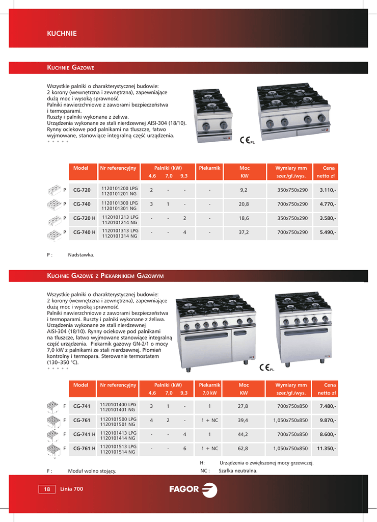 KUCHNIE Kuchnie Gazowe Wszystkie palniki o charakterystycznej budowie: 2 korony (wewnętrzna i zewnętrzna), zapewniające dużą moc i wysoką sprawność. Palniki nawierzchniowe z zaworami bezpieczeństwa i termoparami. Ruszty i palniki wykonane z żeliwa. Urządzenia wykonane ze stali nierdzewnej AISI-304 (18/10). Rynny ociekowe pod palnikami na tłuszcze, łatwo wyjmowane, stanowiące integralną część urządzenia. ••••• Model Nr referencyjny Piekarnik Moc Wymiary mm Cena 4,6 Palniki (kW) 7,0 9,3 KW szer./gł./wys. netto zł 350x750x290 3.110,- 700x750x290 4.770,- P 1120101200 LPG CG-720 2 - - - 9,2 P 1120101300 LPG CG-740 3 1 - - 20,8 P 1120101213 LPG CG-720 H - - 2 - 18,6 350x750x290 3.580,- P 1120101313 LPG CG-740 H - - 4 - 37,2 700x750x290 5.490,- P : 1120101201 NG 1120101301 NG 1120101214 NG 1120101314 NG Nadstawka. Kuchnie Gazowe z Piekarnikiem Gazowym Wszystkie palniki o charakterystycznej budowie: 2 korony (wewnętrzna i zewnętrzna), zapewniające dużą moc i wysoką sprawność. Palniki nawierzchniowe z zaworami bezpieczeństwa i termoparami. Ruszty i palniki wykonane z żeliwa. Urządzenia wykonane ze stali nierdzewnej AISI-304 (18/10). Rynny ociekowe pod palnikami na tłuszcze, łatwo wyjmowane stanowiące integralną część urządzenia. Piekarnik gazowy GN-2/1 o mocy 7,0 kW z palnikami ze stali nierdzewnej. Płomień kontrolny i termopara. Sterowanie termostatem (130–350 °C). ••••• Model Nr referencyjny Palniki (kW) Piekarnik Moc Wymiary mm Cena szer./gł./wys. netto zł 4,6 7,0 9,3 7,0 kW KW 27,8 F 1120101400 LPG CG-741 3 1 - 1 F 1120101500 LPG CG-761 4 2 - 1 + NC F 1120101413 LPG CG-741 H - - 4 F 1120101513 LPG CG-761 H - - 6 1120101401 NG 1120101501 NG 1120101414 NG 1120101514 NG F : 18 700x750x850 7.480,- 39,4 1,050x750x850 9.870,- 1 44,2 700x750x850 8.600,- 1 + NC 62,8 1,050x750x850 11.350,- H: Urządzenia o zwiększonej mocy grzewczej. Moduł wolno stojący. Linia 700 NC : Szafka neutralna. KUCHNIE Kuchnie gazowe z płytą grzewczą Wszystkie palniki o charakterystycznej budowie: 2 korony (wewnętrzna i zewnętrzna), zapewniające dużą moc i wysoką sprawność. Palniki nawierzchniowe z zaworami bezpieczeństwa i termoparami. Ruszty i palniki wykonane z żeliwa. Wymiary rusztu: 347 x 310 mm. Gładka, wierzchnia płyta grzewcza z żeliwa o wymiarach 347 x 620 mm o znacznej różnicy temperatur. Pod płytą znajduje się żeliwny palnik o mocy 4,65 kW otoczony wykładziną szamotową, która zapewnia doskonałe rozprowadzenie ciepła. Zbiornik tłuszczu pod żeliwną płytą grzewczą. Urządzenia wykonane ze stali nierdzewnej AISI-304 (18/10). ••••• Model Nr referencyjny Palniki (kW) 4,6 7,0 Płyta grzewcza Moc Wymiary mm Cena – położenie kW szer./gł./wys. netto zł P 1120101770 LPG CG-730-I 1 1 Lewa strona 16,2 700x750x290 5.650,- P 1120101760 LPG CG-730-D 1 1 Prawa strona 16,2 700x750x290 5.650,- P 1120101790 LPG CG-750 2 2 Centralnie 27,9 1.050x750x290 7.070,- P : 1120101771 NG 1120101761 NG 1120101791 NG Nadstawka. Kuchnie gazowe z płytą grzewczą i Piekarnikiem Wszystkie palniki o charakterystycznej budowie: 2 korony (wewnętrzna i zewnętrzna), zapewniające dużą moc i wysoką sprawność. Palniki nawierzchniowe z zaworami bezpieczeństwa i termoparami. Ruszty i palniki wykonane z żeliwa. Wymiary rusztu: 347 x 310 mm. Gładka, wierzchnia płyta grzewcza z żeliwa o wymiarach 347 x 620 mm o znacznej różnicy temperatur. Pod płytą znajduje się żeliwny palnik o mocy 4,65 kW otoczony wykładziną szamotową, która zapewnia doskonałe rozprowadzenie ciepła. Zbiornik tłuszczu pod żeliwną płytą grzewczą. Piekarnik GN-2/1 gazowy o mocy 7,0 kW z palnikami ze stali nierdzewnej. Temperatura kontrolowana termostatem w zakresie (130–350 °C). Urządzenia wykonane ze stali nierdzewnej AISI-304 (18/10). ••••• Model Nr referencyjny Palniki (kW) Płyta grzewcza Piekarnik 4,6 7,0 – położenie 7 kW Moc Wymiary mm KW szer./gł./wys. Cena netto zł F 1120101750 GPL CG-731-I 1 1 Lewa strona 1 23,3 700x750x850 8.500,- F 1120101740 GPL CG-731-D 1 1 Prawa strona 1 23,3 700x750x850 8.500,- F 1120101780 GPL CG-751 2 2 Centralnie 1 + NC 34,9 1.050x750x850 9.450,- F : 1120101751 GN 1120101741 GN 1120101781 GN Moduł wolno stojący. NC : Szafka neutralna. Linia 700 19 KUCHNIE Kuchnie gazowe z płytą grzewczą Jedna duża, gładka, wierzchnia płyta grzewcza wykonana z żeliwa o znacznej różnicy temperatur (na środku płyty do 400-5000C, przy brzegach około 150–200 °C). Pod płytą znajduje się wielopierścieniowy palnik o mocy 9,3 kW, otoczony wykładziną szamotową, która zapewnia doskonałe rozprowadzenie ciepła. Palniki z zaworami bezpieczeństwa i termoparami odpalane piezoelektrycznie. Rynny ociekowe. Urządzenia wykonane ze stali nierdzewnej AISI-304 (18/10). ••••• Model Nr referencyjny Piekarnik P 1120101600 LPG CG-710 - F 1120101700 LPG CG-711 1HG P : F : 1120101601 NG 1120101701 NG z Piekarnikiem Model Nr referencyjny neto zł 700x750x290 4.560,- 700x750x850 7.400,- HG : w 2/1- GN Piekarnik gazowy z rusztem GN 2/1 (650 x 520 mm) o mocy 7,0 kW. Sterowany termostatem w zakresie (130–350 0C). Stylu Angielskim Model CGB-761 ••••• Cena szer./gł./wys. 16,28 Wszystkie palniki o charakterystycznej budowie: 2 korony (wewnętrzna i zewnętrzna), zapewniające dużą moc i wysoką sprawność. Palniki nawierzchniowe z zaworami bezpieczeństwa i termoparami. Ruszty i palniki wykonane z żeliwa. Wymiary rusztu 850 x 530 mm. Gazowy piekarnik w „stylu angielskim” o wymiarach 860 x 570 x 410 mm o mocy 7,3 kW przeznaczony do pieczenia np. prosiaka w całości. Sterowany termostatem w zakresie (130–350 °C). Urządzenia wykonane ze stali nierdzewnej AISI-304 (18/10). Rynny ociekowe pod palnikami na tłuszcze, łatwo wyjmowane stanowiące integralną część urządzenia. Drzwi otwierane na boki. Wymiary mm kW 9,3 Nadstawka. Moduł wolno stojący. Kuchnie Gazowe Moc Palniki - (kW) 