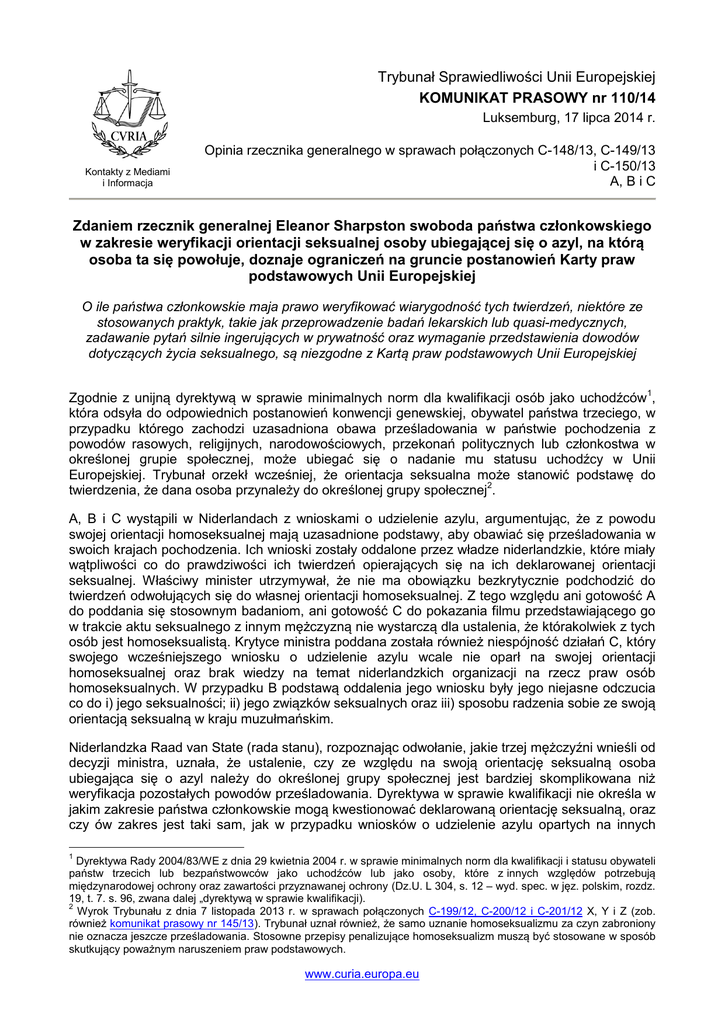 Trybunał Sprawiedliwości Unii Europejskiej KOMUNIKAT PRASOWY nr 110/14 Luksemburg, 17 lipca 2014 r. Kontakty z Mediami i Informacja Opinia rzecznika generalnego w sprawach połączonych C-148/13, C-149/13 i C-150/13 A, B i C Zdaniem rzecznik generalnej Eleanor Sharpston swoboda państwa członkowskiego w zakresie weryfikacji orientacji seksualnej osoby ubiegającej się o azyl, na którą osoba ta się powołuje, doznaje ograniczeń na gruncie postanowień Karty praw podstawowych Unii Europejskiej O ile państwa członkowskie maja prawo weryfikować wiarygodność tych twierdzeń, niektóre ze stosowanych praktyk, takie jak przeprowadzenie badań lekarskich lub quasi-medycznych, zadawanie pytań silnie ingerujących w prywatność oraz wymaganie przedstawienia dowodów dotyczących życia seksualnego, są niezgodne z Kartą praw podstawowych Unii Europejskiej Zgodnie z unijną dyrektywą w sprawie minimalnych norm dla kwalifikacji osób jako uchodźców1, która odsyła do odpowiednich postanowień konwencji genewskiej, obywatel państwa trzeciego, w przypadku którego zachodzi uzasadniona obawa prześladowania w państwie pochodzenia z powodów rasowych, religijnych, narodowościowych, przekonań politycznych lub członkostwa w określonej grupie społecznej, może ubiegać się o nadanie mu statusu uchodźcy w Unii Europejskiej. Trybunał orzekł wcześniej, że orientacja seksualna może stanowić podstawę do twierdzenia, że dana osoba przynależy do określonej grupy społecznej2. A, B i C wystąpili w Niderlandach z wnioskami o udzielenie azylu, argumentując, że z powodu swojej orientacji homoseksualnej mają uzasadnione podstawy, aby obawiać się prześladowania w swoich krajach pochodzenia. Ich wnioski zostały oddalone przez władze niderlandzkie, które miały wątpliwości co do prawdziwości ich twierdzeń opierających się na ich deklarowanej orientacji seksualnej. Właściwy minister utrzymywał, że nie ma obowiązku bezkrytycznie podchodzić do twierdzeń odwołujących się do własnej orientacji homoseksualnej. Z tego względu ani gotowość A do poddania się stosownym badaniom, ani gotowość C do pokazania filmu przedstawiającego go w trakcie aktu seksualnego z innym mężczyzną nie wystarczą dla ustalenia, że którakolwiek z tych osób jest homoseksualistą. Krytyce ministra poddana została również niespójność działań C, który swojego wcześniejszego wniosku o udzielenie azylu wcale nie oparł na swojej orientacji homoseksualnej oraz brak wiedzy na temat niderlandzkich organizacji na rzecz praw osób homoseksualnych. W przypadku B podstawą oddalenia jego wniosku były jego niejasne odczucia co do i) jego seksualności; ii) jego związków seksualnych oraz iii) sposobu radzenia sobie ze swoją orientacją seksualną w kraju muzułmańskim. Niderlandzka Raad van State (rada stanu), rozpoznając odwołanie, jakie trzej mężczyźni wnieśli od decyzji ministra, uznała, że ustalenie, czy ze względu na swoją orientację seksualną osoba ubiegająca się o azyl należy do określonej grupy społecznej jest bardziej skomplikowana niż weryfikacja pozostałych powodów prześladowania. Dyrektywa w sprawie kwalifikacji nie określa w jakim zakresie państwa członkowskie mogą kwestionować deklarowaną orientację seksualną, oraz czy ów zakres jest taki sam, jak w przypadku wniosków o udzielenie azylu opartych na innych 1 Dyrektywa Rady 2004/83/WE z dnia 29 kwietnia 2004 r. w sprawie minimalnych norm dla kwalifikacji i statusu obywateli państw trzecich lub bezpaństwowców jako uchodźców lub jako osoby, które z innych względów potrzebują międzynarodowej ochrony oraz zawartości przyznawanej ochrony (Dz.U. L 304, s. 12 – wyd. spec. w jęz. polskim, rozdz. 19, t. 7. s. 96, zwana dalej „dyrektywą w sprawie kwalifikacji). 2 Wyrok Trybunału z dnia 7 listopada 2013 r. w sprawach połączonych C-199/12, C-200/12 i C-201/12 X, Y i Z (zob. również komunikat prasowy nr 145/13). Trybunał uznał również, że samo uznanie homoseksualizmu za czyn zabroniony nie oznacza jeszcze prześladowania. Stosowne przepisy penalizujące homoseksualizm muszą być stosowane w sposób skutkujący poważnym naruszeniem praw podstawowych. www.curia.europa.eu podstawach. Raad van State zwróciła się wobec tego do Trybunału Sprawiedliwości o wyjaśnienie, czy prawo Unii wyznacza państwom członkowskim granice w odniesieniu do weryfikacji wiarygodności twierdzeń osoby ubiegającej się o udzielenie azylu, które swoje wnioski opierają na swojej deklarowanej orientacji seksualnej. W dzisiejszej opinii rzecznik generalna Eleanor Sharpston wskazała, że homoseksualizm nie jest uznawany za schorzenie, przy czym w braku stosownych dowodów (których w większości przypadków nie ma) nie można obiektywnie potwierdzić prawdziwości deklarowanej orientacji seksualnej. Autonomia osobista stanowi ważny element prawa do życia prywatnego chronionego na gruncie Karty praw podstawowych Unii Europejskiej i przejawia się w prawie każdego do określenia swojej orientacji seksualnej. Oznacza to, że orientacja seksualna, jaką deklaruje osoba ubiegająca się o azyl zawsze musi stanowić punkt wyjściowy każdej oceny. Jednakże dyrektywa w sprawie kwalifikacji nie pozbawia państw członkowskich prawa do weryfikacji tych deklaracji, tak aby zapewnić integralność systemu azylowego oraz umożliwić wykrywanie wniosków opartych na fałszywych podstawach w celu pomocy osobom, które rzeczywiście potrzebują ochrony. Oznacza to, że państwa członkowskie powinny mieć możliwość, w oparciu o dyrektywę, oceny twierdzeń odnoszących się do orientacji seksualnej ubiegającego się o azyl. Rzecznik generalna E. Sharpston podkreśliła, że osobom ubiegającym się o azyl nie można stawiać wymogów, które urągałyby ich godności lub integralności osobistej. Brak wyraźnych wskazówek w dyrektywie w sprawie metod weryfikacji przez państwa członkowskie w