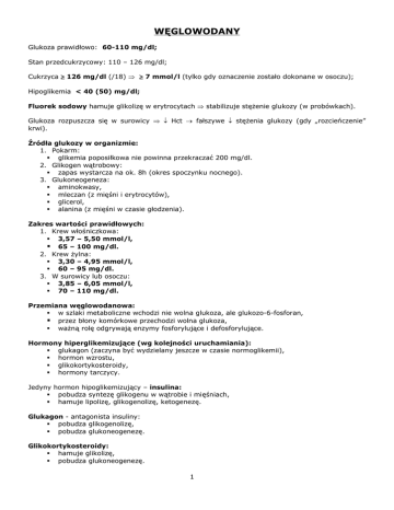 WĘGLOWODANY Glukoza prawidłowo: 60-110 mg/dl; Stan przedcukrzycowy: 110 – 126 mg/dl; Cukrzyca ≥ 126 mg/dl (/18) ⇒ ≥ 7 mmol/l (tylko gdy oznaczenie zostało dokonane w osoczu); Hipoglikemia < 40 (50) mg/dl; Fluorek sodowy hamuje glikolizę w erytrocytach ⇒ stabilizuje stężenie glukozy (w probówkach). Glukoza rozpuszcza się w surowicy ⇒ ↓ Hct → fałszywe ↓ stężenia glukozy (gdy „rozcieńczenie” krwi). Źródła glukozy w organizmie: 1. Pokarm: glikemia poposiłkowa nie powinna przekraczać 200 mg/dl. 2. Glikogen wątrobowy: zapas wystarcza na ok. 8h (okres spoczynku nocnego). 3. Glukoneogeneza: aminokwasy, mleczan (z mięśni i erytrocytów), glicerol, alanina (z mięśni w czasie głodzenia). Zakres wartości prawidłowych: 1. Krew włośniczkowa: 3,57 – 5,50 mmol/l, 65 – 100 mg/dl. 2. Krew żylna: 3,30 – 4,95 mmol/l, 60 – 95 mg/dl. 3. W surowicy lub osoczu: 3,85 – 6,05 mmol/l, 70 – 110 mg/dl. Przemiana węglowodanowa: w szlaki metaboliczne wchodzi nie wolna glukoza, ale glukozo-6-fosforan, przez błony komórkowe przechodzi wolna glukoza, ważną rolę odgrywają enzymy fosforylujące i defosforylujące. Hormony hiperglikemizujące (wg kolejności uruchamiania): glukagon (zaczyna być wydzielany jeszcze w czasie normoglikemii), hormon wzrostu, glikokortykosteroidy, hormony tarczycy. Jedyny hormon hipoglikemizujący – insulina: pobudza syntezę glikogenu w wątrobie i mięśniach, hamuje lipolizę, glikogenolizę, ketogenezę. Glukagon - antagonista insuliny: pobudza glikogenolizę, pobudza glukoneogenezę. Glikokortykosteroidy: hamuje glikolizę, pobudza glukoneogenezę. 1 Hormon wzrostu: hamuje pobieranie glukozy przez komórki mięśniowe. Definicja hipoglikemii: stężenie glukozy <40mg/dl (2,2mmol/l), objawy neuroglikopenii (niedobór glukozy w OUN): bóle głowy, stany lękowe, drgawki, drżenia głodowe, zaburzenia mowy i widzenia, aktyeacja układu współczulnego: tachykardia, wzrost ciśnienia, zlewne poty, szerokie źrenice, występowanie objawów zależy od stężenia glukozy we krwi i szybkości zmian glikemii w czasie. Hipoglikemia – przyczyny: przedawkowanie insuliny (najczęściej), bądź doustnych środków hipoglikemizujących, głodzenie, upośledzenie glukoneogenezy, nadmierne zużycie glukozy przez tkanki – nowotwory, utrata glukozy przez nerki, insulinoma (hiperinsulinizm pierwotny), niedoczynność nadnerczowa lub przysadkowa, niedobory hormonów hiperglikemizujących, znaczne uszkodzenie wątroby, zażywanie salicylanów, przewlekły alkoholizm, hipoglikemia czynnościowa (reaktywna, hiperinsulinizm wtórny), hipoglikemia fizjologiczna ⇒ niski poziom glikemii u noworodka (1,7 mmol/l ⇔ 30 mg/dl), który utrzymuje się do kilkunastu godzin, przełomy choroby Addisona, pozorna, towarzysząca znacznej leukocytozie (~ 20 000). Hipoglikemia na czczo: Hipoglikemia po posiłku Niedobór hormonów pobudzających Zespół poresekcyjny glukoneogenezę Upośledzenie czynności glukoneogenetycznej Wczesna faza cukrzycy typu 2 u osób otyłych wątroby Wrodzone defekty metaboliczne (choroba Wrodzone defekty metaboliczne (nietolerancja spichrzeniowa glikogenu, niedobór fruktozo –1,6- fruktozy, galaktozemia, nadwrażliwość na difosfatazy, glukozuria nocna) Znaczne niedożywienie Insulinoma Leki – doustne przeciwcukrzycowe, salicylany leucynę) Nadużycie alkoholu Czynnościowa, reaktywna hipoglikemia 2 Kliniczne i laboratoryjne objawy ketonowej kwasicy cukrzycowej Objawy kliniczne: pragnienie, poliuria z następczą oligurią, odwodnienie, niskie ciśnienie, tachykardia, obwodowa nwd krążenia, ketoza, hiperwentylacja, wymioty, bóle brzucha, zaburzenia świadomości, śpiączka. Objawy laboratoryjne: hiperglikemia, glukozuria, kwasica metaboliczna, ketonemia, uremia, hiperkalemia, hipertriglicerydemia, zagęszczanie krwi. Niedobór insuliny ↓ wykorzystanie glukozy ↑ glikogenoliza lipoliza glicerol FFA (wolne kwasy tłuszczowe) wątrobowe FFA ↑ glukoneogeneza utlenianie FFA ketogeneza hiperglikemia ketonemia glukozuria ketonuria diureza osmotyczna ketoza utrata H2O, Na+, K+ nudności, wymioty kwasica ketonowa ODWODNIENIE zagęszczenie krwi hipowolemia wstrząs mocznica przednerkowa kwasica ↑ lepkości krwi zakrzepy 3 kwasica mleczanowa Hiperglikemia: wzrost stężenia glukozy we krwi pobranej na czczo powyżej 7 mmol/l = 126 mg/dl. Przyczyny hiperglikemii: cukrzyca, akromegalia → hipersekrecja hormonu wzrostu, zespół / choroba Cushinga → hipersekrecja ACTH lub ↑ wydzielania glikokortykosteroidów, wylewy i urazy → mniejsze zużycie glukozy, ↑ katecholamin, ↑ kortyzolu, wstrząs → ↑ katecholamin, ↑ kortyzolu, phaeochromocytoma → ↑ katecholamin. CUKRZYCA Grupa chorób metabolicznych charakteryzujących się hiperglikemią wynikającą z defektu wydzielania insuliny i/lub jej działania. Podział cukrzycy: I. Cukrzyca typu 1 1. Autoimmunologiczna – obecność autoprzeciwciał: ICAs – przeciw komórkom wysp trzustkowych, IAAs – przeciw insulinie, GAD65 – przeciw dekarboksylazie kwasu glutaminowego, IA-2 i IA-2β - przeciw fosfatazom tyrozyny, choroba powiązana z układem HLA (gen DQA i B oraz DRB). 2. Idiopatyczna → skłonność do kwasicy ketonowej, niekiedy trwała insulinopenia; brak związku z układem HLA. II. Cukrzyca typu 2 insulinooporność i zwykle względny (rzadziej niż całkowity) niedobór insuliny, często nie wymaga leczenia insuliną, brak podłoża immunologicznego, rozwija się powoli, kwasica ketonowa rzadko występuje. III. Cukrzyca ciężarnych GDM to każdego stopnia nietolerancja glukozy rozpoczynająca się lub po raz pierwszy rozpoznana w czasie ciąży. IV. Inne rodzaje cukrzycy defekty genetyczne komórek β (dziedziczone autosomalnie dominująco), defekty genetyczne w wydzielaniu insuliny (mutacje receptora insulinowego), schorzenia zewnątrzwydzielniczej części trzustki (zapalenie, uraz, rak, usunięcie), endokrynopatie (akromegalia, choroba Cushinga