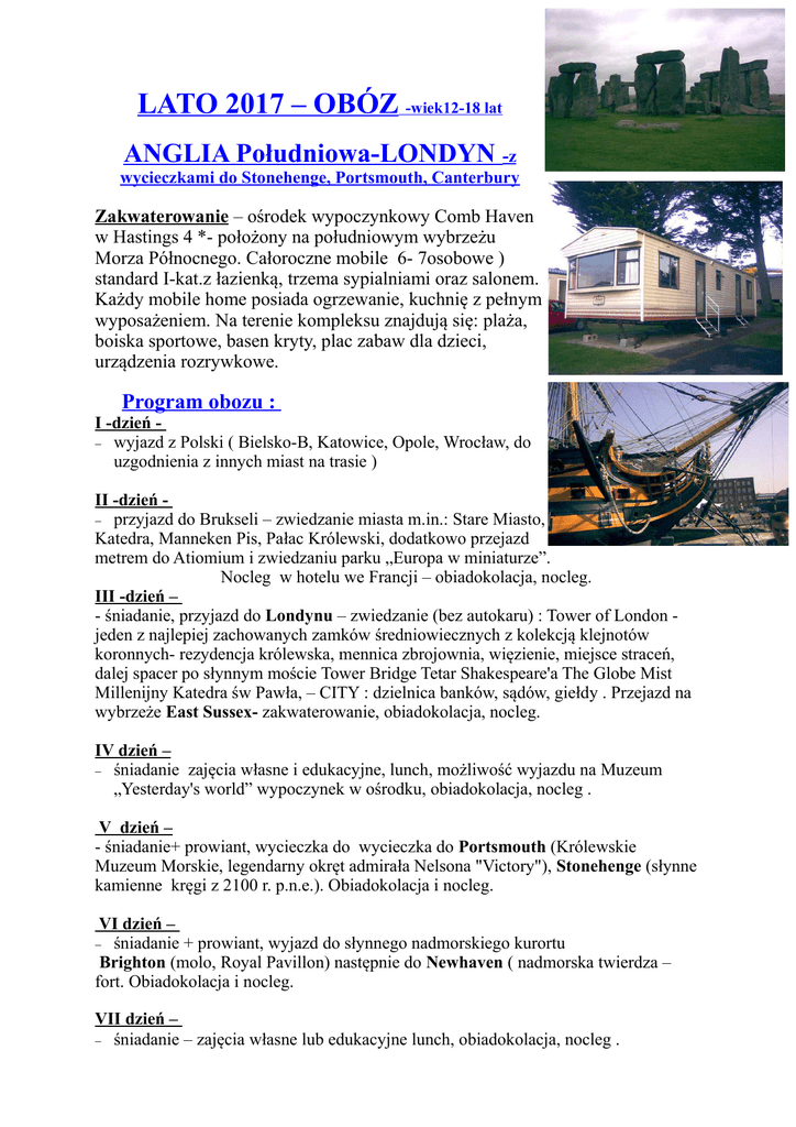 LATO 2017 – OBÓZ -wiek12-18 lat ANGLIA Południowa-LONDYN -z wycieczkami do Stonehenge, Portsmouth, Canterbury Zakwaterowanie – ośrodek wypoczynkowy Comb Haven w Hastings 4 *- położony na południowym wybrzeżu Morza Północnego. Całoroczne mobile 6- 7osobowe ) standard I-kat.z łazienką, trzema sypialniami oraz salonem. Każdy mobile home posiada ogrzewanie, kuchnię z pełnym wyposażeniem. Na terenie kompleksu znajdują się: plaża, boiska sportowe, basen kryty, plac zabaw dla dzieci, urządzenia rozrywkowe. Program obozu : I -dzień wyjazd z Polski ( Bielsko-B, Katowice, Opole, Wrocław, do uzgodnienia z innych miast na trasie ) II -dzień przyjazd do Brukseli – zwiedzanie miasta m.in.: Stare Miasto, Katedra, Manneken Pis, Pałac Królewski, dodatkowo przejazd metrem do Atiomium i zwiedzaniu parku „Europa w miniaturze”. Nocleg w hotelu we Francji – obiadokolacja, nocleg. III -dzień – - śniadanie, przyjazd do Londynu – zwiedzanie (bez autokaru) : Tower of London jeden z najlepiej zachowanych zamków średniowiecznych z kolekcją klejnotów koronnych- rezydencja królewska, mennica zbrojownia, więzienie, miejsce straceń, dalej spacer po słynnym moście Tower Bridge Tetar Shakespeare'a The Globe Mist Millenijny Katedra św Pawła, – CITY : dzielnica banków, sądów, giełdy . Przejazd na wybrzeże East Sussex- zakwaterowanie, obiadokolacja, nocleg. IV dzień – śniadanie zajęcia własne i edukacyjne, lunch, możliwość wyjazdu na Muzeum „Yesterday's world” wypoczynek w ośrodku, obiadokolacja, nocleg . V dzień – - śniadanie+ prowiant, wycieczka do wycieczka do Portsmouth (Królewskie Muzeum Morskie, legendarny okręt admirała Nelsona "Victory"), Stonehenge (słynne kamienne kręgi z 2100 r. p.n.e.). Obiadokolacja i nocleg. VI dzień – śniadanie + prowiant, wyjazd do słynnego nadmorskiego kurortu Brighton (molo, Royal Pavillon) następnie do Newhaven ( nadmorska twierdza – fort. Obiadokolacja i nocleg. VII dzień – śniadanie – zajęcia własne lub edukacyjne lunch, obiadokolacja, nocleg . VIII dzień – śniadanie+ prowiant, wycieczka do Canterbury (Katedra - siedziba Arcybiuskupa) oraz Dover (zamek, klify kredowe) - powrót do Hastings na obiadokolację i nocleg. IX dzień – śniadanie – zajęcia własne i edukacyjne, lunch, obiadokolacja, nocleg . X dzień – śniadanie + obfity prowiant, wyjazd do Londynu, cd zwiedzania : British Museum, Parlament, Big Ben,Westminster Abbey, Pałac Buckingham, słynna aleja Whitehall, przy której mieszczą się niemal wszystkie najważniejsze instytucje rządowe kraju, m.in. Downing Street, następnie Trafalgar Square z Kolumną Nelsona. Wieczorem wyjazd do Polski . XI dzień powrót do Polski w późnych godzinach wieczornych Transport - autokar lux Ubezpieczenie - Gotaher – NNW (do 10.000 -plz) i KL (do 40.000 -plz) Terminy- 11 dniowe: czerwiec, lipiec, sierpień do uzgodnienia CENA = 2.300- zł/os Cena obejmuje : - przejazd autokarem Lux razem z kosztami Eurotunelu lub promu - 8 noclegów, 1 w hotelu we Francji i 7 noclegów w Anglii w Centrum Haven - wyżywienie 3 x dziennie : śniadanie+ prowiant ( uczestnicy przygotowują sobie samodzielnie- z udostępnionego bufetu lub lunch = zupa + owoc lub baton lub gorące danie ) + obiadokolacje – kuchnia polska samoobsługowa wg. programu – prowiant na drogę do PL - opiekę wychowawczą oraz pilota na całą trasę ( nie oprowadza w miejscach zastrzeżonych dla lokalnych przewodników ) oraz opiekę 3 wychowawców - ubezpieczenie TU Gothaer NNW( do 10.000 zł) i KL(do 40.000 zł) - wycieczki w cenie imprezy (bez kosztów wstępu do zwiedzanych obiektów)Londyn, Stonehenge, Portsmouth, Brighton,Dover ,Canterbury. Cena nie obejmuje kosztów: - biletów wstępu do zwiedzanych obiektów ok. 90 GBP/os . - dla zainteresowanych koszty zajęć edukacyjnych w szkle językowej : 10 GBP/os/ 2 lekcje (w przypadku większej liczby zajęć językowych cena do uzgodnienia ) -dodatkowy wyjazd do Londynu - dopłata 50-zł/os. ORGANIZATOR : Biuro podróży Polan Travel Bielsko-Biała e-mail : tel 33 81 19 550 [email protected] tel 502 351 876 www.polan-travel.com.pl