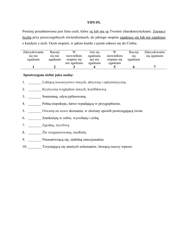TIPI-PL Poniżej przedstawiona jest lista cech, które są lub nie są Twoimi charakterystykami. Zaznacz liczbą przy poszczególnych stwierdzeniach, do jakiego stopnia zgadzasz się lub nie zgadzasz z każdym z nich. Oceń stopień, w jakim każde z pytań odnosi się do Ciebie. Zdecydowanie się nie zgadzam Raczej się nie zgadzam W niewielkim stopniu się nie zgadzam Ani się zgadzam, ani nie zgadzam W niewielkim stopniu się zgadzam Raczej się zgadzam Zdecydowanie się zgadzam 1 2 3 4 5 6 7 Spostrzegam siebie jako osobę: 1. _______ Lubiącą towarzystwo innych, aktywną i optymistyczną. 2. _______ Krytyczną względem innych, konfliktową. 3. _______ Sumienną, zdyscyplinowaną. 4. _______ Pełną niepokoju, łatwo wpadającą w przygnębienie. 5. _______ Otwartą na nowe doznania, w złożony sposób postrzegającą świat. 6. _______ Zamkniętą w sobie, wycofaną i cichą. 7. _______ Zgodną, życzliwą. 8. _______ Źle zorganizowaną, niedbałą. 9. _______ Niemartwiącą się, stabilną emocjonalnie. 10. _______ Trzymającą się utartych schematów, biorącą rzeczy wprost.