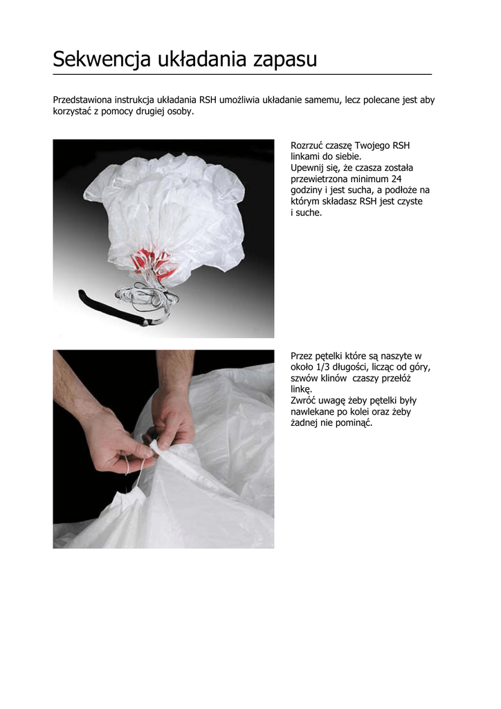 Sekwencja układania zapasu Przedstawiona instrukcja układania RSH umożliwia układanie samemu, lecz polecane jest aby korzystać z pomocy drugiej osoby. Rozrzuć czaszę Twojego RSH linkami do siebie. Upewnij się, że czasza została przewietrzona minimum 24 godziny i jest sucha, a podłoże na którym składasz RSH jest czyste i suche. Przez pętelki które są naszyte w około 1/3 długości, licząc od góry, szwów klinów czaszy przełóż linkę. Zwróć uwagę żeby pętelki były nawlekane po kolei oraz żeby żadnej nie pominąć. Sprawdź czy wszystkie pętelki są nawleczone na linkę. Zwiąż końce linki. Sprawdź jeszcze raz czy wszystkie pętelki są założone na linkę i przymocuj łącznik z taśmy (do którego zamontowane są linki RSH) do stabilnego punktu na podłożu na którym składasz swój RSH Naciągnij linki i całą czaszę trzymając za pętle i podnieś na wysokość wzroku. Uporządkuj kliny RSH ,zaczynając od dowolnego miejsca , wkładając po kolei głęboko rękę między tasiemki, napinając całe bryty czaszy w dół, strzepując tak aby poszczególne kliny na całej długości układały się pionowo. Zwróć uwagę żeby każdy klin był osobno i kolejno jeden po drugim. Szczyt czaszy powinien wyglądać tak jak na zdjęciu, a cala czasza powinna być ułożona i wisieć w pionie jak „kartki w książce”. Połóż czaszę na jednym z boków, pamiętając o tym żeby utrzymywać ja cały czas w stanie napiętym. Przymocuj pętle ze sznurka do drugiego stałego punktu na podłożu, na którym układasz (może do być np. obciążnik). Zacznij po kolei przekładać kliny odliczając ich połowę (jeśli będzie nieparzysta liczba klinów, po jednej stronie będzie o jeden więcej). Zwracaj uwagę na to, aby część czaszy od strony linek była dokładnie włożona w część górną (to jest czasza podwójna i posiada szczelinę pierścieniową) staraj się nie wyciągać nadmiernie w bok szwów głównych (to te do których są przyszyte tasiemki oraz linki), a obrzeże czaszy od strony linek było ułożone równo i starannie. RSH Dynamic Sport posiada unikalny system przyspieszania i porządkowania otwarcia trójkątne elementy profilujące obrzeże czaszy i ustawiające je pod kątem do napływających strug powietrza. Zwróć uwagę na poprawne ich ułożenie jeden na drugim. Linka centralna (grubsza, w kolorze czarnym) powinna być wyciągnięta z pomiędzy klinów i linek nośnych i ułożona pośrodku. Sprawdź czy linki nośne są uporządkowane i naprężone i czy dzielą się na stronę lewa i prawą. Czasza po ułożeniu powinna wyglądać jak na zdjęciu. Następnie zbierz linki lewej i prawej strony do siebie , tworząc pojedyncza grupę. Złóż jedną stronę czaszy w sposób przedstawiony na zdjęciu. 2/3 czaszy z lewej strony (około 10 cm przed linkami) należy złożyć na drugą stronę i 1/3 odłożyć z powrotem. Zwróć uwagę na prawidłowość złożenia. Lewą ręka chwyć całość po prawej stronie, zwracając uwagę aby dobrze uchwycić wszystkie kliny, zarówno te złożone jak i te pod spodem, które złożone jeszcze nie są, a następnie lekko unieś do góry, aby nie zburzyć ułożonej tkaniny. Chwyć prawą ręka w połowie pozostałego niezłożonego materiału (brytów) licząc od prawej krawędzi złożenia i podsuń prawą część pod spód aby uzyskać efekt lustrzany od tego który masz na wierzchu. Sposób ułożenia przedstawia zdjęcie, zwróć uwagę na małe kartoniki, które zostały włożone w miejsca zagięć lewej i prawej strony, aby dokładniej pokazać sposób i miejsca, w których czasza została złożona (oczywiście kartoniki zostały umieszczone poglądowo i nie należy ich używać przy układaniu czaszy). Taki sposób gwarantuje symetryczne, szybkie i pewne otwarcie się RSH bez efektu „wleczenia” za sobą czaszy, której wszystkie bryty są ułożone np. po jednej stronie linek. Wyjmij linkę, którą były związane pętelki na szczycie czaszy. Zwróć uwagę, aby ułożenie klinów na szczycie czaszy było prawidłowe. Przygotuj osłonkę i ułóż ja pętlą zamykającą w stronę linek. Rozłóż wyłogi osłonki na zewnątrz. Podnieś czaszę, wsuń pod nią osłonkę, odczep łącznik z taśmy od mocowania na podłożu. Używając dwóch listew bądź rurek, bądź też przedramion, zacznij układać czaszę w osłonce w „harmonijkę”, w taki sposób aby szerokość pojedynczego złożenia odpowiadała szerokości osłonki. Poleca się listwy lub rurki ze względu na fakt, iż tkanina ma tendencję do „przyklejania się” do przedramion i dłoni co utrudnia układanie. Układaj czaszę w osłonce zwracając uwagę na odpowiednią szerokość złożeń. Lekko ugnieć czaszę w osłonce po każdorazowym złożeniu. Układaj czaszę w osłonce w taki sposób aby ostatnie złożenie ( obrzeże) było na samej górze na środku układu. Lekko ugnieć czaszę dłońmi z góry, uformuj i przygotuj do tego aby podczas wyciągania wyłogów osłonki nie zburzyć ułożenia. Zbierz około połowę długości linek w cztery ósemkowe sploty na szerokość równą szerokości osłonki. Powinieneś w ten sposób zebrać około połowy długości linek. Należy podciągać w swoim kierunku linki, nie przemieszczać się po podłożu z czaszą. Zbierz wploty po dwa na raz i załóż na końcówki gumowe pętle. Powyciągaj wyłogi osłonki i połóż wploty linek na złożonej czaszy przed obrzeżem. Przełóż pętle zamykającą osłonkę przez oczka na wyłogach. Zdjęcia pokazują prawidłowość ułożenia linek i kolejność zamykania wyłogów osłonki. Przełóż pętlę zamykającą osłonki przez oczko w ostatnim wyłogu i zamknij przekładając pojedynczym wplotem linek. Średnica wewnętrzna oczka wplotu zamykającego nie powinna być większa niż „na jeden palec”. Sprawdź lekko pociągając do góry za linki czy wplot zaczyna się wysuwać z pętli zamykają