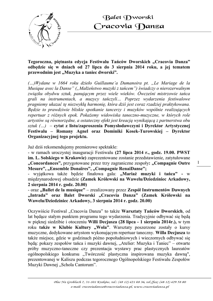 Tegoroczna, piętnasta edycja Festiwalu Tańców Dworskich „Cracovia Danza” odbędzie się w dniach od 27 lipca do 3 sierpnia 2014 roku, a jej tematem przewodnim jest „Muzyka a taniec dworski”. (…)Wydane w 1664 roku dzieło Guillaume’a Dumanoira pt. „Le Mariage de la Musique avec la Danse” („Małżeństwo muzyki z tańcem”) świadczy o nierozerwalnym związku obydwu sztuk, panującym przez wiele wieków. Ówcześni mistrzowie tańca grali na instrumentach, a muzycy tańczyli… Poprzez wydarzenia festiwalowe pragniemy ukazać tę niezwykłą harmonię, która dziś jest coraz rzadziej praktykowana. Będzie to prawdziwie bliskie spotkanie tancerzy i muzyków wspólnie realizujących repertuar z różnych epok. Pokażemy widowiska taneczno-muzyczne, w których role artystów są równorzędne, a ostateczny efekt jest kreacją wynikającą z partnerstwa obu sztuk (…) – cytat z listu/zaproszenia Pomysłodawczyni i Dyrektor Artystycznej Festiwalu – Romany Agnel oraz Dominiki Kosek-Turowskiej – Dyrektor Organizacyjnej tego projektu. Już dziś rekomendujemy premierowe spektakle: - w ramach uroczystej inauguracji Festiwalu (27 lipca 2014 r., godz. 19.00. PWST im. L. Solskiego w Krakowie) zaprezentowane zostanie przedstawienie, zatytułowane „Concordances”, przygotowane przez trzy zagraniczne zespoły: „Compagnie Outre Mesure”, „Ensemble Donaïres”, „Compagnie RenaiDanse”; - wyjątkowa także będzie finałowa gala: „Mariaż muzyki i tańca” - w międzynarodowej obsadzie (Zamek Królewski na Wawelu/Dziedziniec Arkadowy, 2 sierpnia 2014 r. godz. 20.00) - oraz „Ballet de la musique” – zrealizowany przez Zespół Instrumentów Dawnych „Intrada” oraz Balet Dworski „Cracovia Danza” (Zamek Królewski na Wawelu/Dziedziniec Arkadowy, 3 sierpnia 2014 r. godz. 20.00) Oczywiście Festiwal „Cracovia Danza” to także Warsztaty Tańców Dworskich, od lat będące stałym punktem programu tego wydarzenia. Tradycyjnie odbywać się będą w pięknej siedzibie i otoczeniu Willi Decjusza (28 lipca - 1 sierpnia 2014r.), w tym roku także w Klubie Kultury „Wola”. Warsztaty poszerzone zostały o kursy muzyczne, dedykowane artystom wykonującym repertuar taneczny. Willa Decjusza to także miejsce, gdzie w godzinach późno popołudniowych i wieczornych odbywać się będą: pokazy zespołów tańca i muzyki dawnej, „Atelier: Muzyka i Taniec” – otwarte próby muzyczno-taneczne czy prezentacja wystawy prac plastycznych laureatów ogólnopolskiego konkursu „Twórczość plastyczna inspirowana muzyka dawną", prezentowanej w Kaliszu podczas tegorocznego Ogólnopolskiego Festiwalu Zespołów Muzyki Dawnej „Schola Cantorum”. 1 Finał Festiwalu zaplanowano na pierwszy weekend sierpnia: 2 i 3 sierpnia 2014r. W tych dniach - obok ww. wieczornych spektakli premierowych prezentowanych na Wzgórzu Wawelskim - od godz. 11.00 odbywać się będą prezentacje w wykonaniu zespołów tańców historycznych oraz zaproszonych gości na Zamku Królewskim na Wawelu (Dziedziniec Arkadowy) oraz w Pałacu Biskupa Erazma Ciołka – Oddziale Muzeum Narodowego w Krakowie. Program* Festiwalu: 27 LIPCA 2014, NIEDZIELA Scena im. S. Wyspiańskiego PWST im. L. Solskiego w Krakowie 19.00 Spektakl inauguracyjny „CONCORDANCES” - premiera „Compagnie Outre Mesure”, „Ensemble Donaïres", „Compagnie RenaiDanse” Ideą spektaklu „Concordances” jest przedstawienie harmonii muzyki i tańca. Głównym motywem widowiska są podróże. Artyści odwiedzą królewskie dwory, miejskie place i sale taneczne szesnasto- i siedemnastowiecznych Włoch, Francji i Hiszpanii, m.in. Palazzo Schifanoia w Ferrarze, dwór Małgorzaty Burgundzkiej, Sewillę czy słynną Galerię Zwierciadlaną w Pałacu Wersalskim. Udamy się z nimi także do Florencji, założymy maski, by bez skrępowania mówić o miłości. Twórcy zaprezentują choreografie ówczesnych mistrzów tańca oraz własne interpretacje muzyki z dawnych epok. Zobaczymy m.in. kuranta, spagnolettę, passamezzo, sarabandę, bourrée. Widowisko „Concordances” będzie artystyczną konwersacją, prezentującą bogactwo muzyczne, choreograficzne i poetyckie minionych wieków. Koncepcja: Véronique Daniels, Ana Yepes, Robin Joly Choreografie tańców włoskich z XV i XVI wieku: Véronique Daniels Choreografie francuskich tańców renesansowych: Robin Joly Chorografie tańców francuskich oraz hiszpańskich z XVII i XVIII wieku: Ana Yepes Opracowanie muzyczne: Pascale Boquet Kierownictwo sceniczne: Ana Yepes Reżyseria światła: Luc Quaglia Kostiumy: Louise-Alice Véret Realizacja kostiumów: Nadia Boissard, Louise-Alice Véret Występują Muzycy z „Compagnie Outre Mesure”: Pascale Boquet, Anne Dumont, Robin Joly, Gwinnevire Quenel, Michèle Vandenbroucque oraz Tancerze z „Compagnie Outre Mesure”, „Compagnie RenaiDanse”, „ Ensemble Donaïres”: Jean-Marie Belmont, Nadia Boissard, Olivier Collin, Véronique Daniels, Gloria Giordano, Robin Joly, Sarasa Matsumoto, Anna Romani, Ana Yepes 2 Bezpłatne wejściówki na spektakl „CONCORDANCES” można odebrać w biurze Baletu Dworskiego Cracovia Danza (pl. Na Groblach 7, II piętro) po wcześniejszej rezerwacji telefonicznej (12) 421 08 36 lub mailowej: cracoviadanza@cracoviadanza pl od dnia 21.07.2014r. 28 LIPCA 2014, PONIEDZIAŁEK Willa Decjusza 9. 00 -18. 00 Warsztaty tańców dworskich i muzyczne** 18.30 Pokaz „Letnie igraszki i uczta u księcia Sułkowskiego” / Zespół Tańca Dworskiego Zamku Rydzyńskiego „Corona Florum” Koncert Le petit Velours - muzyka i poezja renesansu/Robin Joly z „Compagnie Outre Mesure” - „Atelier: Muzyka i Taniec” – otwarte próby muzyczno-taneczne 29 LIPCA 2014, WTOREK Willa Decjusza 900-1800 Warsztaty tańców dworskich i muzyczne 18.30 Bal Historyczny „Cracovia Danza” 30 LIPCA 2014, ŚRODA Willa Decjusza 9.00-18.00 Warsztaty tańców dworskich i muzyczne 18.30 Pokaz „Pieśń świętojańska o sobótce