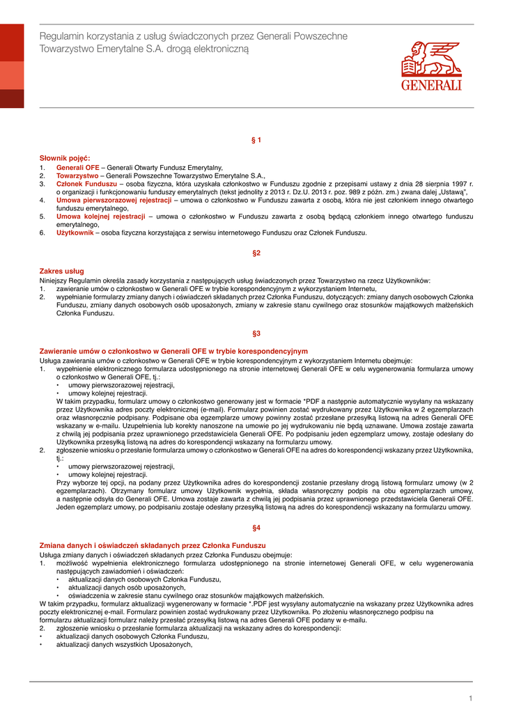 Regulamin korzystania z usług świadczonych przez Generali Powszechne Towarzystwo Emerytalne S.A. drogą elektroniczną §1 Słownik pojęć: 1. Generali OFE – Generali Otwarty Fundusz Emerytalny, 2. Towarzystwo – Generali Powszechne Towarzystwo Emerytalne S.A., 3. Członek Funduszu – osoba fizyczna, która uzyskała członkostwo w Funduszu zgodnie z przepisami ustawy z dnia 28 sierpnia 1997 r. o organizacji i funkcjonowaniu funduszy emerytalnych (tekst jednolity z 2013 r. Dz.U. 2013 r. poz. 989 z późn. zm.) zwana dalej „Ustawą”, 4. Umowa pierwszorazowej rejestracji – umowa o członkostwo w Funduszu zawarta z osobą, która nie jest członkiem innego otwartego funduszu emerytalnego, 5. Umowa kolejnej rejestracji – umowa o członkostwo w Funduszu zawarta z osobą będącą członkiem innego otwartego funduszu emerytalnego, 6. Użytkownik – osoba fizyczna korzystająca z serwisu internetowego Funduszu oraz Członek Funduszu. §2 Zakres usług Niniejszy Regulamin określa zasady korzystania z następujących usług świadczonych przez Towarzystwo na rzecz Użytkowników: 1. zawieranie umów o członkostwo w Generali OFE w trybie korespondencyjnym z wykorzystaniem Internetu, 2.wypełnianie formularzy zmiany danych i oświadczeń składanych przez Członka Funduszu, dotyczących: zmiany danych osobowych Członka Funduszu, zmiany danych osobowych osób uposażonych, zmiany w zakresie stanu cywilnego oraz stosunków majątkowych małżeńskich Członka Funduszu. §3 Zawieranie umów o członkostwo w Generali OFE w trybie korespondencyjnym Usługa zawierania umów o członkostwo w Generali OFE w trybie korespondencyjnym z wykorzystaniem Internetu obejmuje: 1. wypełnienie elektronicznego formularza udostępnionego na stronie internetowej Generali OFE w celu wygenerowania formularza umowy o członkostwo w Generali OFE, tj.: • umowy pierwszorazowej rejestracji, • umowy kolejnej rejestracji. W takim przypadku, formularz umowy o członkostwo generowany jest w formacie *PDF a następnie automatycznie wysyłany na wskazany przez Użytkownika adres poczty elektronicznej (e-mail). Formularz powinien zostać wydrukowany przez Użytkownika w 2 egzemplarzach oraz własnoręcznie podpisany. Podpisane oba egzemplarze umowy powinny zostać przesłane przesyłką listową na adres Generali OFE wskazany w e-mailu. Uzupełnienia lub korekty nanoszone na umowie po jej wydrukowaniu nie będą uznawane. Umowa zostaje zawarta z chwilą jej podpisania przez uprawnionego przedstawiciela Generali OFE. Po podpisaniu jeden egzemplarz umowy, zostaje odesłany do Użytkownika przesyłką listową na adres do korespondencji wskazany na formularzu umowy. 2.zgłoszenie wniosku o przesłanie formularza umowy o członkostwo w Generali OFE na adres do korespondencji wskazany przez Użytkownika, tj.: • umowy pierwszorazowej rejestracji, • umowy kolejnej rejestracji. Przy wyborze tej opcji, na podany przez Użytkownika adres do korespondencji zostanie przesłany drogą listową formularz umowy (w 2 egzemplarzach). Otrzymany formularz umowy Użytkownik wypełnia, składa własnoręczny podpis na obu egzemplarzach umowy, a następnie odsyła do Generali OFE. Umowa zostaje zawarta z chwilą jej podpisania przez uprawnionego przedstawiciela Generali OFE. Jeden egzemplarz umowy, po podpisaniu zostaje odesłany przesyłką listową na adres do korespondencji wskazany na formularzu umowy. §4 Zmiana danych i oświadczeń składanych przez Członka Funduszu Usługa zmiany danych i oświadczeń składanych przez Członka Funduszu obejmuje: 1. możliwość wypełnienia elektronicznego formularza udostępnionego na stronie internetowej Generali OFE, w celu wygenerowania następujących zawiadomień i oświadczeń: • aktualizacji danych osobowych Członka Funduszu, • aktualizacji danych osób uposażonych, • oświadczenia w zakresie stanu cywilnego oraz stosunków majątkowych małżeńskich. W takim przypadku, formularz aktualizacji wygenerowany w formacie *.PDF jest wysyłany automatycznie na wskazany przez Użytkownika adres poczty elektronicznej e-mail. Formularz powinien zostać wydrukowany przez Użytkownika. Po złożeniu własnoręcznego podpisu na formularzu aktualizacji formularz należy przesłać przesyłką listową na adres Generali OFE podany w e-mailu. 2. zgłoszenie wniosku o przesłanie formularza aktualizacji na wskazany adres do korespondencji: • aktualizacji danych osobowych Członka Funduszu, • aktualizacji danych wszystkich Uposażonych, 1 Generali Powszechne Towarzystwo Emerytalne S.A. – Regulamin świadczenia usług drogą elektroniczną • oświadczenia w zakresie stanu cywilnego oraz stosunków majątkowych małżeńskich. Przy wyborze tej opcji, zgłoszenie jest rejestrowane na rachunku Członka Funduszu. Formularz aktualizacji jest wysyłany przesyłką listową na wskazany przez Członka Funduszu adres do korespondencji. Formularz należy wypełnić, złożyć własnoręczny podpis i odesłać na adres Generali OFE podany w korespondencji. §5 Warunki świadczenia usługi 1. Usługi są świadczone bezpłatnie. 2. Usługi są świadczone 7 dni w tygodniu oraz są dostępne przez całą dobę. 3. Zakazane jest dostarczanie przez Użytkownika treści o charakterze bezprawnym. 4. Fundusz nie ponosi odpowiedzialności za przesłanie formularza umowy o członkostwo w Generali OFE lub formularzy zawiadomień i oświadczeń wypełnianych na stronie internetowej Generali OFE na nieaktualny adres e-mail, w sytuacji podania (wpisania) przez Użytkownika tego adresu przy wypełnianiu formularzy na stronie internetowej. §6 Reklamacje 1.Członek Funduszu może składać w każdym czasie zastrzeżenia dotyczące usług świadczonych przez Fundusz, w tym skargi i zażalenia („reklamacje”). 2. Reklamacje mogą być składane: • pisemnie przesyłką pocztową na adres Funduszu: Generali Otwarty Fundusz Emerytalny, ul. Postępu 15 B, 02-676 Warszawa, • telefonicznie pod numerem 913
