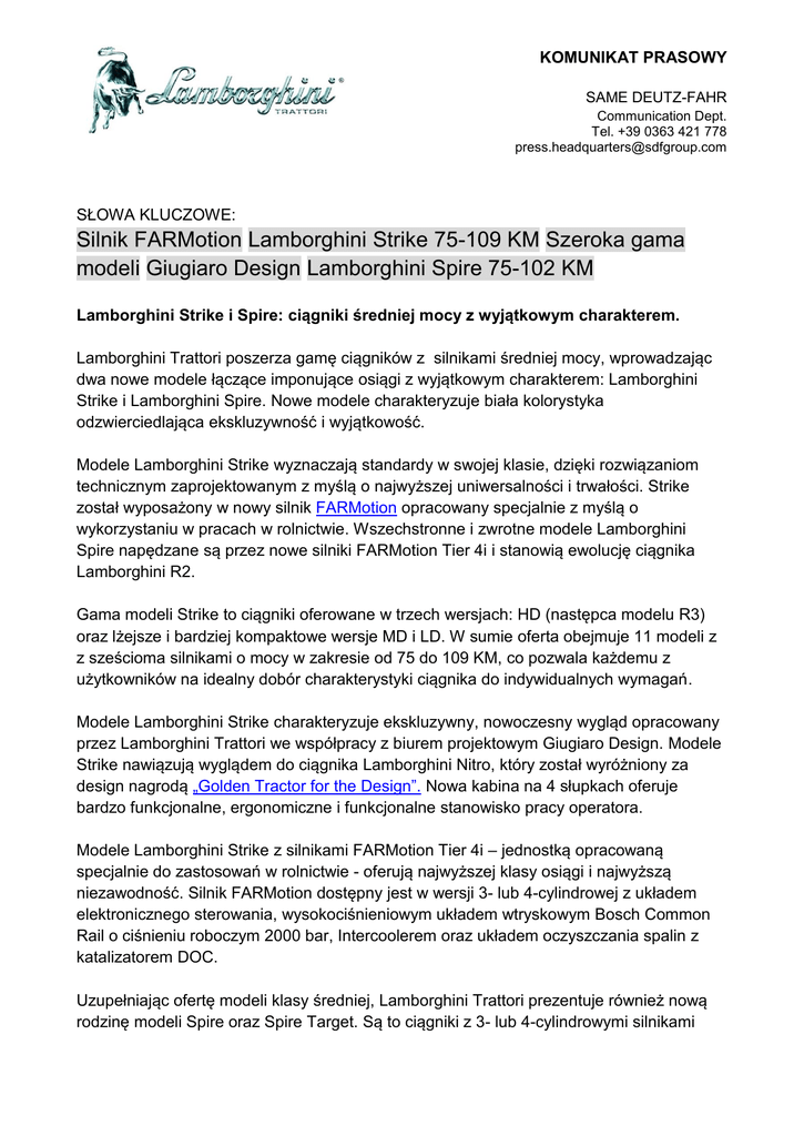 KOMUNIKAT PRASOWY SAME DEUTZ-FAHR Communication Dept. Tel. +39 0363 421 778 [email protected] SŁOWA KLUCZOWE: Silnik FARMotion Lamborghini Strike 75-109 KM Szeroka gama modeli Giugiaro Design Lamborghini Spire 75-102 KM Lamborghini Strike i Spire: ciągniki średniej mocy z wyjątkowym charakterem. Lamborghini Trattori poszerza gamę ciągników z silnikami średniej mocy, wprowadzając dwa nowe modele łączące imponujące osiągi z wyjątkowym charakterem: Lamborghini Strike i Lamborghini Spire. Nowe modele charakteryzuje biała kolorystyka odzwierciedlająca ekskluzywność i wyjątkowość. Modele Lamborghini Strike wyznaczają standardy w swojej klasie, dzięki rozwiązaniom technicznym zaprojektowanym z myślą o najwyższej uniwersalności i trwałości. Strike został wyposażony w nowy silnik FARMotion opracowany specjalnie z myślą o wykorzystaniu w pracach w rolnictwie. Wszechstronne i zwrotne modele Lamborghini Spire napędzane są przez nowe silniki FARMotion Tier 4i i stanowią ewolucję ciągnika Lamborghini R2. Gama modeli Strike to ciągniki oferowane w trzech wersjach: HD (następca modelu R3) oraz lżejsze i bardziej kompaktowe wersje MD i LD. W sumie oferta obejmuje 11 modeli z z sześcioma silnikami o mocy w zakresie od 75 do 109 KM, co pozwala każdemu z użytkowników na idealny dobór charakterystyki ciągnika do indywidualnych wymagań. Modele Lamborghini Strike charakteryzuje ekskluzywny, nowoczesny wygląd opracowany przez Lamborghini Trattori we współpracy z biurem projektowym Giugiaro Design. Modele Strike nawiązują wyglądem do ciągnika Lamborghini Nitro, który został wyróżniony za design nagrodą „Golden Tractor for the Design”. Nowa kabina na 4 słupkach oferuje bardzo funkcjonalne, ergonomiczne i funkcjonalne stanowisko pracy operatora. Modele Lamborghini Strike z silnikami FARMotion Tier 4i – jednostką opracowaną specjalnie do zastosowań w rolnictwie - oferują najwyższej klasy osiągi i najwyższą niezawodność. Silnik FARMotion dostępny jest w wersji 3- lub 4-cylindrowej z układem elektronicznego sterowania, wysokociśnieniowym układem wtryskowym Bosch Common Rail o ciśnieniu roboczym 2000 bar, Intercoolerem oraz układem oczyszczania spalin z katalizatorem DOC. Uzupełniając ofertę modeli klasy średniej, Lamborghini Trattori prezentuje również nową rodzinę modeli Spire oraz Spire Target. Są to ciągniki z 3- lub 4-cylindrowymi silnikami KOMUNIKAT PRASOWY SAME DEUTZ-FAHR Communication Dept. Tel. +39 0363 421 778 [email protected] FARMotion o mocy od 75 do 102 KM, spełniającymi wymogi normy emisji spalin Tier 4i. Spire oferuje nadzwyczajną, wyjątkowoą stylistykę, uniwersalność i manewrowość. STRIKE Silnik Moc maksymalna (KM) Maksymalny moment obrotowy (Nm) Cylindry/Pojemność (ilość/cm3) Maks. masa dopuszczalna (kg) STRIKE Silnik Moc maksymalna (KM) Maksymalny moment obrotowy (Nm) Cylindry/Pojemność (ilość/cm3) Maks. masa dopuszczalna (kg) STRIKE Silnik Moc maksymalna (KM) Maksymalny moment obrotowy (Nm) Cylindry/Pojemność (ilość/cm3) Maks. masa dopuszczalna (kg) SPIRE Silnik Moc maksymalna (KM) Maksymalny moment obrotowy (Nm) Cylindry/Pojemność (ilość/cm3) Maks. masa dopuszczalna (kg) SPIRE Target Silnik Moc maksymalna (KM) Maksymalny moment obrotowy (Nm) Cylindry/Pojemność (ilość/cm3) Maks. masa dopuszczalna (kg) LD 80 90 100 FARMotion – T4i FARMotion – T4i FARMotion – T4i 75 88 97 342 354 369 3 / 2887 3 / 2887 3 / 2887 5500 5500 5500 MD 90 90,4 100 105,4 115,4 FARMotion – T4i FARMotion – T4i FARMotion – T4i FARMotion – T4i FARMotion – T4i 88 88 97 102 109 354 354 369 408 436 3 / 2887 4 / 3849 3 / 2887 4 / 3849 4 / 3849 6200 6200 6200 6200 6200 HD 90,4 105,4 115,4 FARMotion – T4i FARMotion – T4i FARMotion – T4i 88 102 109 354 408 436 4 / 3849 4 / 3849 4 / 3849 7000 7000 7500 80 90 90,4 100,4 FARMotion – T4i FARMotion – T4i FARMotion – T4i FARMotion – T4i 75 88 88 102 342 354 354 408 3 / 2887 3 / 2887 4 / 3849 4 / 3849 5200 5200 5200 5200 80 90 90,4 FARMotion – T4i FARMotion – T4i FARMotion – T4i 75 88 88 342 354 354 3 / 2887 3 / 2887 4 / 3849 5200 5200 5200 KOMUNIKAT PRASOWY SAME DEUTZ-FAHR Communication Dept. Tel. +39 0363 421 778 [email protected] Lamborghini Trattori Ciągniki Lamborghini łączą wyjątkowy design z doskonałymi osiągami. www.lamborghini-tractors.com www.facebook.com/LamborghiniTrattori www.youtube.com/user/LamborghiniTrattori Informacje o Grupie SAME DEUTZ-FAHR Koncern SAME DEUTZ-FAHR (SDF) z siedzibą w Treviglio (BG), we Włoszech jest jednym z wiodących światowych producentów ciągników, kombajnów, maszyn rolniczych i silników. Jego produkty są wytwarzane i oferowane na całym świecie pod markami SAME, DEUTZ-FAHR, LAMBORGHINI Trattori, LAMBORGHINI GREEN PRO, HÜRLIMANN i GRÉGOIRE. Gama ciągników oferuje moce od 23 do 270 KM, a kombajnów od 100 do 395 KM. Koncern SAME DEUTZ-FAHR posiada siedem zakładów produkcyjnych, 13 oddziałów handlowych, 2 spółki joint venture, 141 importerów, ponad 3000 dealerów i zatrudnia 3039 pracowników. W 2013 r. Grupa SDF osiągnęła przychody w wysokości 1212 mln euro z zyskiem operacyjnym na poziomie 6,9% przychodów. www.samedeutz-fahr.com
