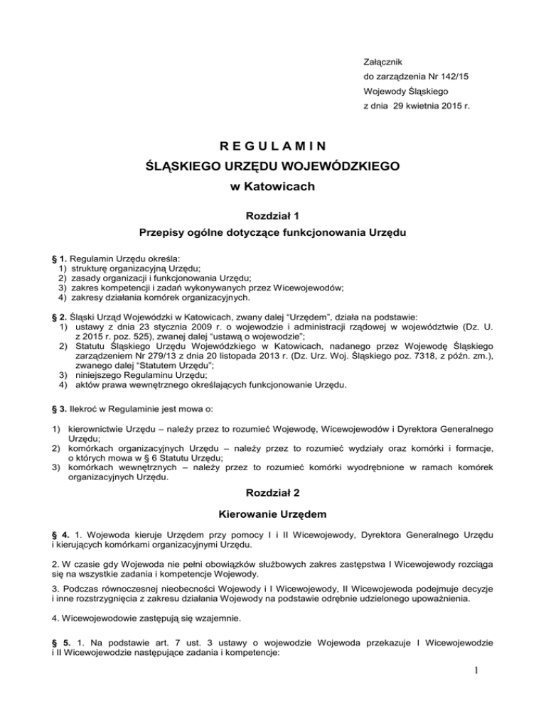 Załącznik do zarządzenia Nr 142/15 Wojewody Śląskiego z dnia 29 kwietnia 2015 r. REGULAMIN ŚLĄSKIEGO URZĘDU WOJEWÓDZKIEGO w Katowicach Rozdział 1 Przepisy ogólne dotyczące funkcjonowania Urzędu § 1. Regulamin Urzędu określa: 1) strukturę organizacyjną Urzędu; 2) zasady organizacji i funkcjonowania Urzędu; 3) zakres kompetencji i zadań wykonywanych przez Wicewojewodów; 4) zakresy działania komórek organizacyjnych. § 2. Śląski Urząd Wojewódzki w Katowicach, zwany dalej “Urzędem”, działa na podstawie: 1) ustawy z dnia 23 stycznia 2009 r. o wojewodzie i administracji rządowej w województwie (Dz. U. z 2015 r. poz. 525), zwanej dalej “ustawą o wojewodzie”; 2) Statutu Śląskiego Urzędu Wojewódzkiego w Katowicach, nadanego przez Wojewodę Śląskiego zarządzeniem Nr 279/13 z dnia 20 listopada 2013 r. (Dz. Urz. Woj. Śląskiego poz. 7318, z późn. zm.), zwanego dalej “Statutem Urzędu”; 3) niniejszego Regulaminu Urzędu; 4) aktów prawa wewnętrznego określających funkcjonowanie Urzędu. § 3. Ilekroć w Regulaminie jest mowa o: 1) kierownictwie Urzędu – należy przez to rozumieć Wojewodę, Wicewojewodów i Dyrektora Generalnego Urzędu; 2) komórkach organizacyjnych Urzędu – należy przez to rozumieć wydziały oraz komórki i formacje, o których mowa w § 6 Statutu Urzędu; 3) komórkach wewnętrznych – należy przez to rozumieć komórki wyodrębnione w ramach komórek organizacyjnych Urzędu. Rozdział 2 Kierowanie Urzędem § 4. 1. Wojewoda kieruje Urzędem przy pomocy I i II Wicewojewody, Dyrektora Generalnego Urzędu i kierujących komórkami organizacyjnymi Urzędu. 2. W czasie gdy Wojewoda nie pełni obowiązków służbowych zakres zastępstwa I Wicewojewody rozciąga się na wszystkie zadania i kompetencje Wojewody. 3. Podczas równoczesnej nieobecności Wojewody i I Wicewojewody, II Wicewojewoda podejmuje decyzje i inne rozstrzygnięcia z zakresu działania Wojewody na podstawie odrębnie udzielonego upoważnienia. 4. Wicewojewodowie zastępują się wzajemnie. § 5. 1. Na podstawie art. 7 ust. 3 ustawy o wojewodzie Wojewoda przekazuje I Wicewojewodzie i II Wicewojewodzie następujące zadania i kompetencje: 1 1 1) do zakresu zadań i kompetencji wykonywanych przez I Wicewojewodę należy: a) realizowanie zadań i kompetencji Wojewody określonych w § 67, § 68, § 73 i § 74, b) nadzorowanie zadań realizowanych przez Państwową Straż Łowiecką i Państwową Straż Rybacką, c) koordynowanie działalności Śląskiego Wojewódzkiego Inspektora Inspekcji Handlowej, Śląskiego Wojewódzkiego Inspektora Jakości Handlowej Artykułów Rolno-Spożywczych, Śląskiego Wojewódzkiego Inspektora Ochrony Roślin i Nasiennictwa, Śląskiego Wojewódzkiego Inspektora Ochrony Środowiska oraz Śląskiego Wojewódzkiego Lekarza Weterynarii; 2) do zakresu zadań i kompetencji wykonywanych przez II Wicewojewodę należy: a) realizowanie zadań i kompetencji Wojewody określonych w § 69, § 71, § 75 i § 84, b) koordynowanie działalności Śląskiego Kuratora Oświaty, Śląskiego Wojewódzkiego Nadzoru Geodezyjnego i Kartograficznego, Śląskiego Wojewódzkiego Farmaceutycznego, Śląskiego Wojewódzkiego Inspektora Nadzoru Budowlanego, Wojewódzkiego Konserwatora Zabytków, Śląskiego Wojewódzkiego Inspektora Drogowego oraz Śląskiego Państwowego Wojewódzkiego Inspektora Snitarnego. Inspektora Inspektora Śląskiego Transportu 2. Wicewojewodowie podejmują rozstrzygnięcia w sprawach z zakresu wykonywanych zadań i kompetencji określonych w ust. 1 oraz podpisują pisma i dokumenty z tego zakresu na podstawie udzielonych im przez Wojewodę upoważnień. 3. Wicewojewodowie podejmują rozstrzygnięcia w sprawach z zakresu zadań i kompetencji należącego do zastępowanego Wicewojewody oraz podpisują pisma i dokumenty z tego zakresu na podstawie udzielonych im przez Wojewodę upoważnień. 4. Wicewojewodowie odpowiadają za realizację powierzonych im zadań i kompetencji oraz są zobowiązani do uzgadniania z Wojewodą podejmowanych inicjatyw i kierunków rozstrzygnięć mających istotne znaczenie dla realizacji zadań administracji rządowej w województwie. § 6. 1. Dyrektor Generalny Urzędu podlega bezpośrednio Wojewodzie i zapewnia prawidłowe funkcjonowanie Urzędu, warunki jego działania oraz właściwą organizację pracy Urzędu. 2. Do zakresu zadań Dyrektora Generalnego Urzędu należy także realizowanie zadań Wojewody określonych w § 80 na podstawie udzielonego przez Wojewodę upoważnienia. 3. Dyrektorowi Generalnemu Urzędu podlega bezpośrednio w zakresie merytorycznym stanowisko pracy realizujące w Urzędzie zadania z zakresu bezpieczeństwa i higieny pracy. 4. W czasie nieobecności Dyrektora Generalnego Urzędu lub czasowej niemożności wykonywania przez niego obowiązków zastępstwo pełni Dyrektor Biura Dyrektora Generalnego, chyba, że Dyrektor Generalny Urzędu wyznaczy do pełnienia zastępstwa dyrektora innego wydziału. § 7. 1. Kierownictwo Urzędu sprawuje bezpośredni nadzór nad komórkami organizacyjnymi Urzędu zgodnie z następującym podziałem: 1) Wojewoda: a) Wydział Bezpieczeństwa i Zarządzania Kryzysowego, b) Wydział Centrum Powiadamiania Ratunkowego, c) Wydział Kontroli, d) Wydział Nadzoru Prawnego, e) Biuro Wojewody, f) Zespół Audytu Wewnętrznego, g) Zespół do Spraw Ochrony Informacji Niejawnych; 2) I Wicewojewoda: a) Wydział Certyfikacji i Rozwoju, b) Wydział Finansów i Budżetu, c) Wydział Nadzoru Właścicielskiego, 2 2 d) Wydział Polityki Społecznej, e) Państwowa Straż Łowiecka, f) Państwowa Straż Rybacka; 3) II Wicewojewoda: a) Wydział Infrastruktury, b) Wydział Nadzoru Nad Systemem Opieki Zdrowotnej, c) Wydział Spraw Obywatelskich i Cudzoziemców, d) Wojewódzka Inspekcja Geodezyjna i Kartograficzna, e) Wojewódzki Zespół do Spraw Orzekania o Niepełnosprawności; 4) Dyrektor Generalny Urzędu: a) Biuro Budżetowo-Księgowe, b) Biuro Dyrektor