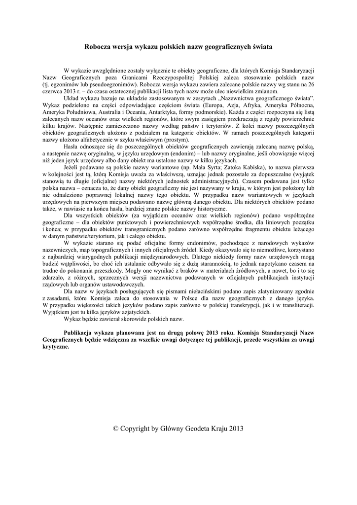 Robocza wersja wykazu polskich nazw geograficznych świata W wykazie uwzględnione zostały wyłącznie te obiekty geograficzne, dla których Komisja Standaryzacji Nazw Geograficznych poza Granicami Rzeczypospolitej Polskiej zaleca stosowanie polskich nazw (tj. egzonimów lub pseudoegzonimów). Robocza wersja wykazu zawiera zalecane polskie nazwy wg stanu na 26 czerwca 2013 r. – do czasu ostatecznej publikacji lista tych nazw może ulec niewielkim zmianom. Układ wykazu bazuje na układzie zastosowanym w zeszytach „Nazewnictwa geograficznego świata”. Wykaz podzielono na części odpowiadające częściom świata (Europa, Azja, Afryka, Ameryka Północna, Ameryka Południowa, Australia i Oceania, Antarktyka, formy podmorskie). Każda z części rozpoczyna się listą zalecanych nazw oceanów oraz wielkich regionów, które swym zasięgiem przekraczają z reguły powierzchnie kilku krajów. Następnie zamieszczono nazwy według państw i terytoriów. Z kolei nazwy poszczególnych obiektów geograficznych ułożono z podziałem na kategorie obiektów. W ramach poszczególnych kategorii nazwy ułożono alfabetycznie w szyku właściwym (prostym). Hasła odnoszące się do poszczególnych obiektów geograficznych zawierają zalecaną nazwę polską, a następnie nazwę oryginalną, w języku urzędowym (endonim) – lub nazwy oryginalne, jeśli obowiązuje więcej niż jeden język urzędowy albo dany obiekt ma ustalone nazwy w kilku językach. Jeżeli podawane są polskie nazwy wariantowe (np. Mała Syrta; Zatoka Kabiska), to nazwa pierwsza w kolejności jest tą, którą Komisja uważa za właściwszą, uznając jednak pozostałe za dopuszczalne (wyjątek stanowią tu długie (oficjalne) nazwy niektórych jednostek administracyjnych). Czasem podawana jest tylko polska nazwa – oznacza to, że dany obiekt geograficzny nie jest nazywany w kraju, w którym jest położony lub nie odnaleziono poprawnej lokalnej nazwy tego obiektu. W przypadku nazw wariantowych w językach urzędowych na pierwszym miejscu podawano nazwę główną danego obiektu. Dla niektórych obiektów podano także, w nawiasie na końcu hasła, bardziej znane polskie nazwy historyczne. Dla wszystkich obiektów (za wyjątkiem oceanów oraz wielkich regionów) podano współrzędne geograficzne – dla obiektów punktowych i powierzchniowych współrzędne środka, dla liniowych początku i końca; w przypadku obiektów transgranicznych podano zarówno współrzędne fragmentu obiektu leżącego w danym państwie/terytorium, jak i całego obiektu. W wykazie starano się podać oficjalne formy endonimów, pochodzące z narodowych wykazów nazewniczych, map topograficznych i innych oficjalnych źródeł. Kiedy okazywało się to niemożliwe, korzystano z najbardziej wiarygodnych publikacji międzynarodowych. Dlatego niekiedy formy nazw urzędowych mogą budzić wątpliwości, bo choć ich ustalanie odbywało się z dużą starannością, to jednak napotykano czasem na trudne do pokonania przeszkody. Mogły one wynikać z braków w materiałach źródłowych, a nawet, bo i to się zdarzało, z różnych, sprzecznych wersji nazewnictwa podawanych w oficjalnych publikacjach instytucji rządowych lub organów ustawodawczych. Dla nazw w językach posługujących się pismami niełacińskimi podano zapis zlatynizowany zgodnie z zasadami, które Komisja zaleca do stosowania w Polsce dla nazw geograficznych z danego języka. W przypadku większości takich języków podano zapis zarówno w polskiej transkrypcji, jak i w transliteracji. Wyjątkiem jest tu kilka języków azjatyckich. Wykaz będzie zawierał skorowidz polskich nazw. Publikacja wykazu planowana jest na drugą połowę 2013 roku. Komisja Standaryzacji Nazw Geograficznych będzie wdzięczna za wszelkie uwagi dotyczące tej publikacji, przede wszystkim za uwagi krytyczne. © Copyright by Główny Geodeta Kraju 2013 1 EUROPA Wielkie regiony, oceany Arktyka; fiń. Arktinen alue; Arktis; isl. Norðurslóðir; norw. Arktis; ros. Arktika (trl.), Arktika (trb.); szw. Arktis [również Ameryka Północna, Azja] Bałkany; alb. Ballkan, Ballkani; boś. Balkan; bułg. Balkan (trl.), Bałkan (trb.); chorw. Balkan; czarnog. Balkan; gr. Valkánia (trl.), Walkania (trb.); maced. Balkan (trl.), Bałkan (trb.); rum. Balcani; serb. Balkan; słoweń. Balkan; tur. Balkanlar; Balkan Eurazja; alb. Evroazia; ang. Eurasia; bask. Eurasia; błr. Jeŭrazija (trl.), Jeurazija (trb.); boś. Evroazija; bułg. Evrazia (trl.), Ewrazija (trb.); chorw. Euroazija; czarnog. Evroazija; czeski Eurasie; duń. Eurasien; est. Euraasia; far. Evrasia; fiń. Euraasia; fr. Eurasie; fryz. Jeraazje; gael. Eoràisia; galis. Eurasia; gr. Eyrasía (trl.), Ewrasia (trb.); hiszp. Eurasia; irl. An Eoráise; isl. Evrasía; kat. Euràsia; kaz. Euraziâ (trl.), Eurazija (trb.); lit. Eurazija; luks. Eurasien; łac. Eurasia; łot. Eirāzija; maced. Evroazija (trl.), Ewroazija (trb.); malt. Ewrasja; manx Yn Oaraishey; mołd. Eurasia; nid. Eurazië; niem. Eurasien; norw. Eurasia; port. Eurásia; retorom. Eurasia; ros. Evrazija (trl.), Jewrazija (trb.); rum. Eurasia; serb. Evroazija; słow. Eurázia; słoweń. Evrazija; szw. Eurasien; tur. Avrasya; ukr. Yevraziia (trl.), Jewrazija (trb.); wal. Ewrasia; węg. Eurázsia; wł. Eurasia [również Azja] Europa; alb. Evropa; ang. Europe; bask. Europa; błr. Jeŭropa (trl.), Jeuropa (trb.); boś. Evropa; bułg. Evropa (trl.), Ewropa (trb.); chorw. Europa; czarnog. Evropa; czeski Evropa; duń. Europa; est. Euroopa; far. Evropa; fiń. Eurooppa; fr. Europe; fryz. Jeropa; gael. An Roinn-Eòrpa; galis. Europa; gr. Eyrṓpī (trl.), Ewropi (trb.); hiszp. Europa; irl. An Eoraip; isl. Evrópa; kat. Europa; kaz. Europa (trl.), Jeuropa (trb.); lit. Europa; luks. Europa; łac. Europa; łot. Eiropa; maced. Evropa (trl.), Ewropa (trb.); malt. Ewropa; manx Yn Oarpey; mołd. Europa; nid. Europa; niem. Europa; norw. Europa; port. Europa; retorom. Europa; ros. Evropa (trl.), Jewropa (trb.); rum. Euro