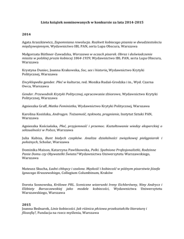 Listaksiążeknominowanychwkonkursiezalata2014-2015 2014 AgataAraszkiewicz,Zapomnianarewolucja.Rozkwitkobiecegopisaniawdwudziestoleciu międzywojennym,WydawnictwoIBLPAN,seriaLupaObscura,Warszawa MałgorzataBüthner-Zawadzka,Warszawawoczachpisarek.Obrazidoświadczenie miastawpolskiejproziekobiecej1864-1939,WydawnictwoIBLPAN,seriaLupaObscura, Warszawa KrystynaDuniec,JoannaKrakowska,Soc,sexihistoria,WydawnictwoKrytyki Politycznej,Warszawa Encyklopediagender.Płećwkulturze,red.MonikaRudaś-Grodzkaiin.,Wyd.Czarna Owca,Warszawa Gender.PrzewodnikKrytykiPolitycznej,opracowaniezbiorowe,WydawnictwoKrytyki Politycznej,Warszawa AgnieszkaGraff,MatkaFeministka,WydawnictwoKrytykiPolitycznej,Warszawa KarolinaKosińska,Androgyn.Tożsamość,tęsknota,pragnienie,InstytutSztukiPAN, Warszawa Agnieszka Kościańska, Płeć, przyjemność i przemoc. Kształtowanie wiedzy eksperckiej o seksualnościwPolsce,Warszawa Julia Kubisa, Bunt białych czepków. Analiza działalności związkowej pielęgniarek i położnych,Scholar,Warszawa DominikaMaison,KatarzynaPawlikowska,Polki.SpełnioneProfesjonalistki,Rodzinne PanieDomuczyObywatelkiŚwiata?WydawnictwaUniwersytetuWarszawskiego, Warszawa MateuszSkucha,Ładnichłopcyiszalone.MęskośćikobiecośćwpóźnympisarstwieJózefa IgnacegoKraszewskiego,CollegiumColumbinum,Kraków DorotaSosnowska,KrólowePRL.ScenicznewizerunkiIrenyEichlerówny,NinyAndryczi Elżbiety Barszczewskiej jako modele kobiecości, Wydawnictwa Uniwersytetu Warszawskiego,Warszawa 2015 JoannaBednarek,Liniekobiecości.Jakróżnicapłciowaprzekształciłaliteraturęi filozofię?,Fundacjanarzeczmyślenia,Warszawa WandaCzarnota,WyboryżyciowemłodychPolek.Przyczynekdoantropologiikobiety, WydawnictwoNaukowePWN,Warszawa Natalia Jarska, Kobiety z Marmuru. Robotnice w Polsce w latach 1945-1960, IPN, Warszawa Niebezpieczne związki. Macierzyństwo, ojcostwo i polityka, red. nauk. Renata Hryciuk, ElżbietaKorolczuk,WydawnictwaUniwersytetuWarszawskiego,Warszawa ZuzannaRadzik,Kościółkobiet,WydawnictwoKrytykiPolitycznej,Warszawa Szlakkobiet.PrzewodniczkapoPolsceEmancypantek,red.EwaFurgał,Fundacja PrzestrzeńKobiet,Kraków MonikaŚwierkosz,Wprzestrzeniachtradycji.ProzaIzabeliFilipiakiOlgiTokarczukw sporacholiteraturę,kanonifeminizm,LupaObscura,Warszawa MonikaTalarczyk-Gubała,WandaJakubowska.Odnowa,WydawnictwoKrytyki Politycznej,Warszawa Płeć buntu. Kobiety w oporze społecznym w Polsce w latach 1944–1989 na tle porównawczym,red.NataliaJarskaiJanOlaszek,IPN,Warszawa SylwiaUrbańska,MatkaPolkanaodległość.Zdoświadczeńmigracyjnychrobotnic19892010,FNP,Warszawa AnnaZawadzka,Tenpierwszyraz.Konstruowanieheteroseksualności,Wydawnictwo UniwersytetuWarszawskiego,Warszawa AgataZawiszewska,ArletaGalant,Czytanie.Kobieta,biblioteka,literatura,Wydawnictwo UniwersytetuSzczecińskiego,Szczecin
