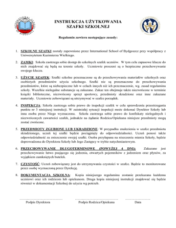 INSTRUKCJA UŻYTKOWANIA SZAFKI SZKOLNEJ Regulamin zawiera następujące zasady: 1. SZKOLNE SZAFKI zostały zapewnione przez International School of Bydgoszcz przy współpracy z Uniwersytetem Kazimierza Wielkiego. 2. ZAMKI: Szkoła zastrzega sobie dostęp do szkolnych szafek uczniów. W tym celu zapasowe klucze do nich znajdować się będą na terenie szkoły. Uczniowie proszeni są o bezpieczne przechowywanie swojego klucza. 3. UŻYCIE SZAFEK: Szafki szkolne przeznaczone są do przechowywania materiałów szkolnych oraz osobistych przedmiotów użycia szkolnego. Szafki nie są przeznaczone do przechowywania przedmiotów, które są niebezpieczne lub w celach innych niż ich przeznaczenie, wg. zasad regulaminu szkoły. Wszelkie nielegalne substancje są zakazane. Zakaz ten obejmuje także niezwrócone w terminie ksiązki biblioteczne, niezwrócony sprzęt sportowy, przedmioty skradzione oraz inne zakazane materiały. Uczniowie zobowiązani są utrzymywać w szafce porządek. 4. INSPEKCJA: Szkoła zastrzega sobie prawo do inspekcji szafek w celu sprawdzenia przestrzegania punktu nr 3 niniejszej instrukcji. W zaistniałej sytuacji inspekcji może dokonać Dyrektor Szkoły lub inna osoba przez Niego wyznaczona. Szkoła zastrzega sobie prawo do konfiskaty nielegalnych i niezwróconych zawartości szafek, jednakże na żądanie Rodzica/Opiekuna niniejsze przedmioty mogą zostać zwrócone. 5. PRZEDMIOTY ZGUBIONE LUB UKRADZIONE: W przypadku znalezienia w szafce przedmiotu skradzionego, uczeń tej szafki będzie pociągnięty do odpowiedzialności. Uczeń ponosi także odpowiedzialność za zniszczenie swojej szafki. Osoba przyłapana na niszczeniu mienia Szkoły, będzie doprowadzona do Dyrektora Szkoły lub Jego Zastępcy w trybie natychmiastowym. 6. PRZECHOWYWANIE DŁUGOTERMINOWE (POWYŻEJ 4 DNI): Zakazane jest przechowywanie łatwo psującego się jedzenia, otwartych pojemników z jedzeniem oraz płynów, za wyjątkiem zamkniętych butelek. 7. CZYSTOŚĆ: Uczeń zobowiązany jest do utrzymywania czystości w szafce. Będzie to monitorowane przez osobę wyznaczoną przez Dyrekcję. 8. DOKUMENTACJA SZKOLNA: Kopia niniejszego regulaminu zostanie przekazana każdemu uczniowi oraz ich rodzicom lub opiekunom. Druga kopia niniejszej instrukcji znajdować się będzie również w dokumentacji Szkolnej do użycia wg potrzeb. ……..………………………… Podpis Dyrektora ……..………………………… Podpis Rodzica/Opiekuna …………………. Data