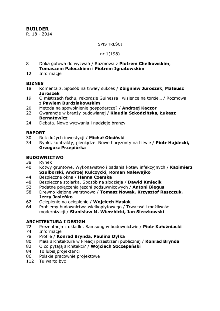 BUILDER R. 18 - 2014 SPIS TREŚCI nr 1(198) 8 12 Doka gotowa do wyzwań / Rozmowa z Piotrem Chelkowskim, Tomaszem Paleczkiem i Piotrem Ignatowskim Informacje BIZNES 18 Komentarz. Sposób na trwały sukces / Zbigniew Juroszek, Mateusz Juroszek 19 O mistrzach fachu, rekordzie Guinessa i wisience na torcie… / Rozmowa z Pawiem Burdziakowskim 20 Metoda na spowolnienie gospodarcze? / Andrzej Kaczor 22 Gwarancje w branży budowlanej / Klaudia Szkodzińska, Łukasz Bernatowicz 24 Debata. Nowe wyzwania i nadzieje branży RAPORT 30 Rok dużych inwestycji / Michał Oksiński 34 Rynki, kontrakty, pieniądze. Nowe horyzonty na Litwie / Piotr Hajdecki, Grzegorz Przepiórka BUDOWNICTWO 38 Rynek 40 Kotwy gruntowe. Wykonawstwo i badania kotew infekcyjnych / Kazimierz Szulborski, Andrzej Kulczycki, Roman Nalewajko 44 Bezpieczne okna / Hanna Czerska 48 Bezpieczna stolarka. Sposób na złodzieja / Dawid Kmiecik 52 Podatne połączenia jezdni podsuwnicowych / Antoni Biegus 58 Drewno klejone warstwowo / Tomasz Nowak, Krzysztof Raszczuk, Jerzy Jasieńko 62 Ocieplenie na ocieplenie / Wojciech Hasiak 64 Problemy budownictwa wielkopłytowego / Trwałość i możliwość modernizacji / Stanisław M. Wierzbicki, Jan Sieczkowski ARCHITEKTURA I DESIGN 72 Prezentacja z okładki. Samsung w budownictwie / Piotr Kałużniacki 74 Informacje 78 Profile / Konrad Brynda, Paulina Dyłka 80 Mała architektura w kreacji przestrzeni publicznej / Konrad Brynda 82 O co pytają architekci? / Wojciech Szczepański 84 To lubią projektanci 86 Polskie pracownie projektowe 112 Tu warto być OPROGRAMOWANIE DLA BUDOWNICTWA dodatek promocyjny 90 Prezentacja z okładki. BIM w budownictwie żelbetowym / Tomasz Olszewski 92 Informacje 96 Akademia BIM. BIM - kosztowny czy opłacalny? 100 ... iż Polscy nie cudzy, iż swój BIM mają / INTERsoft 102 BIM dla Polski / Piotr Dudek 106 Programy dla konstruktorów GE05 dla inżynierów / Monika Mitew-Czajewska 108 Konstrukcje drewniane według Eurokodów / Marian Kazek Mariusz Machej 110 (Znów) czas na zmiany. SeKo PRIX i SeKO SMART 8.2 / Paweł Kaczmarski 111 Programy dla projektantów LogiKal® - mniejszy przebieg / ORGADATA nr 2(199) 8 12 20 lat Austrotherm w Polsce / Rozmowa z Anną Śpiewak Informacje BIZNES 20 Komentarz. Na końcu i tak stoi człowiek / Tomasz Kobierski 22 Innowacyjność Lafarge / Rozmowa z Brunem Roux 29 Zrównoważony rozwój. Wzmacniający dialog / Przemysław Oczyp 32 Rynki, kontrakty, pieniądze. Szwedzki remont szansą dla Polaków / Piotr Urbankowski BUDOWNICTWO 36 Rynek 38 Laureaci Złotego Medalu 2014 40 Uwaga na efekt biedronki / EJOT Polska - Partner Programu 42 Projektowanie konstrukcji aluminiowych według Eurokodów / Marian Gwóźdź 46 Obudowa wykopów głębokich - projektowanie i realizacja / Kazimierz Szulborski, Andrzej Kulczycki, Roman Nalewajko 50 Ekologiczny, czyli jaki? / Michał Piaseck 54 Projektowanie konstrukcji sprężonych według Eurokodu 2 / Wit Derkowski ARCHITEKTURA I DESIGN 60 Informacje 62 Architektura z gontu i gabionów / Rafał Barycz, Paweł Saramowicz 68 DF10 - fuga dla architektów i profesjonalistów 72 Profile - Andrzej Bulanda, Włodzimierz Mucha 76 Duże przeszklenia wyrazem nowoczesnego budownictwa / Bogdan Gierszewski, Rafał Gierszewski 80 Polskie pracownie projektowe 94 Tu warto być WENTYLACJA I KLIMATYZACJA dodatek promocyjny 84 Prezentacja z okładki: Air Medic - perfekcyjna higiena / Michał Sitek 86 Klimatyzacja w dużych biurowcach 90 Dyskomfort zamiast komfortu / Jerzy Sowa nr 3(200) 8 Potencjał tkwi w ludziach / Rozmowa z Andrzejem Kozłowskim TOPBUILDER 2014 11 Laureaci VI edycji konkursu 16 Ytong Panel - szybciej, taniej, ciszej 18 Uni-Mata Plus i Platynowy Dach / Rozmowa z Januszem Łyczko i Sławomirem Kocurem 20 Lindab Familyline - domy w szkielecie stalowym / Rafał Krzymański 21 SKE 100 plus. Dokaż myślą o przyszłości / Tomasz Rudzki 22 Informacje BIZNES 26 Komentarz. Zyskowność niezależna od koniunktury / Piotr Rusecki 33 Zyskaliśmy zaufanie / Rozmowa z Piotrem Grabowiczem 34 Trzy razy pomyśl / Rozmowa z Januszem Sobierajem 35 Cemex Prodomo 36 DEBATA Wykonawstwo w ocenie branży 39 Biznes w najlepszym stylu / Grzegorz Przepiórka 40 Umiarkowani optymiści / Rozmowa z Bogdanem Panhirszem i Mirosławem Lubarskim 42 Targi branżowe. Wszystko o budownictwie infrastrukturalnym 44 ITB dla branży budowlanej / Rozmowa z Janem Bobrowiczem BUDOWNICTWO 46 Rynek 48 Nowa stara jakość / Martyna Maciaszek 52 Jak wzmocnić konstrukcje sklepień murowych? / Łukasz Hojdys, Zbigniew Janowski, Piotr Krajewski 56 (Bez)błędne ocieplanie / Wacław Brachaczek ARCHITEKTURA I DESIGN 64 Informacje 68 Profile / Wojciech Grabianowski 70 Piękno barwy i struktury / Wojciech Szczepański 72 Rewitalizacja dawnej fabryki / Piotr Gastman 76 Przygody z betonem / Oskar Grąbczewski 80 Polskie pracownie projektowe 82 Tu warto być SPORT & REKREACJA 2014 dodatek promocyjny PREZENTACJA Z OKŁADKI 4 ISOVER dla budownictwa sportowego PROGRAM PROMOCYJNY 6 Sportowa Polska 2014 KONFERENCJA 8 CBS. Od pomysłu do sukcesu SPORT&IT 13 POSitive ESOK od LSI Software SIŁOWNIE 14 Bodys - urządzenia do ćwiczeń na świeżym powietrzu RAPORT 16 Sztandarowe inwestycje 2013-2014 / Michał Oksiński BASENY 22 Sposób na czystą wodę / Rozmowa z Piotrem Mazurem 24 Baseny. Współczesne tendencje / Piotr Dominiczak 26 Na basen czy może nad morze / Marek Wrzał 28 Uszczelnienia zespolone - podstawa dobrej hydroizolacji / Tomasz Witczak NAWIERZCHNIE 32 Nawierzchnie poliuretanowe na otwartych obiektach sportowych / Dorota Piętka 34 Nowe warunki techniczne dla podłóg i boisk sportowych TOR 36 Zaproszenie na Pumptrack / Jacek Kowalski LODOWISKA 38 Lodowiska nadal w modzie / Zbigniew Danielczyk 40 Zimno to nasza specjalność ARCHITEKTURA SPORTOWA 42 Jak projektować architekturę sportową / Katarzyna Burzyńska nr 4(201) 8 12 16 17 Klucz do sukcesu inwestycji hotelowej / Rozmowa z Bogdanem Czajkowskim oraz Andrzejem Kaczmarkiem Informacje Zwyc
