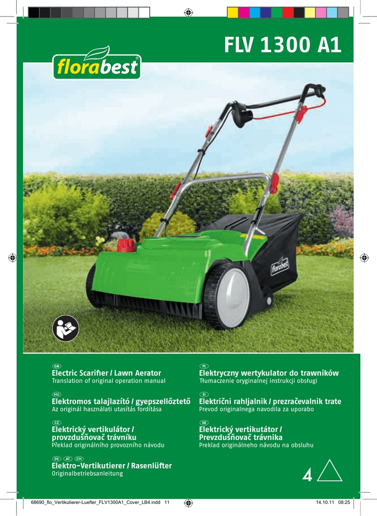® FLV 1300 A1 E lectric Scarifier / Lawn Aerator E lektryczny wertykulator do trawników E lektromos talajlazító / gyepszellőztető A z originál használati utasítás fordítása E lektrični rahljalnik / prezračevalnik trate E lektrický vertikulátor / p rovzdušňovač trávníku E lektrický vertikutátor / P revzdušňovač trávnika Translation of original operation manual Překlad originálního provozního návodu E lektro-Vertikutierer / Rasenlüfter O riginalbetriebsanleitung 68690_flo_Vertikutierer-Luefter_FLV1300A1_Cover_LB4.indd 11 Tłumaczenie oryginalnej instrukcji obsługi Prevod originalnega navodila za uporabo Preklad originálneho návodu na obsluhu 4 14.10.11 08:25 Before reading, unfold the page containing the illustrations and familiarise yourself with all functions of the device. Przed przeczytaniem proszę rozłożyć stronę z ilustracjami, a następnie proszę zapoznać się z wszystkimi funkcjami urządzenia. Olvasás előtt kattintson az ábrát tartalmazó oldalra és végezetül ismerje meg a készülék mindegyik funkcióját. Pred branjem odprite stran s slikami navzven in se nato seznanite z vsemi funkcijami naprave. Před čtením si otevřete stranu s obrázky a potom se seznamte se všemi funkcemi přístroje. Pred čítaním si odklopte stranu s obrázkami a potom sa oboznámte so všetkými funkciami prístroja. Klappen Sie vor dem Lesen die Seite mit den Abbildungen aus und machen Sie sich anschließend mit allen Funktionen des Gerätes vertraut. GB PL HU SI CZ SK DE / AT / CH Translation of original operation manual Tłumaczenie oryginalnej instrukcji obsługi Az originál használati utasítás fordítása Prevod originalnega navodila za uporabo Překlad originálního provozního návodu Preklad originálneho návodu na obsluhu Originalbetriebsanleitung 68690_flo_Vertikutierer-Luefter_FLV1300A1_Cover_LB4.indd 12 Page Strona Oldal Stran Strana Strana Seite 5 17 30 42 55 67 79 14.10.11 08:25 A 1 2 3 4 19b 19a 5a 16 14b 17 18 15 5b 6 7 8 9 14a 10 13 12 11 11 20 21 B E 4 5a 19a 19b 17 14b 18 17 15 5b 16 26 25 14a F 8 28 10 27 C 23 9 10 22 6 24 D 3 2 1 G 19b GB Content Use Use...........................................................5 Safety.instructions.................................5 Symbols / Instructions on the implement ....................................................6 Symbols in the manual........................6 General safety instructions .................6 Functional.parts....................................10 Functional.description.........................10 Assembling.instructions......................10 Extent of the delivery ........................10 Assembling the handle bar ...............10 Mounting and emptying the collection bag .................................... 11 Operation...............................................11 Setting the working positions ............ 11 Switching on and off ..........................12 Working with the implement ..............12 Exchanging the cylinder ....................13 Cleaning,.maintenance,.storage.........13 General cleaning and maintenance work ..................................................13 Storage .............................................14 Disposal.and.protection.of.the.. environment..........................................14 Spare.parts............................................14 Guarantee..............................................14 Technical.data.......................................15 Trouble.shooting..................................16 Translation.of.the.original.EC.declaration. of.conformity.........................................92 Exploded.Drawing................................95 Service-Center......................................97 This implement is used: - As a lawn aerator and to rake leaves, moss and weeds out of the lawn and to collect these leaves and plant residues. - As a verticuttor to cultivate the grass sward and thereby regenerate the lawn. Before first using the machine, please read this instruction manual carefully, for your own safety and for the safety of others. Keep the manual in a safe place and pass it on to any subsequent owner to ensure that the information contained therein is available at all times. Any other use that is not specifically approved in these Instructions can result in damage to the implement and could be a serious danger to the user. The implement must only be operated by adults. Children and people who are not familiar with these Instructions must not be allowed to use this implement. Never operate this implement while it is raining and in a wet environment. The owner or operator is responsible for accidents or harm to people and their property. The manufacturer cannot be held liable for damage caused by incorrect operation of the implement or if it is not used in conformity with its intended purpose. Safety instructions This section covers the basic safety instructions when working with this implement. 5 GB Symbols / Instructions on the implement WARNING! These Instructions must be read! Danger of injury due to flung-out material! Keep bystanders well away from the implement. Danger of electric shock if the power cable is damaged! Always ensure that the power cable is kept well away from the implement and its cutting tools! CAUTION – Sharp tools: Ensure that the hands and feet are kept well away from the cutting tools. The cutting cylinder continues to rotate briefly after the motor has been switched off! Always disconnect the plug from the mains prior to maintenance work or if the power cable is damaged! . Caution with steps! Turn off the power when the implement is to be carried across steps! 105 Noise level ratings LWA in dB(A). Protection Class II Electrically powered implements must not be disposed of with the domestic waste 6 Remove any soil residue from the springs of the impact protection cover and/or the housing to ensure that the cover closes correctly. When operating without the collection bas