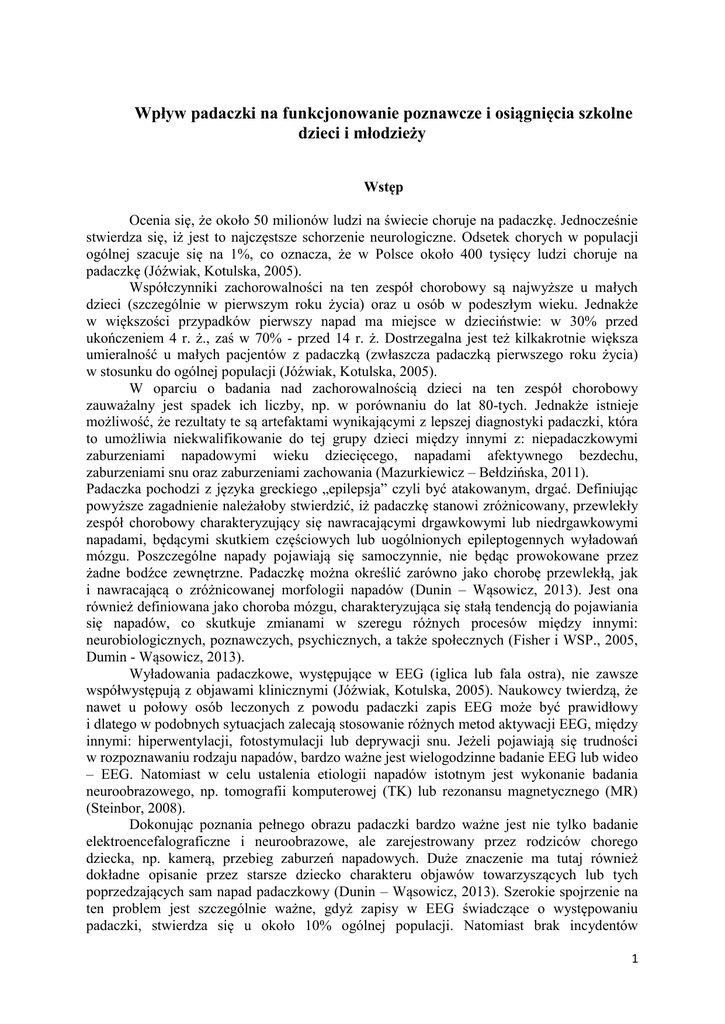 Wpływ padaczki na funkcjonowanie poznawcze i osiągnięcia szkolne dzieci i młodzieży Wstęp Ocenia się, że około 50 milionów ludzi na świecie choruje na padaczkę. Jednocześnie stwierdza się, iż jest to najczęstsze schorzenie neurologiczne. Odsetek chorych w populacji ogólnej szacuje się na 1%, co oznacza, że w Polsce około 400 tysięcy ludzi choruje na padaczkę (Jóźwiak, Kotulska, 2005). Współczynniki zachorowalności na ten zespół chorobowy są najwyższe u małych dzieci (szczególnie w pierwszym roku życia) oraz u osób w podeszłym wieku. Jednakże w większości przypadków pierwszy napad ma miejsce w dzieciństwie: w 30% przed ukończeniem 4 r. ż., zaś w 70% - przed 14 r. ż. Dostrzegalna jest też kilkakrotnie większa umieralność u małych pacjentów z padaczką (zwłaszcza padaczką pierwszego roku życia) w stosunku do ogólnej populacji (Jóźwiak, Kotulska, 2005). W oparciu o badania nad zachorowalnością dzieci na ten zespół chorobowy zauważalny jest spadek ich liczby, np. w porównaniu do lat 80-tych. Jednakże istnieje możliwość, że rezultaty te są artefaktami wynikającymi z lepszej diagnostyki padaczki, która to umożliwia niekwalifikowanie do tej grupy dzieci między innymi z: niepadaczkowymi zaburzeniami napadowymi wieku dziecięcego, napadami afektywnego bezdechu, zaburzeniami snu oraz zaburzeniami zachowania (Mazurkiewicz – Bełdzińska, 2011). Padaczka pochodzi z języka greckiego „epilepsja” czyli być atakowanym, drgać. Definiując powyższe zagadnienie należałoby stwierdzić, iż padaczkę stanowi zróżnicowany, przewlekły zespół chorobowy charakteryzujący się nawracającymi drgawkowymi lub niedrgawkowymi napadami, będącymi skutkiem częściowych lub uogólnionych epileptogennych wyładowań mózgu. Poszczególne napady pojawiają się samoczynnie, nie będąc prowokowane przez żadne bodźce zewnętrzne. Padaczkę można określić zarówno jako chorobę przewlekłą, jak i nawracającą o zróżnicowanej morfologii napadów (Dunin – Wąsowicz, 2013). Jest ona również definiowana jako choroba mózgu, charakteryzująca się stałą tendencją do pojawiania się napadów, co skutkuje zmianami w szeregu różnych procesów między innymi: neurobiologicznych, poznawczych, psychicznych, a także społecznych (Fisher i WSP., 2005, Dumin - Wąsowicz, 2013). Wyładowania padaczkowe, występujące w EEG (iglica lub fala ostra), nie zawsze współwystępują z objawami klinicznymi (Jóźwiak, Kotulska, 2005). Naukowcy twierdzą, że nawet u połowy osób leczonych z powodu padaczki zapis EEG może być prawidłowy i dlatego w podobnych sytuacjach zalecają stosowanie różnych metod aktywacji EEG, między innymi: hiperwentylacji, fotostymulacji lub deprywacji snu. Jeżeli pojawiają się trudności w rozpoznawaniu rodzaju napadów, bardzo ważne jest wielogodzinne badanie EEG lub wideo – EEG. Natomiast w celu ustalenia etiologii napadów istotnym jest wykonanie badania neuroobrazowego, np. tomografii komputerowej (TK) lub rezonansu magnetycznego (MR) (Steinbor, 2008). Dokonując poznania pełnego obrazu padaczki bardzo ważne jest nie tylko badanie elektroencefalograficzne i neuroobrazowe, ale zarejestrowany przez rodziców chorego dziecka, np. kamerą, przebieg zaburzeń napadowych. Duże znaczenie ma tutaj również dokładne opisanie przez starsze dziecko charakteru objawów towarzyszących lub tych poprzedzających sam napad padaczkowy (Dunin – Wąsowicz, 2013). Szerokie spojrzenie na ten problem jest szczególnie ważne, gdyż zapisy w EEG świadczące o występowaniu padaczki, stwierdza się u około 10% ogólnej populacji. Natomiast brak incydentów 1 klinicznych czyli napadów, decyduje o powstrzymywaniu się od podjęcia leczenia farmakologicznego (Jóźwiak, Kotulska, 2005). Ostatecznie rozpoznanie padaczki stawiane jest zazwyczaj przy co najmniej dwóch napadach mózgowych. Jednakże w ostatnich latach uznaje się, że nawet jeden napad u dziecka, z występującym strukturalnym uszkodzeniem mózgu, może uzasadniać powyższą diagnozę (Dunin – Wąsowicz, 2013). Napady padaczkowe mogą pojawić się również u osób nie chorujących na ten zespół chorobowy, u których wystąpią czynniki zewnątrz - lub wewnątrzpochodne takie jak: gorączka, zatrucia, hipoglikemia lub hipokalcemia. Są one szczególnie częste u dzieci poniżej 5 r. ż., jednakże nie powinny być traktowane jako padaczka (Jóźwiak, Kotulska, 2005). Funkcje poznawcze, rozumiane jako czynności układu nerwowego, odpowiedzialne są za odbiór, przetwarzanie oraz przechowywanie informacji. Funkcje poznawcze w przebiegu padaczki W neuropsychologicznych koncepcjach rozwoju człowieka zakłada się, że prawidłowe ukształtowanie systemów funkcjonalnych u dziecka wywiera wpływ na późniejsze jego dorosłe zachowanie. Funkcje poznawcze związane z odbiorem, przetwarzaniem i przechowywaniem informacji dzieli się na cztery podstawowe grupy: 1. funkcje recepcyjne – odpowiedzialne za odbiór, rozpoznanie, klasyfikację i przetwarzanie informacji, 2. pamięć i uczenie się – odnosi się do przechowywania i odtwarzania informacji oraz nabywania nowego materiału, 3. myślenie – rozumiane jako dokonywanie umysłowej organizacji i reorganizacji materiału, 4. funkcje wykonawcze – umożliwiające komunikowanie informacji oraz podejmowanie działania. Szczególne znaczenie przypisuje się tutaj pojęciu inteligencji, jako najbardziej złożonej funkcji psychicznej. Badania neuropsychologiczne wskazują na fakt, że to właśnie inteligencja najtrudniej podlega deterioracji pod wpływem uszkodzeń mózgu, czy też pojawienia się patofizjologicznych procesów w ośrodkowym układzie nerwowym. Wynika to najprawdopodobniej z faktu, że wiele daleko leżących od siebie obszarów jest zaangażowanych w realizację tej funkcji. Istotną rolę odgrywa tutaj także zjawisko plastyczności. Natomiast deficyty pamięci stanowią rezu