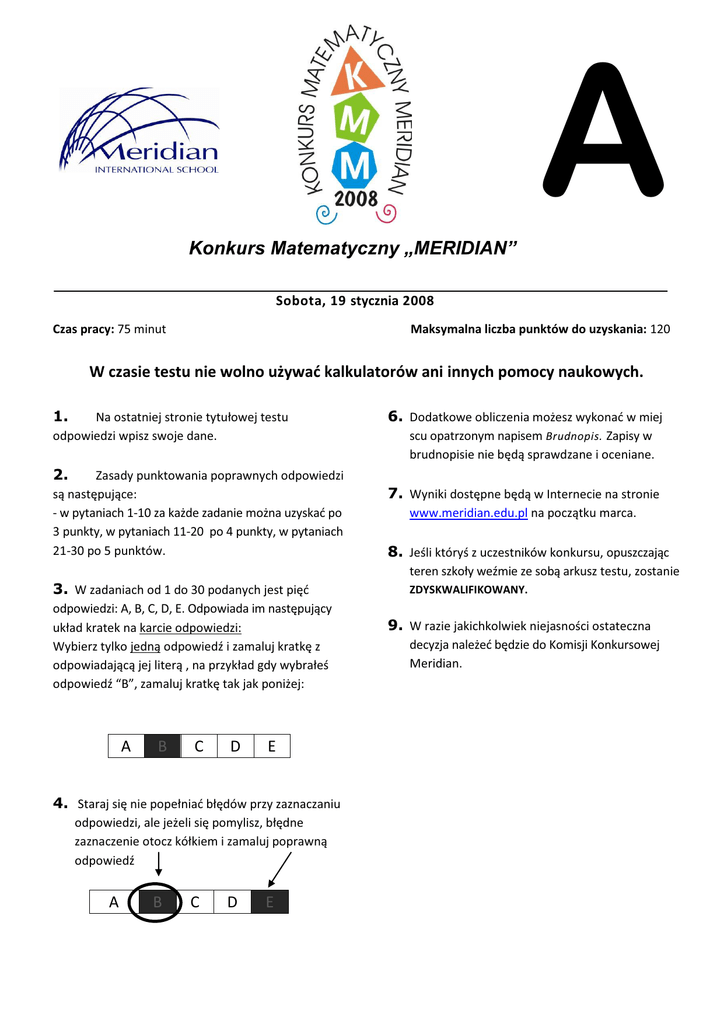 A Konkurs Matematyczny „MERIDIAN” Sobota, 19 stycznia 2008 Czas pracy: 75 minut Maksymalna liczba punktów do uzyskania: 120 W czasie testu nie wolno używać kalkulatorów ani innych pomocy naukowych. Na ostatniej stronie tytułowej testu odpowiedzi wpisz swoje dane. 1. 6. Dodatkowe obliczenia możesz wykonać w miej scu opatrzonym napisem Brudnopis. Zapisy w brudnopisie nie będą sprawdzane i oceniane. 2. Zasady punktowania poprawnych odpowiedzi są następujące: - w pytaniach 1-10 za każde zadanie można uzyskać po 3 punkty, w pytaniach 11-20 po 4 punkty, w pytaniach 21-30 po 5 punktów. 7. Wyniki dostępne będą w Internecie na stronie www.meridian.edu.pl na początku marca. 8. Jeśli któryś z uczestników konkursu, opuszczając teren szkoły weźmie ze sobą arkusz testu, zostanie 3. W zadaniach od 1 do 30 podanych jest pięć odpowiedzi: A, B, C, D, E. Odpowiada im następujący układ kratek na karcie odpowiedzi: Wybierz tylko jedną odpowiedź i zamaluj kratkę z odpowiadającą jej literą , na przykład gdy wybrałeś odpowiedź “B”, zamaluj kratkę tak jak poniżej: A B C D E 4. Staraj się nie popełniać błędów przy zaznaczaniu odpowiedzi, ale jeżeli się pomylisz, błędne zaznaczenie otocz kółkiem i zamaluj poprawną odpowiedź A B C D E ZDYSKWALIFIKOWANY. 9. W razie jakichkolwiek niejasności ostateczna decyzja należeć będzie do Komisji Konkursowej Meridian. A MMC PITAGORASEK 19 stycznia 2008 1. Która liczba jest w połowie pomiędzy 5,6 i 5,65? (A) 5,025 (B) 5,625 (C) 5,62 (D) 5,605 (E) 5,635 2. Która z poniższych równości nie jest prawdziwa? (A) 1×1÷1×1 = 1 (B) 2÷2+2÷2 = 2 (C) 3×3–3+3 = 3 (E) 5+5×(5–5) = 5 1; 3; 5; 7;… 3. Jaka liczba jest na dwa tysiące ósmym miejscu w ciągu: (A) 2007 (D) (4–4)÷4+4 = 4 (B) 4015 (C) 2135 (D) 3579 (E) 2009 (B) (C) (D) (E) 4. Oblicz wartość (A) 5. Na rysunku przedstawiono prostokąt o wymiarach 6 cm na 4 cm. Jakie pole ma jego zacieniowana część? (A) 12 cm 2 (B) 10 cm 2 (C) 9 cm 2 (D) 8 cm 2 (E) 7 cm 2 2 A MMC PITAGORASEK 19 stycznia 2008 6. Średnią jedenastu liczb jest 8. Jeśli dołączymy dwunastą liczbę, to średnia wszystkich dwunastu wyniesie 11. Dwunastą liczbą jest: (A) 11 (B) 12 (C) 33 (D) 44 (E) 22 7. Arnie, Bender i Cross to trzy roboty. Gdy ważymy je parami , to wyniki są następujące A + B = 12 kg Ile ważą trzy roboty razem? (A) 21 kg (B) 42 kg , B + C = 14 kg (C) 28 kg , C + A = 16 kg (D) 32 kg (E) 14 kg 8. Wynik mnożenia liczby przez samą siebie nazywamy kwadratem. Na przykład 9 = 3 × 3 i 36 = 6 × 6 są kwadratami, zaś 12 × 12 = 144 jest trzycyfrowym kwadratem. Ile jest trzycyfrowych kwadratów? (A) 31 (B) 961 (C) 20 (D) 21 (E) 22 9. Szlaczek z dwoma kwadratami ma sześć trójkątów. Ile trójkątów miałby szlaczek z sześcioma kwadratami? (A) 12 (B) 14 (C) 16 (D) 18 (E) 20 3 A MMC PITAGORASEK 19 stycznia 2008 10. Średnia trzech liczb wynosi 17. Średnią dwóch z nich jest 25. Jaka jest trzecia liczba? (A) 0,5 (B) 1 (C) 2 (D) 3 (E) 4 11. Fotografię o wymiarach 7,5 cm 6,5 cm powiększono tak, że dłuższy bok ma teraz 18 cm. Jaką długość ma krótszy bok? (A) 15 (B) 15,6 (C) 16,5 (D) 16,7 (E) 17,5 12. Liczba 20 może być w jeden sposób zapisana jako suma dwóch kwadratów liczb naturalnych: 20 = 4 + 16 = 22 + 42 . Na ile sposobów można to zrobić z liczbą 85? (A) 0 (B) 1 (C) 2 (D) 4 (E) 5 (D) 904 (E) żadna 13.Która z podanych liczb pojawi się w ciągu 2; 5; 10; 17; 26; 37; ...? (A) 901 (B) 902 (C) 903 4 A MMC PITAGORASEK 19 stycznia 2008 14.a, b, c i d to cztery sąsiednie (jak na rysunku) daty w kalendarzu. Które z podanych przypuszczeń nie jest prawdziwe w żadnym kalendarzu? pon (A) c – a = d – b (B) c = a + 7 wt śr czw a b c d pt (C) d = a + 8 sob nd (D) a + c = b + d (E) a + d = c + b 15.Kwadrat ma dwie przekątne a pięciokąt – pięć. Ile przekątnych ma ośmiokąt? (A) 20 (B) 28 (C) 16 (D) 24 (E) 40 16.Suma cyfr liczby trzycyfrowej wynosi 25. Ile liczb trzycyfrowych spełnia ten warunek? (A) 2 (B) 4 (C) 6 (D) 8 (E) 10 (D) 20 (E) 17 17. Ile dzielników ma liczba 2000 (włączając 1 i 2000)? (A) 15 (B) 18 (C) 19 5 A MMC PITAGORASEK 19 stycznia 2008 18. Pomalowanie pokoju (sufit i cztery ściany) zajmuje malarzowi dwa dni. Ile dni (przy tej samej wydajności) zajmie mu pomalowanie pomieszczenia dwa razy wyższego, dwa razy dluższego I dwa razy szerszego? (A) 2 (B) 4 (C) 6 (D) 8 (E) 5 19.Palindrom czyta się tak samo wprzód i wspak (jak liczbę 4774). Ile jest palindromów wśród liczb naturalnych od 10 do 500? (A) 40 (B) 49 (C) 45 (D) 36 (E) inna liczba 20.W otwartej książce iloczyn dwóch widocznych numerów stron wynosi 1332. Jaki jest numer strony po lewej? (A) 666 (B) 36 (C) 667 (D) 37 (E) 38 (C) (D) (E) 21.Który spośród ułamków jest największy? (A) (B) 6 A MMC PITAGORASEK 19 stycznia 2008 22.Puszka w kształcie walca ma średnicę 8 cm i wysokość 11 cm. Jaka największą liczbę takich puszek można zapakować do kartonowego pudla o wymiarach 88 cm (A) 200 (B) 220 (C) 165 44 cm 40 cm? (D) 225 (E) 264 23.Pole ośmiokąta foremnego wynosi 500. Najlepszym przybliżeniem długości jego boku jest: (A) 9 (B)3 (C) 6 (D) 10 (E) 12 24. Ogromny arbuz ważył 50 kg i zawierał 98% wody. Podczas gdy leżał na słońcu, część wody wyparowała i teraz arbuz zawiera tylko 96% wody. Ile waży ten arbuz? (A) 30 kg (B) 44 kg (C) 32 kg (D) 22 kg (E) 25 kg 25. Z jednej cyfry można utworzyć jedną liczbę (np. 9). Z dwóch cyfr (np. 6 i 8) można utworzyć dwie liczby (68 i 86). Ile liczb czterocyfrowych można utworzyć z czterech różnych cyfr? (A) 8 (B) 10 (C) 16 (D) 24 (E) 32 26.Mój zegarek o północy pokazywał właściwy czas, ale potem zaczął się spóźniać o 12 minut na godzinę, aż siedem godzin temu zupełnie się zatrzymał i pokazuje teraz 3:12. Która jest naprawdę godzina? (A) 3:24 (B) 3:48 (C) 11:00 (D) 10:24 (E) 10:48 7 A MMC PITAGORASEK 19 stycznia 2008 27.Pierwotnie blok marmuru ważył 140 