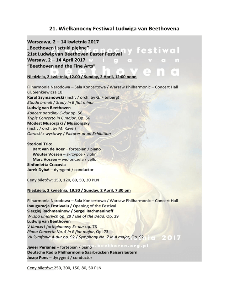 21. Wielkanocny Festiwal Ludwiga van Beethovena Warszawa, 2 – 14 kwietnia 2017 „Beethoven i sztuki piękne” 21st Ludwig van Beethoven Easter Festival Warsaw, 2 – 14 April 2017 “Beethoven and the Fine Arts” Niedziela, 2 kwietnia, 12.00 / Sunday, 2 April, 12:00 noon Filharmonia Narodowa – Sala Koncertowa / Warsaw Philharmonic – Concert Hall ul. Sienkiewicza 10 Karol Szymanowski (instr. / orch. by G. Fitelberg) Etiuda b-moll / Study in B flat minor Ludwig van Beethoven Koncert potrójny C-dur op. 56 Triple Concerto in C major, Op. 56 Modest Musorgski / Mussorgsky (instr. / orch. by M. Ravel) Obrazki z wystawy / Pictures at an Exhibition Storioni Trio: Bart van de Roer – fortepian / piano Wouter Vossen – skrzypce / violin Marc Vossen – wiolonczela / cello Sinfonietta Cracovia Jurek Dybał – dyrygent / conductor Ceny biletów: 150, 120, 80, 50, 30 PLN Niedziela, 2 kwietnia, 19.30 / Sunday, 2 April, 7:30 pm Filharmonia Narodowa – Sala Koncertowa / Warsaw Philharmonic – Concert Hall Inauguracja Festiwalu / Opening of the Festival Siergiej Rachmaninow / Sergei Rachmaninoff Wyspa umarłych op. 29 / Isle of the Dead, Op. 29 Ludwig van Beethoven V Koncert fortepianowy Es-dur op. 73 Piano Concerto No. 5 in E flat major, Op. 73 VII Symfonia A-dur op. 92 / Symphony No. 7 in A major, Op. 92 Javier Perianes – fortepian / piano Deutsche Radio Philharmonie Saarbrücken Kaiserslautern Josep Pons – dyrygent / conductor Ceny biletów: 250, 200, 150, 80, 50 PLN Poniedziałek, 3 kwietnia, 19.30 / Monday, 3 April, 7:30 pm Filharmonia Narodowa – Sala Koncertowa / Warsaw Philharmonic – Concert Hall Ludwig van Beethoven Koncert Skrzypcowy D-dur op. 61 Violin Concerto in D major, Op. 61 IV Symfonia B-dur op. 60 Symphony No. 4 in B flat major, Op. 60 Tseng Yu-chien – skrzypce / violin Hong Kong Sinfonietta Yip Wing-sie – dyrygent / conductor Ceny biletów: 150, 120, 80, 50, 30 PLN Wtorek, 4 kwietnia, 19.30 / Tuesday, 4 April, 7:30 pm Filharmonia Narodowa – Sala Koncertowa / Warsaw Philharmonic – Concert Hall Igor Strawiński / Stravinsky Żywot rozpustnika / The Rake's Progress Andrew Strooper (Tom Rakewell) – tenor Louise Alder (Anne Trulove) – sopran / soprano Tba (Ojciec / Father Trulove) – bas / bass Krzysztof Szumański (Nick Shadow) – baryton / baritone Anna Lubańska (Baba-Turek / Baba the Turk; Matka Gąska / Mother Goose) – mezzosopran / mezzo-soprano Zespół Śpiewaków Miasta Katowice „Camerata Silesia” “Camerata Silesia” The Katowice City Singers’ Ensemble Anna Szostak – przygotowanie chóru / choir master Narodowa Orkiestra Symfoniczna Polskiego Radia w Katowicach Polish National Radio Symphony Orchestra in Katowice Alexander Liebreich – dyrygent / conductor Ceny biletów: 150, 120, 80, 50, 30 PLN Środa, 5 kwietnia, 19.30 / Wednesday, 5 April, 7:30 pm Filharmonia Narodowa – Sala Koncertowa / Warsaw Philharmonic – Concert Hall Ludwig van Beethoven VIII Symfonia F-dur op. 93 Symphony No. 8 in F major, Op. 93 Ah! Perfido op. / Op. 65 Muzyka do tragedii „Egmont” J.W. Goethego op. 84 Incidental Music for J.W. Goethe’s drama “Egmont”, Op. 84 Marie Arnet – sopran / soprano John Malkovich – narrator Wiener Akademie Martin Haselböck – dyrygent / conductor Ceny biletów: 200, 160, 100, 60, 40 PLN Czwartek, 6 kwietnia, 19.30 / Thursday, 6 April, 7:30 pm Filharmonia Narodowa – Sala Koncertowa / Warsaw Philharmonic – Concert Hall Giacomo Puccini Intermezzo z III aktu opery / from 3 act of Manon Lescaut Introduction z III aktu opery / from 3 act of Edgar La Tregenda z opery / from Le Villi Scherzo Sinfonico Intermezzo z opery Siostra Angelika / from Suor Angelica La Rondine / Jaskółka – fragmenty / excerpts La bohème / Cyganeria – fragmenty / excerpts Ewa Vesin – sopran / soprano Edgaras Montvidas – tenor Leopoldo Lo Sciuto – tenor Polska Orkiestra Radiowa / Polish Radio Symphony Orchestra Massimiliano Caldi – dyrygent / conductor Ceny biletów: 150, 120, 80, 50, 30 PLN Piątek, 7 kwietnia, 17.00 / Friday, 5:00 pm Filharmonia Narodowa – Sala Kameralna / Warsaw Philharmonic – Chamber Music Hall ul. Moniuszki 5 Ludwig van Beethoven Sonata A-dur na fortepian i skrzypce „Kreutzerowska” op. 47 Sonata in A major for Piano and Violin “Kreutzer”, Op. 47 Ernest Bloch I Suita na skrzypce solo / Suite No. 1 for Solo Violin Karol Szymanowski Mity op. 30 / Mythes, Op. 30 Edvard Grieg II Sonata skrzypcowa G-dur op. 13 / Violin Sonata No. 2 in G major, Op. 13 Veriko Tchumburidze – skrzypce / violin Aleksandra Świgut – fortepian / piano Ceny biletów: 50, 30 PLN Piątek, 7 kwietnia, 19.30 / Friday, 7 April, 7:30 pm Filharmonia Narodowa – Sala Koncertowa / Warsaw Philharmonic – Concert Hall Georges Bizet Symfonia C-dur / Symphony in C major Djamileh Opera w 1 akcie (wykonanie koncertowe) Opera in 1 act (concert performance) Jennifer Feinstein (Djamileh) – mezzosopran / mezzo-soprano Eric Barry (Haroun) – tenor George Mosley (Splendiano) – baryton / baritone Wojciech Pszoniak – narrator Poznański Chór Kameralny Poznan Chamber Choir Bartosz Michałowski – przygotowanie chóru / choir master Orkiestra Filharmonii Poznańskiej Orchestra of Poznań Philharmonic Łukasz Borowicz – dyrygent / conductor Ceny biletów: 150, 120, 80, 50, 30 PLN Sobota, 8 kwietnia, 19.30 / Saturday, 8 April, 7:30 pm Filharmonia Narodowa – Sala Koncertowa / Warsaw Philharmonic – Concert Hall Felix Mendelssohn-Bartholdy Koncert skrzypcowy e-moll op. 64 / Violin Concerto in E minor, Op. 64 Gustav Mahler V Symfonia cis-moll / Symphony No. 5 in C sharp minor Emmanuel Tjeknavorian – skrzypce / violin Frankfurt Radio Symphony Andrés Orozco-Estrada – dyrygent / conductor Ceny biletów: 200, 160, 100, 60, 40 PLN Niedziela, 9 kwietnia, 12.00 / Sunday, 9 April, 12:00 Filharmonia Narodowa – Sala Koncertowa / Warsaw Philharmonic – Concert Hall Feliks Nowowiejski Uwertura do opery Legenda Bałtyku op. 28 Overture to The