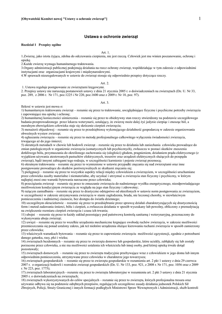 [Obywatelski Komitet nowej "Ustawy o ochronie zwierząt"] 1 Ustawa o ochronie zwierząt Rozdział 1 Przepisy ogólne Art. 1. 1.Zwierzę, jako istota żyjąca, zdolna do odczuwania cierpienia, nie jest rzeczą. Człowiek jest mu winien poszanowanie, ochronę i opiekę. 2.Każde zwierzę wymaga humanitarnego traktowania. 3.Organy administracji publicznej podejmują działania na rzecz ochrony zwierząt, współdziałając w tym zakresie z odpowiednimi instytucjami oraz organizacjami krajowymi i międzynarodowymi. 4.W sprawach nieuregulowanych w ustawie do zwierząt stosuje się odpowiednio przepisy dotyczące rzeczy. Art. 2. 1. Ustawa reguluje postępowanie ze zwierzętami kręgowymi. 2. Przepisy ustawy nie naruszają postanowień ustawy z dnia 21 stycznia 2005 r. o doświadczeniach na zwierzętach (Dz. U. Nr 33, poz. 289, z 2006 r. Nr 171, poz.1225 i Nr 220, poz.1600 oraz z 2009 r. Nr 18, poz. 97). Art. 3. Ilekroć w ustawie jest mowa o: 1) humanitarnym traktowaniu zwierząt – rozumie się przez to traktowanie, uwzględniające fizyczne i psychiczne potrzeby zwierzęcia i zapewniające mu opiekę i ochronę; 2) humanitarnej konieczności uśmiercenia – rozumie się przez to obiektywny stan rzeczy stwierdzony na podstawie szczegółowego badania przeprowadzonego przez lekarza weterynarii, ustalający, że zwierzę może dalej żyć jedynie cierpiąc i znosząc ból, a moralnym obowiązkiem człowieka staje się skrócenie cierpień zwierzęcia; 3) menażerii objazdowej – rozumie się przez to przedsiębiorcę wykonującego działalność gospodarczą w zakresie organizowania obwoźnych wystaw zwierząt; 4) ogłuszaniu zwierzęcia – rozumie się przez to metodę profesjonalnego całkowitego wyłączenia świadomości zwierzęcia, trwającego aż do jego śmierci; 5) okrutnych metodach w chowie lub hodowli zwierząt – rozumie się przez to działania lub zaniechania człowieka prowadzące do zmian patologicznych w organizmie zwierzęcia (somatycznych lub psychicznych), zwłaszcza w postaci skutków znoszenia dotkliwego bólu, przymuszania do określonego zachowania się (uległości) głodem, pragnieniem, działaniem prądu elektrycznego (z wyjątkiem używania atestowanych pastuchów elektrycznych, treserów oraz urządzeń elektrycznych służących do przepędu zwierząt), bądź innymi zabiegami tego rodzaju, w szczególności karmienie i pojenie zwierząt przemocą; 6) okrutnym traktowaniu – rozumie się przez to wymienione w ustawie przypadki znęcania się nad zwierzętami oraz inne postępowanie prowadzące do skutków porównywalnych ze skutkami znęcania się; 7) pielęgnacji – rozumie się przez to wszystkie aspekty relacji między człowiekiem a zwierzęciem, w szczególności uruchamiane przez człowieka zasoby materialne i niematerialne, aby uzyskać i utrzymać u zwierzęcia stan fizyczny i psychiczny, w którym najlepiej znosi ono warunki bytowania narzucone przez człowieka; 8) przeciążaniu zwierząt – rozumie się przez to zmuszanie zwierzęcia do nadmiernego wysiłku energetycznego, nieodpowiadającego możliwościom kondycyjnym zwierzęcia ze względu na jego stan fizyczny i zdrowotny; 9) rażącym zaniedbaniu – rozumie się przez to drastyczne odstępstwo od określonych w ustawie norm postępowania ze zwierzęciem, w szczególności w zakresie utrzymywania zwierzęcia w stanie zagłodzenia, brudu, nie leczonej choroby, w niewłaściwym pomieszczeniu i nadmiernej ciasnocie, bez dostępu do światła dziennego; 10) szczególnym okrucieństwie – rozumie się przez to przedsiębranie przez sprawcę działań charakteryzujących się drastycznością form i metod zadawania śmierci, bólu i cierpień, a zwłaszcza działania w sposób wyszukany lub powolny, obliczony z premedytacją na zwiększenie rozmiaru cierpień zwierzęcia i czasu ich trwania; 11) ubojni – rozumie się przez to każdy zakład pozostający pod państwową kontrolą sanitarną i weterynaryjną, przeznaczony do wykonywania uboju zwierząt; 12) uwięzi – rozumie się przez to wszelkie urządzenia mechaniczne krępujące swobodę ruchów zwierzęcia, w zakresie możliwości przemieszczania się ponad ustalony zakres, jak też niektóre urządzenia służące kierowaniu ruchami zwierzęcia w sposób zamierzony przez człowieka; 13) właściwych warunkach bytowania – rozumie się przez to zapewnienie zwierzęciu możliwości egzystencji, zgodnie z potrzebami danego gatunku, rasy, płci i wieku; 14) zwierzętach bezdomnych – rozumie się przez to zwierzęta domowe lub gospodarskie, które uciekły, zabłąkały się lub zostały porzucone przez człowieka, a nie ma możliwości ustalenia ich właściciela lub innej osoby, pod której opieką trwale dotąd pozostawały; 15) zwierzętach domowych – rozumie się przez to zwierzęta tradycyjnie przebywające wraz z człowiekiem w jego domu lub innym odpowiednim pomieszczeniu, utrzymywane przez człowieka w charakterze jego towarzysza; 16) zwierzętach gospodarskich – rozumie się przez to zwierzęta gospodarskie w rozumieniu art. 2 pkt 1 ustawy z dnia 29 czerwca 2007 r. o organizacji hodowli i rozrodzie zwierząt gospodarskich (Dz. U. Nr 133, poz. 921, z 2008 r. Nr 171, poz. 1056 oraz z 2009 r. Nr 223, poz. 1775); 17) zwierzętach laboratoryjnych - rozumie się przez to zwierzęta laboratoryjne w rozumieniu art. 2 pkt 3 ustawy z dnia 21 stycznia 2005 r. o doświadczeniach na zwierzętach; 18) zwierzętach wykorzystywanych do celów specjalnych – rozumie się przez to zwierzęta, których profesjonalna tresura oraz używanie odbywa się na podstawie odrębnych przepisów, regulujących szczegółowe zasady działania jednostek Polskich Sił Zbrojnych, Policji, Straży Granicznej i innych formacji podległych Ministrowi Spraw Wewnętrznych i Administracji, służb kontroli [Obywatelski Komitet nowej "Ustawy o ochronie zwierząt"] 2 celnej, ratownictwa oraz regulujących zasady szkolenia i wykorzystania psów – przewodników osó