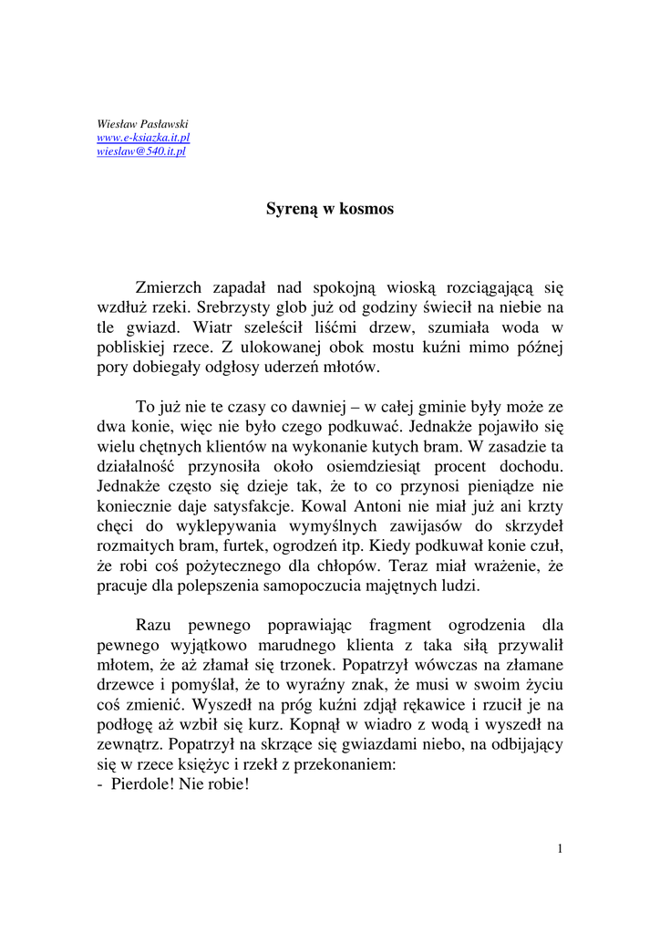 Wiesław Pasławski www.e-ksiazka.it.pl [email protected] Syreną w kosmos Zmierzch zapadał nad spokojną wioską rozciągającą się wzdłuż rzeki. Srebrzysty glob już od godziny świecił na niebie na tle gwiazd. Wiatr szeleścił liśćmi drzew, szumiała woda w pobliskiej rzece. Z ulokowanej obok mostu kuźni mimo późnej pory dobiegały odgłosy uderzeń młotów. To już nie te czasy co dawniej – w całej gminie były może ze dwa konie, więc nie było czego podkuwać. Jednakże pojawiło się wielu chętnych klientów na wykonanie kutych bram. W zasadzie ta działalność przynosiła około osiemdziesiąt procent dochodu. Jednakże często się dzieje tak, że to co przynosi pieniądze nie koniecznie daje satysfakcje. Kowal Antoni nie miał już ani krzty chęci do wyklepywania wymyślnych zawijasów do skrzydeł rozmaitych bram, furtek, ogrodzeń itp. Kiedy podkuwał konie czuł, że robi coś pożytecznego dla chłopów. Teraz miał wrażenie, że pracuje dla polepszenia samopoczucia majętnych ludzi. Razu pewnego poprawiając fragment ogrodzenia dla pewnego wyjątkowo marudnego klienta z taka siłą przywalił młotem, że aż złamał się trzonek. Popatrzył wówczas na złamane drzewce i pomyślał, że to wyraźny znak, że musi w swoim życiu coś zmienić. Wyszedł na próg kuźni zdjął rękawice i rzucił je na podłogę aż wzbił się kurz. Kopnął w wiadro z wodą i wyszedł na zewnątrz. Popatrzył na skrzące się gwiazdami niebo, na odbijający się w rzece księżyc i rzekł z przekonaniem: - Pierdole! Nie robie! 1 Idąc do domu zatrzymał się w krzakach za potrzebą. Udało mu się znaleźć w rowie jakiś kawałek gazety do podtarcia tyłka. Po przeterminowanej konserwie pędziło go już od samego rana. Na wszelki wypadek wziął ze sobą parę skrawków gazety i poszedł dalej. W domu znalazł się tuż przed północą. Po drodze wstąpił jeszcze do knajpy na parę piw. Gdy kładł się spać wziął do reki leżący na podłodze podarty kawałek gazety. Artykuł za pomocą wzorów-robaczków uzasadniał, że nic nie może poruszać się szybciej niż światło. Kowal Antoni przeczytał z uwagą artykuł po czym rzucił go na podłogę nie mogąc powstrzymać się od oburzenia. „Co za idiota stwierdził, że nic nie może poruszać się szybciej niż światło” Przecież najszybsza na świecie jest myśl!” I to powiedziawszy położył się na wznak i zasnął. Chrapiąc głośno spał snem sprawiedliwego aż do samego rana. Rano obudził się i stwierdził, że chce zostać podróżnikiem, ale nie takim zwykłym ziemskim bo takich wypraw w najodleglejsze lądy naoglądał się mnóstwo w telewizji, lecz kosmicznym. Chciał odkrywać nieznane planety i cywilizacje jeśli takowe istnieją. Polecieć tam gdzie nie stanęła jeszcze ludzka stopa a nawet nie sięgnął teleskop Hubbla. Skoro wymyślił już zasadę działania napędu – myśl – teraz pozostało mu rozejrzeć się za właściwym pojazdem. Do tego celu w sam raz nadawała się stojącą w sadzie pod gruszą syrena 105E z 1968 roku. Był to w zasadzie wrak samochodu, ale wystarczyło ją pomalować, wyjąć zbędny silnik spalinowy i już można było smagać nią w kosmos. Poruszony i zainspirowany tym pomysłem wysłał SMS do właściciela kuźni o treści: „Zwalniam się z obowiązku świadczenia pracy u Pana z powodu eksploracji kosmosu”. Ponieważ przez pół godziny nikt nie oddzwaniał odetchnął z ulgą, gdyż nie lubił 2 tłumaczyć się ze swoich decyzji. Dopiero po dwóch godzinach przyszedł SMS z krótkim „OK.”. W sytuacji gdy formalnościom stało się już zadość, mógł się zabrać do pracy. Przy pomocy konia przetransportował syrenę do szopy gdzie miała przejść szereg modernizacji umożliwiających podróżowanie do odległych galaktyk. Do wieczora samochód przeszedł gruntowną renowację: zostało uzupełnione ciśnienie powietrza w oponach. Wyczyszczono karoserie z rdzy i zabrudzeń a następnie pomalowano ją farbą podkładową. Silnik został wyciągnięty na zewnątrz a w jego miejscu powstał luk bagażowy z wydzieloną przestrzenią na próbki materiałów. Chłodnica też została usunięta a w jej miejsce włożono ołowianą płytę, która miała chronić przed promieniowaniem kosmicznym. W pojemniku na płyn do spryskiwaczy znalazł się sok malinowy, który miał wiązać cząsteczki pyłu kosmicznego zanim opadną na szybę. Z przodu samochodu kowal Antoni przytwierdził długi na kilka metrów metalowy szpikulec ze wzmocnionym diamentami ostrzem. Miał to być rozłupywacz asteroid i meteorów, które mogły stanąć na drodze rozpędzonej do niewiarygodnej prędkości syrenie. Czas przystąpić do budowy układu napędowego. W tym celu Antoni przyczepił do sufitu cztery miednice tak, aby siedzący w samochodzie ludzie mieli je tuż nad głowami. Miały one za zadanie zbierać myśli. Od każdej z nich biegła miedziana rurka. Wszystkie one dochodziły do jednego miejsca – akceleratora fal mózgowych. Akcelerator łączył się z zamocowanym na dachu działem synapsowym, które pod wypływem wysokiego ciśnienia nagromadzonych myśli wystrzeliwało w kierunku konkretnego obiektu kotwice neuronową a następnie transformator korowy zwiększał amplitudę myśli zmniejszając jednocześnie odległość miedzy falami co powodowało skrócenie drogi między kotwicą a samochodem, czyli krótko mówiąc kotwica przyciągała samochód. 3 Uff! Zawiłe trochę. Antoni prosty człowiek sam tego nie wymyślił – znalazł ten schemat na kartce z kalendarza Zakonu Bernardynów z dnia 8 kwietnia 1962 roku. Pod wieczór samochód był już przystosowany do dalekich podróży kosmicznych. Pomyśleć tylko, że dla NASA przez kilka lat pracowało czterysta tysięcy osób żeby przesłać człowieka bagatela – na księżyc. Ponieważ samochód był już gotów, jedyne co pozostało, to skompletować załogę. Jeśli napędem ma być 