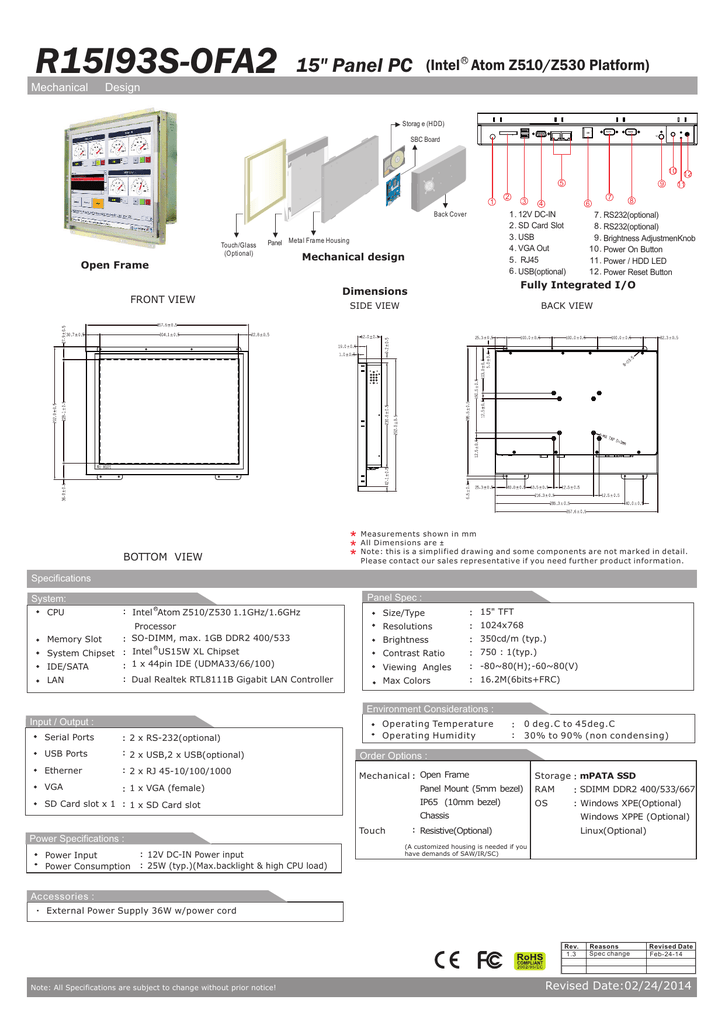 R15I93S-OFA2 Mechanical (Intel R Atom Z510/Z530 Platform) 15" Panel PC Design Storag e (HDD) SBC Board 5 1 Panel Metal Frame Housing Open Frame Mechanical design FRONT VIEW BOTTOM VIEW 3 6 4 1. 12V DC-IN 2. SD Card Slot 3. USB 4. VGA Out 5. RJ45 6. USB(optional) Back Cover Touch/Glass (Optional) 2 9 7 10 12 11 8 7. RS232(optional) 8. RS232(optional) 9. Brightness AdjustmenKnob 10. Power On Button 11. Power / HDD LED 12. Power Reset Button Fully Integrated I/O Dimensions SIDE VIEW BACK VIEW Measurements shown in mm * All Dimensions are ± * Note: is a simplified drawing and some components are not marked in detail. * Pleasethis contact our sales representative if you need further product information. Specifications Panel Spec : System: R CPU : Intel Atom Z510/Z530 1.1GHz/1.6GHz Size/Type : 15" TFT Resolutions : 1024x768 Memory Slot Processor : SO-DIMM, max. 1GB DDR2 400/533 Brightness : 350cd/m (typ.) Contrast Ratio : 750 : 1(typ.) Viewing Angles : -80~80(H);-60~80(V) Max Colors : 16.2M(6bits+FRC) R System Chipset : Intel US15W XL Chipset : 1 x 44pin IDE (UDMA33/66/100) IDE/SATA LAN : Dual Realtek RTL8111B Gigabit LAN Controller Environment Considerations : Input / Output : Serial Ports : 2 x RS-232(optional) USB Ports : 2 x USB,2 x USB(optional) Etherner : 2 x RJ 45-10/100/1000 VGA : 1 x VGA (female) Operating Temperature Operating Humidity : : 0 deg.C to 45deg.C 30% to 90% (non condensing) Order Options : Mechanical : Open Frame Panel Mount (5mm bezel) IP65 (10mm bezel) SD Card slot x 1 : 1 x SD Card slot Storage : mPATA SSD RAM : SDIMM DDR2 400/533/667 OS : Windows XPE(Optional) Chassis Touch Power Specifications : Power Input Power Consumption : 12V DC-IN Power input : 25W (typ.)(Max.backlight & high CPU load) Windows XPPE (Optional) : Resistive(Optional) Linux(Optional) (A customized housing is needed if you have demands of SAW/IR/SC) Ac cessories : . External Power Supply 36W w/power cord Rev. 1.3 Note: All Specifications are subject to change without prior notice! Reasons Spec change Revised Date Feb-24-14 Revised Date:02/24/2014