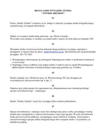 REGULAMIN WYNAJMU STUDIA “ STUDIO ARLEKIN” §1 Firma „Studio Arlekin” świadczy m.in. usługi w zakresie wynajmu studia fotograficznego, montażowego, do nagrań lektorskich. §2 Opłaty za wynajem studia będą naliczane wg. Oferty-Cennika. Wszystkie ceny podane w cenniku są cenami netto i należy do nich doliczyć podatek VAT. §3 Wynajmu studia i rezerwacji można dokonać drogą mailową wysyłając zapytanie o dostępność w danym dniu na adres: [email protected] lub telefonicznie od poniedziałku do piątku 501-751-963. 1. Wynajmujący zobowiązuje się udostępnić Najmującemu studio w godzinach ustalonych w rezerwacji. 2. Najmujący może wydłużyć czas najmu studia w trakcie sesji za zgodą Wynajmującego. Opłata będzie naliczana za każdą kolejną rozpoczętą godzinę wg. Cennika. §4 Studio znajduje się w Krakowie przy ul. Wieniawskiego 58 i jest dostępne po wcześniejszym zarezerwowaniu jak w pkt. 3. §5 Najemca jest zobowiązany do zapoznania się z Regulaminem oraz instrukcją obsługi sprzętu oświetleniowego – studyjnego. §6 Studio “Studio Arlekin” może być wynajęte tylko osobom pełnoletnim. §7 Sprzęt oświetleniowy i studyjny może być obsługiwany przez osoby, posiadające wiedzę techniczną i umiejętności z zakresu korzystania z tego typu sprzętu. W razie stwierdzenia braku powyższych kwalifikacji, wynajmujący może odmówić wydania, korzystania z zarezerwowanego sprzętu studia fotograficznego lub wynajmie studo z Asystentem, za dodatkową opłatą. §8 Wynajęty sprzęt może być przez Najemcę wykorzystany jedynie zgodnie z przeznaczeniem i załączoną instrukcją obsługi. Ewentualne wykorzystanie sprzętu w sposób odbiegający od powyższej zasady, skutkuje odmową jego dalszego używania bez zwrotu uiszczonej za jego wynajem ceny. §9 Wynajmujący nie odpowiada za szkody po stronie najemcy lub osób z nim współpracujących, związane z wykorzystaniem wynajmowanego sprzętu jak też następstwa nieszczęśliwych wypadków z udziałem osób biorących udział w pracach. §10 1. Czas trwania wynajęcia studia fotograficznego wraz ze sprzętem liczony jest od godziny potwierdzonej rezerwacją (umowa wynajęcia) do momentu opuszczenia studia przez ostatniego uczestnika sesji. 2. Sprzęt oświetleniowy oraz pozostałe wyposażenie należy zwrócić w takim stanie jak przed rozpoczęciem użytkowania. 3. Sprzęt fotograficzny (aparat, obiektywy itp.) nie wchodzi w zakres podstawowego wyposażenia studia. Sprzęt ten może zostać wynajęty na życzenie Najemcy, po uzyskaniu zgody Wynajmującego. Wynajmujący ma prawo odmówić wynajęcia sprzętu fotograficznego. 4. Wyjmujący zobowiązuje się wynajmować sprzęt sprawny technicznie. 5. Najemca zobowiązuje się wykorzystywać wynajęty sprzęt zgodnie z jego przeznaczeniem i zasadami bezpieczeństwa oraz dbać, aby powierzony mu sprzęt nie uległ uszkodzeniu z winy Najemcy lub osób trzecich obecnych na sesji (modelek, wizażystów, asystentów). Sprzęt oświetleniowy oraz pozostałe wyposażenie należy zwrócić w takim stanie jak przed rozpoczęciem użytkowania. Najemca zobowiązuje się do pokrycia kosztów ewentualnych szkód spowodowanych przez Najemcę lub osoby trzecie przebywające w studio podczas najmu. 6. Najemca zobowiązuje się pokryć koszty zużycia (ubrudzenia, zniszczenia) tła zgodnie z Cennikiem. §11 Wynajmujący zastrzega sobie możliwość przerwania wynajęcia studia fotograficznego ze sprzętem oświetleniowym w przypadku gdy prowadzone z jego wykorzystaniem działania związane byłyby z treściami uznanymi za zakazane w obliczu polskiego prawa. §12 “Studio Arlekin” zastrzega sobie możliwość zmiany niniejszego regulaminu. §13 “Studio Arlekin” dokłada wszelkich starań w celu ochrony danych osobowych uczestników, użytkowników, a także zobowiązuje się nie udostępniać tych danych podmiotom trzecim. §14 Niniejszy Regulamin obowiązuje od 1 stycznia 2015 roku.