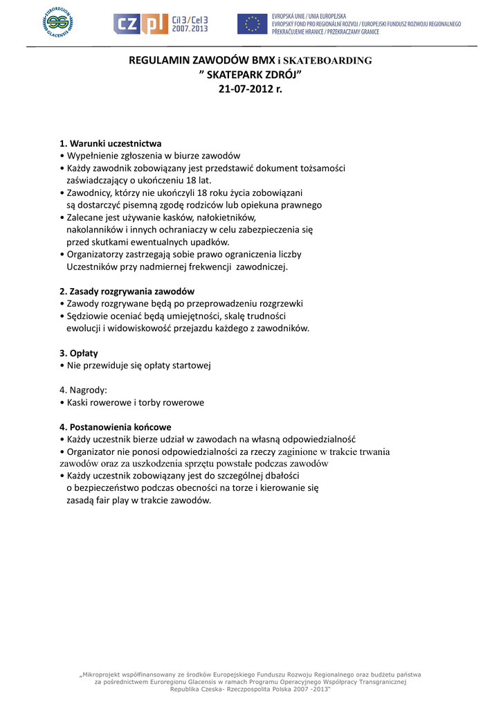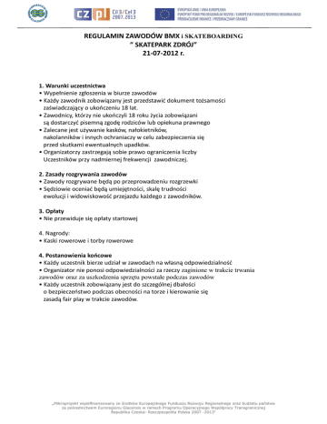 REGULAMIN ZAWODÓW BMX i SKATEBOARDING ” SKATEPARK ZDRÓJ” 21-07-2012 r. 1. Warunki uczestnictwa • Wypełnienie zgłoszenia w biurze zawodów • Każdy zawodnik zobowiązany jest przedstawić dokument tożsamości zaświadczający o ukończeniu 18 lat. • Zawodnicy, którzy nie ukończyli 18 roku życia zobowiązani są dostarczyć pisemną zgodę rodziców lub opiekuna prawnego • Zalecane jest używanie kasków, nałokietników, nakolanników i innych ochraniaczy w celu zabezpieczenia się przed skutkami ewentualnych upadków. • Organizatorzy zastrzegają sobie prawo ograniczenia liczby Uczestników przy nadmiernej frekwencji zawodniczej. 2. Zasady rozgrywania zawodów • Zawody rozgrywane będą po przeprowadzeniu rozgrzewki • Sędziowie oceniać będą umiejętności, skalę trudności ewolucji i widowiskowość przejazdu każdego z zawodników. 3. Opłaty • Nie przewiduje się opłaty startowej 4. Nagrody: • Kaski rowerowe i torby rowerowe 4. Postanowienia końcowe • Każdy uczestnik bierze udział w zawodach na własną odpowiedzialność • Organizator nie ponosi odpowiedzialności za rzeczy zaginione w trakcie trwania zawodów oraz za uszkodzenia sprzętu powstałe podczas zawodów • Każdy uczestnik zobowiązany jest do szczególnej dbałości o bezpieczeństwo podczas obecności na torze i kierowanie się zasadą fair play w trakcie zawodów. „Mikroprojekt współfinansowany ze środków Europejskiego Funduszu Rozwoju Regionalnego oraz budżetu państwa za pośrednictwem Euroregionu Glacensis w ramach Programu Operacyjnego Współpracy Transgranicznej Republika Czeska- Rzeczpospolita Polska 2007 -2013“