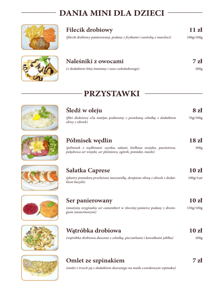 DANIA MINI DLA DZIECI Filecik drobiowy (filecik drobiowy panierowany, podany z frytkami i surówką z marchwi) Naleśniki z owocami (z dodatkiem bitej śmietany i sosu czekoladowego) 11 zł 100g/100g 7 zł 200g PRZYSTAWKI Śledź w oleju 8 zł (filet śledziowy a’la matijas podawany z posiekaną cebulką z dodatkiem oliwy z oliwek) 70g/100g Półmisek wędlin 18 zł (półmisek z wędlinami: szynka, salami, kiełbasa swojska, pasztetowa, polędwica ser wiejski, ser pleśniowy, ogórek, pomidor, masło) 300g Sałatka Caprese 10 zł (plastry pomidora przełożone mozzarellą, skropione oliwą z oliwek z dodatkiem bazylii) 100g/1szt Ser panierowany 10 zł (smażony oryginalny ser camembert w złocistej panierce podany z dresingiem żurawinowym) Wątróbka drobiowa (wątróbka drobiowa duszona z cebulką, pieczarkami i kawałkami jabłka) Omlet ze szpinakiem (omlet z trzech jaj z dodatkiem duszonego na maśle czosnkowym szpinaku) 150g/100g 10 zł 200g 7 zł ZUPY Rosół domowy z makaronem 6 zł (wywar z kury wiejskiej z dodatkiem wołowiny i jarzyn, podany z makaronem nitki) 250ml Zupa pomidorowa 6 zł (tradycyjna zupa pomidorowa zabielana wiejską śmietaną, podana z ryżem) 250ml Barszcz z pasztecikiem francuskim 8 zł (barszcz czerwony czysty podany z pasztecikiem z ciasta francuskiego nadziewany kapustą i mięsem) 250ml/100g Wiosenny krem z brokuł 8 zł (zupa krem z brokuł zabielana wiejską śmietaną) 250ml Krem grzybowy 8 zł (zupa krem z pieczarek zabielana wiejską śmietanką podawana z groszkiem ptysiowym) 250ml Żurek wiejski 8 zł (żur tradycyjny gotowany na wędzonce z dodatkiem kiełbasy jajka ziemniaków pokrojonych w kostkę) 350ml Flaczki (flaki wołowe przyrządzone według staropolskiej receptury na życzenie Klienta posypane wiórkami sera żółtego) 12 zł 350ml SAŁATKI Pomidor z fetą 10 zł (kostka z pomidora podana z serem feta, skropiona oliwą z oliwek) 100g/50g Sałata wiosenna (pomidor, ogórek, cebulka, papryka skropione sosem winegret z dodatkiem fety) Sałatka z kiełkami pora (kiełki pora, jajo na twardo, ogórek konserwowy, groszek konserwowy z sosem majonezowym podana z porcją pieczywa czosnkowego) Sałatka Carni (kapusta pekińska, ogórek zielony, papryka świeża, oliwki czarne, cebula, podana z grillowanymi kawałkami polędwiczki wieprzowej i porcją pieczywa czosnkowego) Sałatka z rukoli (rukola, pomidor wędzony, ogórek zielony, sos winegret) 8 zł 200g 14 zł 100g/150g 19 zł 250g/100g 15 zł 250g PIEROGI 15 zł Ruskie (pierogi z nadzieniem z sera i ziemniaków podane z kwaśną śmietaną) Z kapustą i grzybami (pierogi z kapustą i grzybami podane ze zrumienioną cebulką z boczkiem lub skropione oliwą z oliwek) 8 szt. 15 zł 8 szt. 15 zł Z mięsem (pierogi nadziewane mięsem podane ze zrumienioną cebulką z boczkiem lub skropione oliwą z oliwek) 8 szt. PLACKI ZIEMNIACZANE Placki tradycyjne (domowe placki ziemniaczane podane solo, ze śmietaną lub z cukrem) Placek a’la węgierski (tradycyjne placki ziemniaczane podane według wyboru Klienta: jeden duży lub cztery małe z sosem a’la bogracz) 8 zł 200g 20 zł 200g/200g RYBY Pstrąg z patelni (smażony na patelni pstrąg w całości podany z ćwiartką cytryny i rozetką masła czosnkowego) łosoś (dzwonek łososia grillowany podany z rozetką masła czosnkowego) 15 zł 1 szt 18 zł 200g MAKARONY Z sosem pieczarkowym (makaron tagliatella z sosem pieczarkowym zapieczony z serem, podany z porcją pieczywa czosnkowego) Bolognese (makaron spaghetti z włoskim sosem bolońskim z mięsem mielonym kawałkami pomidora, posypany parmezanem, podany z porcją pieczywa czosnkoweg) Tagliatella ze szpinakiem i kurczakiem (makaron tagliatella z sosem szpinakowym z dodatkiem fety, kurczaka grillowanego podany z porcją pieczywa czosnkowego) Makaron szefa (spaghetti z sosem bolońskim z dodatkiem fasoli, kukurydzy, oliwek papryki świeżej i świeżych pieczarek posypany parmezanem podany z porcją pieczywa czosnkowego) Spaghetti ze szpinakiem (makaron spaghetti podany ze smażonym szpinakiem z dodatkiem oliwy z oliwek, posypany parmezanem) 14 zł 300g/200g 18 zł 200g/200g 18 zł 300g/200g 20 zł 300g/200g 15 zł 350g MIĘSA Kurczak ze szpinakiem (grillowane kawałki fileta podane na duszonym szpinaku z jajkiem sadzonym) Pierś z kurczaka grillowana (grillowany filet z kurczaka z rozetką masła czosnkowego) 15 zł 150g/100g 12 zł 150g Nugetsy z kurczaka 12 zł (kawałki kurczaka w panierce podawane z dresingiem do wyboru) 150g/50g Stek wołowy 18 zł (grillowany stek z wołowiny podany z rozetką masła czosnkowego) Wołowina w zielonym pieprzu (stek wołowy duszony w aromatycznym zielonym pieprzu z dodatkiem wiejskiej śmietany) Polędwiczka wieprzowa w borowikach (polędwiczka wieprzowa duszona w borowikach 35b z dodatkiem wiejskiej śmietany) 200g 20 zł 200g/200ml 18 zł 150g/200ml Kotlet schabowy po kapitańsku 15 zł (kotlet schabowy panierowany w jajku i bułce tartej lub podany z dodatkiem pieczarek z patelni zapieczony serem wiejskim) 150g/50g Rolada śląska 18 zł (tradycyjna rolada z mięsa wołowego z farszem mięsno-warzywnym duszona w sosie własnym) 200g/200ml DODATKI Gotowane ziemniaki z wody lub puree, ryż biały, ryż z warzywami, kluski śląskie lub kopytka Frytowane frytki, frykasy, talary ziemniaczane Pieczywo mieszane pieczywo białe i ciemne Warzywa z pary brokuł, kalafior, marchew i fasola z pary według wyboru Klienta razem lub osobno, z masłem i zasmażką z bułki tartej Warzywa z grilla pieczarki, plastry marchwi, papryki i krążki cebuli przyrządzone na grillu Kapusty kapusta biała zasmażana lub kapusta czerwona duszona Surówki surówka z kapusty białej, czerwonej, marchewki kapusty pekińskiej, buraczki Kiełki z patelni miks kiełków usmażonych na maśle 5 zł 200g 6 zł 200g 5 zł 150g 6 zł 200g 6 zł 200g 6 zł 200g 6 zł 150g 6 zł 100g Dresingi 5 zł Sosy ciepłe 5 zł dresing do wyboru Klienta: winegret, tzatziki, pomidorowy, diablo mazursk