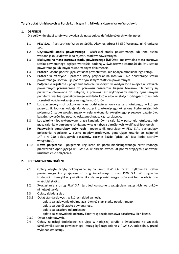 Taryfa opłat lotniskowych w Porcie Lotniczym im. Mikołaja Kopernika we Wrocławiu 1. DEFINICJE Dla celów niniejszej taryfy wprowadza się następujące definicje użytych w niej pojęć: 1.1 1.2 1.3 1.4 1.5 1.6 1.7 1.8 1.9 1.10 2. PLW S.A. - Port Lotniczy Wrocław Spółka Akcyjna, adres: 54-530 Wrocław, ul. Graniczna 190. Użytkownik statku powietrznego - właściciel statku powietrznego lub inna osoba wpisana jako użytkownik do rejestru statków powietrznych. Maksymalna masa startowa statku powietrznego (MTOM) - maksymalna masa startowa statku powietrznego będąca wartością podaną w świadectwie zdatności do lotu statku powietrznego lub innym równorzędnym dokumencie. Pasażer - osoba podróżująca statkiem powietrznym, nie będąca członkiem jego załogi. Pasażer w tranzycie - pasażer, który przyleciał na lotnisko i nie opuszczając statku powietrznego, kontynuuje podróż tym samym statkiem powietrznym. Połączenie regularne - połączenie lotnicze, w którym w każdym locie miejsca w statkach powietrznych przeznaczone do przewozu pasażerów, bagażu, towarów lub poczty są publicznie oferowane do nabycia, a przewóz jest wykonywany między tymi samymi punktami według opublikowanego rozkładu lotów albo w stałych odstępach czasu lub z częstotliwością wskazującą na regularność lotów. Lot czarterowy - lot dokonywany na podstawie umowy czarteru lotniczego, w którym przewoźnik lotniczy oddaje do dyspozycji czarterującego określoną liczbę miejsc lub pojemność statku powietrznego w celu wykonania określonego przewozu pasażerów, bagażu, towarów lub poczty, wskazanych przez czarterującego. Lot szkolny - lot wykonywany przez kandydatów na członków personelu lotniczego lub przez członków personelu lotniczego w celu nabycia określonych kwalifikacji lotniczych. Przewoźnik generujący duży ruch - przewoźnik operujący w PLW S.A., obsługujący połączenia regularne w ruchu międzynarodowym, generujące rocznie co najmniej „n" x 4 250 odlatujących pasażerów rocznie każde (gdzie „n" jest liczbą startów w tygodniu). Nowe połączenie - połączenie regularne do portu nieobsługiwanego przez żadnego przewoźnika operującego w PLW S.A. w okresie dwóch lat poprzedzających planowane uruchomienie połączenia. POSTANOWIENIA OGÓLNE 2.1 2.2 2.3 2.3.1 2.3.2 2.4 Opłaty objęte taryfą dokonywane są na rzecz PLW S.A. przez użytkownika statku powietrznego korzystającego z usług świadczonych przez PLW S.A. W przypadku trudności z identyfikacją użytkownika statku powietrznego, opłatami będzie obciążony właściciel statku. Skorzystanie z usług PLW S.A. jest jednoznaczne z przyjęciem wszystkich warunków niniejszej taryfy. Opłaty składają się z: Opłat standardowych, w których skład wchodzą: - opłata za lądowanie obejmująca również start statku powietrznego, - opłata za postój statku powietrznego, - opłata za pasażera odlatującego, - opłata za zapewnienie ochrony i kontrolę bezpieczeństwa pasażerów i ich bagażu. Opłat dodatkowych. Opłaty za usługi dodatkowe, nie ujęte w niniejszej taryfie, a świadczone na wniosek użytkownika statku powietrznego, muszą być uzgodnione z PLW S.A. oddzielnie, przed wykonaniem usługi. 2.5 2.6 3. Stawki opłat podane w niniejszej taryfie są stawkami netto, do których zostanie doliczony podatek VAT, w wysokości określonej odrębnymi przepisami. Stawki opłat są określone w złotych polskich (PLN). OPŁATY STANDARDOWE 3.1 Opłata za lądowanie statku powietrznego Opłata pobierana jest za każde lądowanie statku powietrznego na lotnisku. Opłata obejmuje również start statku powietrznego. LĄDOWANIE POWIETRZNEGO STATKU Ruch krajowy i międzynarodowy Maksymalna masa startowa statku powietrznego (MTOM) STAWKA [PLN] do 3 t 80,00 powyżej 3 do 10 t 275,00 powyżej 10 do 30 t 600,00 powyżej 30 do 50 t 975,00 powyżej 50 do 100 t 1 560,00 powyżej 100 do 150 t 2 500,00 powyżej 150 do 250 t 5 000,00 powyżej 250 t 20 000,00 Dla śmigłowców opłata za lądowanie wynosi 50 % stawki określonej w powyższej tabeli. 3.2 Opłata za postój statku powietrznego Opłata pobierana jest za postój statku powietrznego na wyznaczonej do tego powierzchni lotniska. Czasem postoju statku powietrznego jest czas od momentu znalezienia się na płycie postojowej do momentu jej opuszczenia przez statek powietrzny. OPŁATA POSTOJOWA (za każdą rozpoczętą tonę maksymalnej masy startowej (MTOM) 3.3 STAWKA [PLN] Pierwsze 4 godziny postoju 0,00 Każde rozpoczęte 24 godziny 6,00 Opłata za pasażera odlatującego Opłata za pasażera odlatującego pobierana jest za każdego pasażera odlatującego. PASAŻER ODLATUJĄCY Ruch krajowy i międzynarodowy STAWKA [PLN] 32,00 Opłacie nie podlegają: - pasażerowie w tranzycie, - dzieci do lat 2, nieuprawnione do zajmowania miejsca pasażerskiego w samolocie. 3.4 Opłata za zapewnienie ochrony i kontrolę bezpieczeństwa pasażerów i ich bagażu. Opłata za zapewnienie ochrony i kontrolę bezpieczeństwa pasażerów i ich bagażu pobierana jest za każdego pasażera odlatującego. PASAŻER ODLATUJĄCY Ruch krajowy i międzynarodowy STAWKA [PLN] 4,85 Opłacie nie podlegają: - pasażerowie w tranzycie, - dzieci do lat 2, nieuprawnione do zajmowania miejsca pasażerskiego w samolocie. 4. ODMOWA ŚWIADCZENIA USŁUG 4.1 5. PLW S.A. może odmówić świadczenia usług usługobiorcom, którzy nie respektują warunków niniejszej taryfy, w tym nieterminowo regulują swoje płatności. OPŁATY DODATKOWE 5.1 Usuwanie zanieczyszczeń z nawierzchni lotniskowych Opłaty pobiera się za usuwanie z nawierzchni lotniskowych zanieczyszczeń spowodowanych przez użytkowników lotniska w następującej wysokości za każde rozpoczęte 10m²: 5.2 RODZAJ OPŁATY Usunięcie rozlewiska materiałów pędnych i smarów STAWKA [PLN] 2 000,00 Usunięcie innych zanieczyszczeń 1 000,00 Dodatkowa ochrona statków powietrznych w czasie postoju Opłaty pobiera się za nie