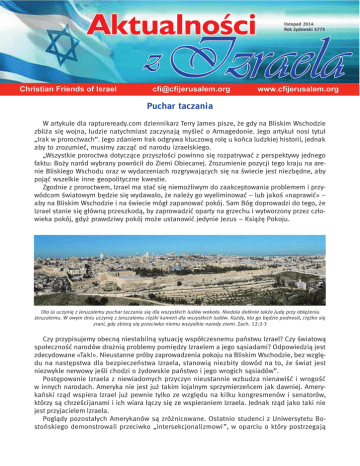 listopad 2014 Rok żydowski 5775 Puchar taczania W artykule dla raptureready.com dziennikarz Terry James pisze, że gdy na Bliskim Wschodzie zbliża się wojna, ludzie natychmiast zaczynają myśleć o Armagedonie. Jego artykuł nosi tytuł „Irak w proroctwach”. Jego zdaniem Irak odgrywa kluczową rolę u końca ludzkiej historii, jednak aby to zrozumieć, musimy zacząć od narodu izraelskiego. „Wszystkie proroctwa dotyczące przyszłości powinno się rozpatrywać z perspektywy jednego faktu: Boży naród wybrany powrócił do Ziemi Obiecanej. Zrozumienie pozycji tego kraju na arenie Bliskiego Wschodu oraz w wydarzeniach rozgrywających się na świecie jest niezbędne, aby pojąć wszelkie inne geopolityczne kwestie. Zgodnie z proroctwem, Izrael ma stać się niemożliwym do zaakceptowania problemem i przywódcom światowym będzie się wydawało, że należy go wyeliminować – lub jakoś «naprawić» – aby na Bliskim Wschodzie i na świecie mógł zapanować pokój. Sam Bóg doprowadzi do tego, że Izrael stanie się główną przeszkodą, by zaprowadzić oparty na grzechu i wytworzony przez człowieka pokój, gdyż prawdziwy pokój może ustanowić jedynie Jezus – Książę Pokoju. Oto Ja uczynię z Jeruzalemu puchar taczania się dla wszystkich ludów wokoło. Niedola dotknie także Judę przy oblężeniu Jeruzalemu. W owym dniu uczynię z Jeruzalemu ciężki kamień dla wszystkich ludów. Każdy, kto go będzie podnosił, ciężko się zrani, gdy zbiorą się przeciwko niemu wszystkie narody ziemi. Zach. 12:2-3 Czy przypisujemy obecną niestabilną sytuację współczesnemu państwu Izrael? Czy światową społeczność narodów drażnią problemy pomiędzy Izraelem a jego sąsiadami? Odpowiedzią jest zdecydowane «Tak!». Nieustanne próby zaprowadzenia pokoju na Bliskim Wschodzie, bez względu na następstwa dla bezpieczeństwa Izraela, stanowią niezbity dowód na to, że świat jest niezwykle nerwowy jeśli chodzi o żydowskie państwo i jego wrogich sąsiadów”. Postępowanie Izraela z niewiadomych przyczyn nieustannie wzbudza nienawiść i wrogość w innych narodach. Ameryka nie jest już takim lojalnym sprzymierzeńcem jak dawniej. Amerykański rząd wspiera Izrael już pewnie tylko ze względu na kilku kongresmenów i senatorów, którzy są chrześcijanami i ich wiara łączy się ze wspieraniem Izraela. Jednak rząd jako taki nie jest przyjacielem Izraela. Poglądy pozostałych Amerykanów są zróżnicowane. Ostatnio studenci z Uniwersytetu Bostońskiego demonstrowali przeciwko „intersekcjonalizmowi”, w oparciu o który postrzegają Izrael jako uosobienie zła. Intersekcjonalizm to studium przecinania się pomiędzy formami lub systemami opresji, dominacji czy dyskryminacji. Można to na przykład zastosować do czarnoskórych osób płci żeńskiej. Według nich przecinają się tutaj dwie formy opresji. Ci socjaliści „intersekcjonalistyczni” bardo ostro krytykują Izrael. Na jednym z ostatnich zdjęć widać kobietę trzymającą plakat z napisem: „Przez ostatnie 14 lat Izrael codziennie zabijał jedno palestyńskie dziecko”. Autorzy tych nonsensów zdają się zapominać, że dzieci te przypadkowo (a może celowo) znalazły się pomiędzy dwoma grupami dorosłych, które toczą ze sobą wojnę. Czasami dzieci wysyłane są przodem, a terroryści ukrywają się za ich plecami. Zazwyczaj gdy toczy się wojna, ludzie próbują trzymać dzieci jak najdalej od niej. Jednak w przypadku wojny pomiędzy Izraelem a Palestyńczykami, a zwłaszcza Hamasem, dorośli celowo wystawiają dzieci na niebezpieczeństwo. Niestety dziewczyna, która trzyma ten plakat, nie ma najmniejszego pojęcia, co propaguje. Oby Bóg wybaczył jej te błędne przekonania. Jeśli chodzi o Bliski Wschód, to Terry James skupia się na Iraku, ponieważ uważa on, że Babilon w Iraku jest tym „Wielkim Babilonem” z Ks. Objawienia 17–18. Osobiście nie jestem o tym przekonana. Miasto z Objawienia to nie „Babilon”, lecz „Wielki Babilon”, który leży nad rozległymi wodami. Może to być równie dobrze Nowy Jork, chociaż nie upieram się przy tym. Inni sądzą, że może się on znajdować w Arabii Saudyjskiej. ISIS pragnie walczyć z chrześcijanami w Armagedonie Jeden z ostatnio nakręconych filmów pokazuje bojowników ISIS zapraszających chrześcijan z Europy Zachodniej, aby przybyli i walczyli z nimi w miejscu zwanym Dabik, który jest ich wersją Armagedonu. Mówca w tym filmie przekonuje, że ISIS zwycięży, a wszyscy ci chrześcijanie zostaną zabici. A gdy już ISIS zwycięży w tej bitwie, jak mówią, pomaszerują na Jerozolimę. Bojownicy ISIS może i wiedzą o bitwie Armagedon, ale najwyraźniej przeoczają dwie rzeczy. Zgodnie z Objawieniem 16:14 ci, którzy pójdą zaprosić królów całego świata na Armagedon, to „duchy demonów”. Czy ISIS chce występować w takiej roli? Poza tym ludzie ci zaproszeni są do tego miejsca, aby można ich było zniszczyć. Jeżeli ktokolwiek zostanie zniweczony na Armagedonie, będzie to ISIS lub przynajmniej ISIS będzie wśród tych, którzy zostaną zniweczeni. Osobiście nie mam nic dobrego do powiedzenia o tej grupie fanatyków. Tak naprawdę nawet gdybym powiedziała, że są opętani przez demony, nie byłoby to wystarczająco mocne. To oczywiste, że są oni wrogami Boga. Ich ostatecznym celem jest zniszczenie Izraela. Premier Netanjahu wyraził ostatnio obawę, że Izrael może wkrótce stanąć wobec sytuacji, gdy zacznie graniczyć z państwem ISIS. Jednak jedyne państwo, które mogłoby i byłby skłonne zwalczyć ISIS – Stany Zjednoczone same borykają się z problemem bojowników ISIS na swoim terenie. Rosnąca liczba obywateli Stanów Zjednoczonych wyjeżdża i wstępuje w szeregi brutalnej armii ISIS. Rekrutów tych radykalizuje się na terenie Stanów. Mogą oni ewentualnie wrócić do swoich domów. W reportażu CBN można było usłyszeć: „Trudno sobie wyobrazić centrum Ameryki jak