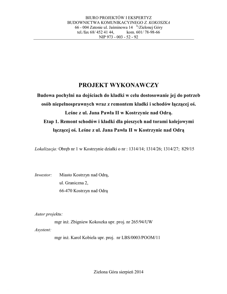 BIURO PROJEKTÓW I EKSPERTYZ BUDOWNICTWA KOMUNIKACYJNEGO Z. KOKOSZKA 66 - 004 Zatonie ul. Jaśminowa 14 k/Zielonej Góry tel./fax 68/ 452 41 44, kom. 601/ 78-98-66 NIP 973 - 003 - 52 - 92 PROJEKT WYKONAWCZY Budowa pochylni na dojściach do kładki w celu dostosowanie jej do potrzeb osób niepełnosprawnych wraz z remontem kładki i schodów łączącej oś. Leśne z ul. Jana Pawła II w Kostrzynie nad Odrą. Etap 1. Remont schodów i kładki dla pieszych nad torami kolejowymi łączącej oś. Leśne z ul. Jana Pawła II w Kostrzynie nad Odrą Lokalizacja: Obręb nr 1 w Kostrzynie działki o nr : 1314/14; 1314/26; 1314/27; 829/15 Inwestor: Miasto Kostrzyn nad Odrą, ul. Graniczna 2, 66-470 Kostrzyn nad Odrą Autor projektu: mgr inż. Zbigniew Kokoszka upr. proj. nr 265/94/UW Asystent: mgr inż. Karol Kobiela upr. proj. nr LBS/0003/POOM/11 Zielona Góra sierpień 2014 CZĘŚĆ OPISOWA Spis zawartości projektu 1. Podstawa opracowania 2. Założenia projektowe 3. Cel i zakres remontu 4. Opis istniejącej konstrukcji 5. Ocena stanu technicznego 6. Opis robót 7. Opis kładki po remoncie i warunki wykonania 8. Plan BiOZ 9. Uwagi 10. Uzgodnienia 11. Część rysunkowa OPIS TECHNICZNY Remont schodów i kładki dla pieszych nad torami kolejowymi łączącej oś. Leśne z ul. Jana Pawła II w Kostrzynie nad Odrą 1. Podstawa opracowania − Rozporządzenie MTiGM z dnia 30 maja 2000 r. w sprawie warunków technicznych, jakim powinny odpowiadać obiekty inżynierskie i ich usytuowanie (Dz. U. nr 63, poz. 735), − Rozporządzenie MTiGM z dnia 2 marca 1999 w sprawie warunków technicznych jakim powinny odpowiadać drogi publiczne i ich usytuowanie (Dz. U. nr 43, poz. 430), − mapa do celów opiniodawczych i jej weryfikacji przez uprawnionego geodetę w terenie, − pomiary inwentaryzacyjne, − oględziny obiektu, − opinia geotechniczna, − ustalenia z Inwestorem, − Ekspertyza techniczna kładki dla pieszych z grudnia 2010 r. opracowana przez inż. J. Daniela Dulnego. Normy i inne dokumenty: [1] Norma PN-85/S-10030. Obiekty mostowe. Obciążenia. [2] Norma PN- 66/B-02015. Mosty, wiadukty i przepusty. Obciążenia i oddziaływania. [3] Norma PN-91/S-10042. Obiekty mostowe. Konstrukcje betonowe, żelbetowe i sprężone. Projektowanie. [4] Norma PN-74/B-02480. Grunty budowlane. Podział, nazwy, symbole i określenia. [5] Głomb J., Drogowe budowle inżynierskie. WKiŁ, Warszawa 1988. [6] Madaj A., Wołowicki W., Budowa i utrzymanie mostów. WKiŁ, Warszawa 1995. [7] Rybak M., Obciążenia mostów. Komentarz do PN-85/S-10030. WKiŁ, W-wa 1989. [8] Rozp. Ministra Transportu i Gospodarki Morskiej w sprawie warunków technicznych, jakim powinny odpowiadać drogowe obiekty inżynierskie i ich usytuowanie, Dz.U.00.63.735 z dnia 30 maja 2000 r. 2. Założenia projektowe Prace projektowe były wykonywane w oparciu o ustalenia dokonane z Zamawiającym, oraz pomiary inwentaryzacyjne obiektu w terenie. Głównym założeniem przyjętym przed podjęciem prac projektowych było to, że efektem przeprowadzonych prac naprawczych będzie przywrócenie sprawności technicznej i wydłużenie okresu eksploatacji obiektu oraz poprawa bezpieczeństwa ruchu na obiekcie. 3. Cel i zakres remontu Zakres przewidzianego remontu kładki nie powoduje docelowo zmiany sposobu zagospodarowania terenu i użytkowania obiektu, nie zmienia jego formy i nie narusza planu miejscowego. Charakterystyczne parametry geometryczne takie jak światło, długość i szerokość kładki nie ulegają zmianie. Zakres remontu obejmuję wykonanie zabezpieczenia antykorozyjnego konstrukcji stalowej kładki oraz schodów, wymianę pokładu drewnianego, uzupełnienie ubytków materiałami typu PCC betonowych fundamentów, wykonanie balustrady mostowej oraz poprawę bezpieczeństwa na schodach poprzez montaż blach podstopnicowych. 4. Opis istniejącej konstrukcji Przedmiotowy obiekt to kładka dla pieszych dwuprzęsłowa nad torami kolejowymi łącząca os Leśne z ulicą Jana Pawła II w Kostrzynie nad Odrą. Ustrój nośny stanowią dźwigary kratowe o rozpiętościach teoretycznych Lt=19,57 m + 19,56 m oparte na słupach stalowych i fundamentach betonowych posadowionych bezpośrednio na gruncie. Do kładki dochodzą obustronnie schody o konstrukcji stalowej z pokładem drewnianym oparte na słupach stalowych i fundamentach betonowych posadowionych bezpośrednio na gruncie. 5. Ocena stanu technicznego Ogólnie można stwierdzić, że obiekt znajduje się w dostatecznej kondycji technicznej. Zachowana jest stateczność ogólna i miejscowa elementów konstrukcyjnych, brak odkształceń i przemieszczeń. Obiekt nie osiada, nie obraca się i jest stabilny. Kładka wykazuje uszkodzenia, których nie naprawienie spowoduje skrócenie okresu bezpiecznej eksploatacji. Zaobserwowano występowanie ubytków zabezpieczenia antykorozyjnego na kratownicach stalowych i filarach oraz powierzchniową korozję stali. Pokład drewniany kładki i schodów jest w nienajlepszym stanie technicznym i wymaga wymiany. Na betonowych fundamentach stwierdzono występowanie ubytków. Obiekt nie spełnia obecnych przepisów dotyczących wyposażenie obiektów mostowych. Brak w nim balustrady o normatywnej wysokości 1,3 m. 6. Opis robót budowlanych 6.1. Parametry kładki po wykonaniu remontu Obiekt będzie posiadał następujące parametry techniczne: − długość całkowita 68,83 m (bez zmian) − szerokość całkowita 3,30 m (bez zmian) − rozpiętość całkowita 19,57+19,56 (bez zmian) − światło poziome i pionowe 6.2. Kolejność prowadzenia prac budowlanych Wszystkie prace budowlane będą wykonywane w niżej przedstawionej kolejności: PRACE ROZBIÓRKOWE NA ISTNIEJĄCYM OBIEKCIE : bez zmian − zerwanie drewnianego pokładu kładki i schodów − rozbiórka istniejącej barierki PRACE MONTAŻOWE − wykonanie zabezpieczenia antykorozyjnego konstrukcji stalowej kładki i schodów, − montaż balustrady mostowej h=1,3 m, − montaż blach podstopnicowych, − wyko