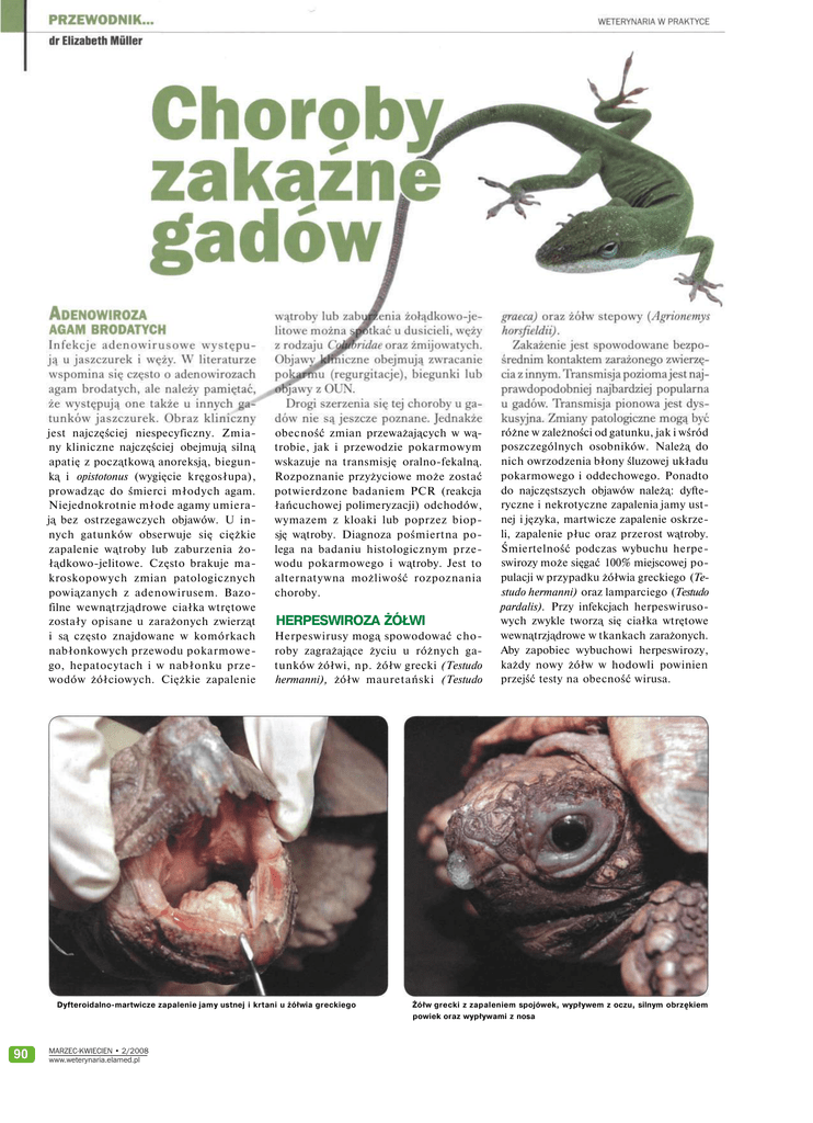 jest najczęściej niespecyficzny. Zmia ny kliniczne najczęściej obejmują silną apatię z początkową anoreksją, biegun ką i opistotonus (wygięcie kręgosłupa), prowadząc do śmierci młodych agam. Niejednokrotnie młode agamy umiera ją bez ostrzegawczych objawów. U in nych gatunków obserwuje się ciężkie zapalenie wątroby lub zaburzenia żołądkowo-jelitowe. Często brakuje ma kroskopowych zmian patologicznych powiązanych z adenowirusem. Bazofilne wewnątrzjądrowe ciałka wtrętowe zostały opisane u zarażonych zwierząt i są często znajdowane w komórkach nabłonkowych przewodu pokarmowe go, hepatocytach i w nabłonku prze wodów żółciowych. Ciężkie zapalenie obecność zmian przeważających w wą trobie, jak i przewodzie pokarmowym wskazuje na transmisję oralno-fekalną. Rozpoznanie przyżyciowe może zostać potwierdzone badaniem PCR (reakcja łańcuchowej polimeryzacji) odchodów, wymazem z kloaki lub poprzez biop sję wątroby. Diagnoza pośmiertna po lega na badaniu histologicznym prze wodu pokarmowego i wątroby. Jest to alternatywna możliwość rozpoznania choroby. HERPESWIROZA ŻÓŁWI Herpeswirusy mogą spowodować cho roby zagrażające życiu u różnych ga tunków żółwi, np. żółw grecki (Testudo hermanni), żółw mauretański (Testudo Dyfteroidalno-martwicze zapalenie jamy ustnej i krtani u żółwia greckiego 90 MARZEC-KWIECIEN • 2/2008 www.weterynaria.elamed.pl różne w zależności od gatunku, jak i wśród poszczególnych osobników. Należą do nich owrzodzenia błony śluzowej układu pokarmowego i oddechowego. Ponadto do najczęstszych objawów należą: dyfteryczne i nekrotyczne zapalenia jamy ust nej i języka, martwicze zapalenie oskrze li, zapalenie płuc oraz przerost wątroby. Śmiertelność podczas wybuchu herpeswirozy może sięgać 100% miejscowej po pulacji w przypadku żółwia greckiego (Testudo hermanni) oraz lamparciego (Testudo pardalis). Przy infekcjach herpeswirusowych zwykle tworzą się ciałka wtrętowe wewnątrzjądrowe w tkankach zarażonych. Aby zapobiec wybuchowi herpeswirozy, każdy nowy żółw w hodowli powinien przejść testy na obecność wirusa. Żółw grecki z zapaleniem spojówek, wypływem z oczu, silnym obrzękiem powiek oraz wypływami z nosa PRZEWODNIK... WETERYNARIA W PRAKTYCE Wątroba agamy brodatej - hepatocyty z dużymi ciałkami wtrętowymi wewnątrzjądrowymi bazofilów Język żółwia greckiego - komórki nabłonka z ciałkami wtrętowymi wewnątrzjądrowymi eozynofilowymi Trzustka węża boa z dużymi eozynofilowymi wewnątrzcytoplazmatycznymi ciałkami wtrę towymi Diagnoza może zostać potwierdzo na badaniem PCR wymazu pobrane go z gardła i języka lub badaniem PCR z tkanek (język, wątroba, śledziona, przełyk, jelito, krtań, płuca i mózg). Ba danie histologiczne z tych tkanek lub badanie cytologiczne wymazu z jamy ustnej jest inną możliwością poszukiwa nia ciałek wtrętowych. Wymaz powinien być pobrany ze zmienionego chorobo wo miejsca wilgotną, sterylną wymazówką. Zaraz po pobraniu materiał po winien być delikatnie rozsmarowany po odtłuszczonym mikroskopowym szkieł ku podstawowym. że objawy kliniczne mogą występować pojedynczo lub razem z innymi. Mykoplazmozę bierze się pod uwagę w rozpo znaniu różnicowym herpeswirusa oraz infekcji Pasteurella testudinis. Do zaka żenia mykoplazmozą dochodzi poprzez bezpośredni kontakt, zwłaszcza gdy u zwierzęcia występuje wypływ z nosa. Mycoplasma agassizii przylega do na błonka rzęskowato-śluzowego górne go odcinka układu oddechowego żół wi i powoduje poważne zaburzenie normalnej architektury tkanki oraz jej funkcji. Badanie kliniczne może nie ujawniać wszystkich objawów, takich jak: surowicze lub śluzowo-ropne wy pływy z nosa i oczu, obrzęk i zaczer wienienie spojówek oraz obrzęk powiek i okolicy przyocznej. Histologiczne zmiany mogą się dramatycznie różnić zaawansowaniem. Mogą być to wieloogniskowe lub ogniskowo rozszerzające się limfoidalne agregaty podnabłonkowe, naciek mieszanych komórek zapal nych, hiperplazja (przerost) komórek podstawowych, metaplazja komórek śluzowatych i metaplazja (przebudowa) nabłonka węchowego, w końcu erozja nabłonka migawkowego. D i a g n o z a m o ż e być p o s t a w i o n a na p o d s t a w i e wykrycia c h r o m o s o mu DNA mykoplazmy poprzez użycie techniki PCR z popłuczyn nosowych lub innej próbki. Popłuczyny nosowe powinny być pobrane do sterylnego zbiorniczka. MYKOPLAZMOZA ŻÓŁWI Mycoplasma agassizii jest bakterią po wodującą chorobę górnych dróg odde chowych (upper respiratory tract disease — URTD) u żółwi. Do objawów klinicz nych, które mogą rozwinąć się już po 2 tygodniach od zarażenia, zalicza się: wycieki z nosa, zapalenie spojówek, wypływ z oczu, obrzęk powiek i oko lic oczu. Dość ważnym faktem jest to, Boa constrictor z krwotocznym zapaleniem płuc i krwistym wypły wem z jamy ustnej PARAMYKSOWIROZA WĘŻY Paramyksowirusy są szczególnie powią zane z chorobami węży, a także jaszczu rek i żółwi. Wirus ten jest bardzo ważnym patogenem u żmijowatych, ale patolo giczne zmiany i przypadki śmiertelne zo stały także udokumentowane u innych gatunków węży, włączając rodziny: Elapidae, Colubridae, Boidae iPythonidae. Infekcja paramyksowirusowa powin na być brana pod uwagę u osobników gatunków podatnych, u których obser wuje się: wypływ z nosa, oddychanie otwartą jamą ustną, zbieranie się se rowatego wysięku w jamie ustnej oraz Boa constrictor z objawami ze strony OUN, utratą prawidłowych odruchów i zmęcze niem MARZEC-KWIECIEN • 2/2008 www.weterynaria.elamed.pl 91 PRZEWODNIK... ostre świsty oddechowe. W dodatku paramyksowiroza powinna być rozważana, gdy węże są wychudzone, tracą napięcie mięśniowe, nie mają siły się poruszać, poszukują ciepła, występują u nich drże nia głowy, zmęczenie, nawrotowe i niepoddające się leczeniu zapalenia płuc na