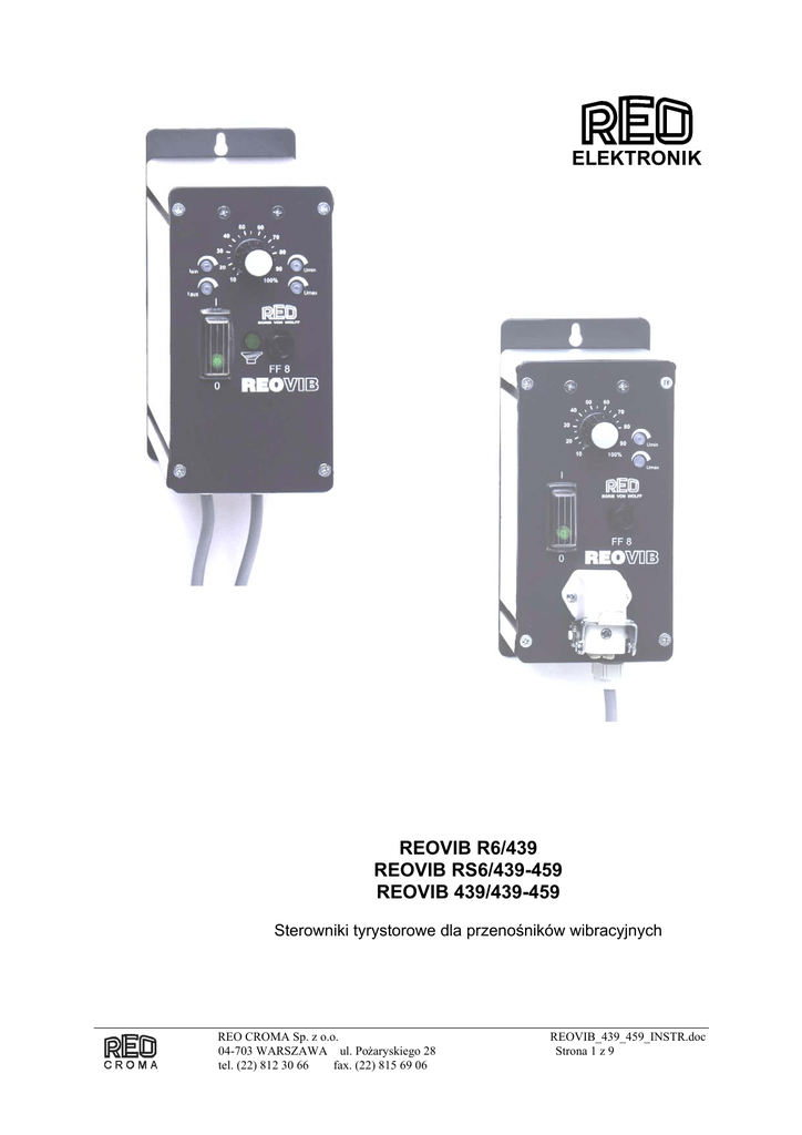 ELEKTRONIK REOVIB R6/439 REOVIB RS6/439-459 REOVIB 439/439-459 Sterowniki tyrystorowe dla przenośników wibracyjnych REO CROMA Sp. z o.o. 04-703 WARSZAWA ul. Pożaryskiego 28 tel. (22) 812 30 66 fax. (22) 815 69 06 REOVIB_439_459_INSTR.doc Strona 1 z 9 REOVIB R6/439 Instrukcja obsługi REOVIB R6/439 Sterownik tyrystorowy do regulacji przepustowości przenośników wibracyjnych Sterownik ten jest przeznaczony dla przenośników o mechanicznej częstotliwości drgań równej częstotliwości sieci zasilającej lub równej podwojonej częstotliwości sieci zasilającej. Odpowiada to 50 Hz lub 100 Hz czyli 3000 / 6000 cykli na minutę dla sieci 50 Hz. Wybór częstotliwości drgań dokonywany jest wewnętrznym przełącznikiem sterownika. Zakres roboczy zadawany potencjometrem znajdującym się na płycie czołowej sterownika może byc dopasowywany przez użytkownika do określonych zastosowań. Do tego celu przeznaczone są potencjometry dostrojcze Umin i Umax, dostępne z płyty czołowej. Jeżeli potencjometr zadający sygnał wyjściowy jest ustawiony na zero to potencjometrem dostrojczym Umin można ustawić minimalna wartość wyjściową odpowiadającą temu zerowemu położeniu potencjometru. W analogiczny sposób przy ustawieniu potencjometru zadającego na maksimum można potencjometrem dostrojczym Umax ustawić maksymalną wartość sygnału wyjściowego. W celu wyeliminowania udarów występujących przy załączaniu przenośnika sterownik został wyposażony w układ płynnego narastania napięcia wyjściowego (soft-start). Czas trwania tego płynnego rozruchu może być ustawiany wewnętrznie w zakresie od około 0.1 do 4 sekund. Funkcja ta może być zablokowana wewnętrznym przełącznikiem. Wyjściowy sygnał mocy może być załączany i wyłączany z nadrzędnego układu sterującego poprzez wykorzystanie wejścia blokującego. Sygnałem sterującym może być napięcie stałe 24 V lub zewnętrzny zestyk. Zaciski przeznaczone do dołączenia tego zestyku sterującego maja potencjał sieci zasilającej i należy stosować odpowiednie przewody i przełączniki, dostosowane do takiego napięcia roboczego. Przyłączenie dla 24V DC jest separowane od sieci. Dane techniczne Typ REOVIB R6/439 Napięcie zasilające 230 V, + 6% / - 10% Napięcie wyjściowe 40 - 210 V Prąd wyjściowy 0,2 - 6 A Częstotliwość drgań przenośnika 50 Hz / 100 Hz Wejście sterujące 24 V, DC / Zestyk Płynny rozruch (Soft-start) 0,1 - 4 s Obudowa IP 54 Zakres temperatur otoczenia 0 - 45 °C Wymiary (wysokość x szerokość 205 x 90 x 50 mm x głębokość) Zgodność z normami EN 50081-2, EN 50082-2, VDE 0160, VGB 4 Sposób zamawiania REOVIB R6/439 ID-No. 43947 wykonanie z kablem wyjściowym ID-No. 43948 wykonanie z gniazdem wyjściowym REO CROMA Sp. z o.o. 04-703 WARSZAWA ul. Pożaryskiego 28 tel. (22) 812 30 66 fax. (22) 815 69 06 95 REOVIB_439_459_INSTR.doc Strona 2 z 9 REOVIB R6/439 Instrukcja obsługi Wymiary i połączenia zewnętrzne 50 90 5,5 Ø5 13 Wyjście dla nastawy 0% Ø8 Wyjście dla nastawy 100% 40 50 30 60 Zadawanie 80 10 90 0 I Wyłącznik sieciowy ! 70 20 Umin 100 % Umax Dla wersji z gniazdem wyjściowym kabel nie jest dostarczany FF8 205 UWAGA ! W celu zachowania stopnia ochrony, po dokonaniu nastawy należy założyć zaślepki ! O . . . Ø5 6,5 15 około 2m ca. 2m Połaczenie z cewką elektromagnesu (brązowy/niebieski) i połaczenie ochronne (żółto-zielony) Zaślepka Połączenia gniazda 1 2 PE 3 Cewka elektromagnesu REO CROMA Sp. z o.o. 04-703 WARSZAWA ul. Pożaryskiego 28 tel. (22) 812 30 66 fax. (22) 815 69 06 REOVIB_439_459_INSTR.doc Strona 3 z 9 REOVIB R6/439 Instrukcja obsługi REOVIB RS6/439 - 459 Sterownik tyrystorowy do regulacji przepustowości przenośników wibracyjnych zintegrowany z układem regulacji przesuwu Sterownik jest przeznaczony dla przenośników o mechanicznej częstotliwości drgań równej częstotliwości sieci zasilającej lub podwojonej częstotliwości sieci zasilającej. Odpowiada to 50 Hz lub 100 Hz czyli 3000 / 6000 cykli na minutę dla sieci 50 Hz. Wybór częstotliwości drgań dokonywany jest wewnętrznym przełącznikiem przenośnika. Zakres roboczy zadawany jest potencjometrem znajdującym się na płycie czołowej przenośnika i może byc dopasowany przez użytkownika do określonych zastosowań. Do tego celu przeznaczone są potencjometry dostrojcze Umin i Umax dostępne poprzez płytę czołową. Jeżeli potencjometr zadający sygnał wyjściowy jest ustawiony na zero to potencjometrem dostrojczym Umin można ustawić minimalna wartość wyjściową odpowiadającą temu zerowemu położeniu potencjometru. W analogiczny sposób przy ustawieniu potencjometru zadającego na maksimum można potencjometrem dostrojczym Umax ustawić maksymalną wartość sygnału wyjściowego. W celu wyeliminowania udarów występujących przy załączaniu przenośnika sterownik został wyposażony w układ płynnego narastania napięcia wyjściowego (soft-start). Czas trwania tego płynnego rozruchu może być ustawiany wewnętrznie w zakresie od około 0.1 do 4 sekund. Funkcja ta może być zablokowana wewnętrznym przełącznikiem. Wyjściowy sygnał mocy może być załączany i wyłączany z nadrzędnego układu sterującego poprzez wykorzystanie wejścia blokującego. Sygnałem sterującym może być napięcie stałe 24 V lub zewnętrzny zestyk. Zaciski przeznaczone do dołączenia tego zestyku sterującego maja potencjał sieci zasilającej i należy stosować odpowiednie przewody i przełączniki, dostosowane do takiego napięcia roboczego. Przyłączenie dla 24V DC jest separowane od sieci. Zmniejszenie czasu pracy przenośnika poprzez zastosowanie regulacji ilości materiału: Wykorzystując układ do regulacji przesuwu ilość elementów, które są transportowane jest dokładnie kontrolowana. Poziom elementów jest monitorowany przez czujnik zamocowany na przenośniku liniowym. Ciąg kolejnych elementów jest regulowany przed i za czujnikiem 
