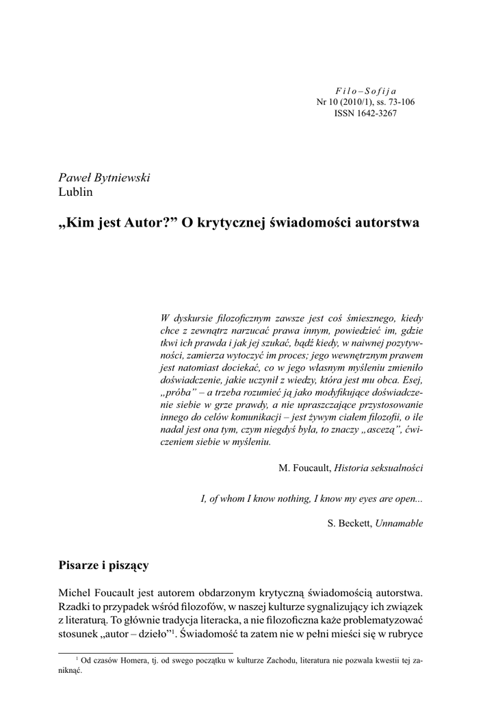 Filo–Sofija Nr 10 (2010/1), ss. 73-106 ISSN 1642-3267 Paweł Bytniewski Lublin „Kim jest Autor?” O krytycznej świadomości autorstwa W dyskursie filozoficznym zawsze jest coś śmiesznego, kiedy chce z zewnątrz narzucać prawa innym, powiedzieć im, gdzie tkwi ich prawda i jak jej szukać, bądź kiedy, w naiwnej pozytywności, zamierza wytoczyć im proces; jego wewnętrznym prawem jest natomiast dociekać, co w jego własnym myśleniu zmieniło doświadczenie, jakie uczynił z wiedzy, która jest mu obca. Esej, „próba” – a trzeba rozumieć ją jako modyfikujące doświadczenie siebie w grze prawdy, a nie upraszczające przystosowanie innego do celów komunikacji – jest żywym ciałem filozofii, o ile nadal jest ona tym, czym niegdyś była, to znaczy „ascezą”, ćwiczeniem siebie w myśleniu. M. Foucault, Historia seksualności I, of whom I know nothing, I know my eyes are open... S. Beckett, Unnamable Pisarze i piszący Michel Foucault jest autorem obdarzonym krytyczną świadomością autorstwa. Rzadki to przypadek wśród filozofów, w naszej kulturze sygnalizujący ich związek z literaturą. To głównie tradycja literacka, a nie filozoficzna każe problematyzować stosunek „autor – dzieło”1. Świadomość ta zatem nie w pełni mieści się w rubryce 1 Od czasów Homera, tj. od swego początku w kulturze Zachodu, literatura nie pozwala kwestii tej zaniknąć. 74 PAWEŁ BYTNIEWSKI „poglądy filozoficzne”, tj. nie daje się rekonstruować bez reszty ani w ramach doksograficznej redukcji słowa do poglądów, ani w ramach symptomatologicznej redukcji słowa do czynu, okoliczności, kontekstu. Bez uwzględnienia „problemu autorstwa” rozumianego jako kwestia samowiedzy pisania2 – zagadnienia, które niewiele znaczy dla twórczości Kanta, lecz zarazem pozwala identyfikować np. pisarstwo Kafki – pogląd na twórczość Foucaulta musiałby być okrojony. Mamy więc prawo dopytywać się: Cóż to za filozofia, która problematyzuje własne autorstwo? Cóż to za pisarstwo, które sięga po filozofię, by obronić swe prawo wypowiadania się? Jakie są zatem konsekwencje takiego traktowania pisarstwa filozoficznego, które samo od siebie domaga się reflektowania, tematyzowania wewnątrz własnej pracy myśli? Jakaż to przeszkoda nie pozwala zapomnieć filozofii o tej zawadzie, jaką jest Autor? Jakakolwiek by nie była odpowiedz na te pytania, nie da się oddzielić „Foucaulta-filozofa” od „Foucaulta-autora”, nie da się – by użyć słynnego już odróżnienia Rolanda Barthes’a – oddzielić „Foucaulta-piszącego” od „Foucaulta-pisarza”. Pisarze – twierdzi Barthes – „pracują nad słowem” i tworzą literaturę, piszący udzielają wypowiedzi: „świadczą, tłumaczą, uczą”. Biorą na siebie role, które wynikają z ich specyficznego stosunku do języka. Wedle Barthesa: Piszący [...] to ludzie „przechodni” – stawiają sobie jakiś cel (świadczyć, tłumaczyć, uczyć), a słowo jest tylko środkiem do niego. Słowo jest dla nich środkiem do czynu, ale samo czynem nie jest. A przeto język sprowadzany jest z powrotem do roli narzędzia porozumiewania się, nośnika „myśli”. Nawet jeśli piszący przywiązuje wagę do sposobu pisania, nigdy nie jest to dbałość ontologiczna – nigdy nie jest to troska. Piszący nigdy nie oddziaływuje technicznie na słowo w sposób zasadniczy – dysponuje on sposobem pisania wspólnym wszystkim piszącym, rodzajem k o i n e , w której niewątpliwie można odróżnić pewne dialekty (np. marksistowski, chrześcijański czy egzystencjalistyczny), natomiast bardzo rzadko style. Piszącego określa bowiem to, iż jego projekt komunikowania jest n a i w n y : nie przypuszcza on, że jego przekaz cofnie się i zamknie w sobie i że będzie można, w sposób diakrytyczny, odczytać w nim coś innego niż to, co on chciał powiedzieć; któż z piszących zgodziłby się poddać swój sposób pisania psychoanalizie? Mniema on, że jego słowo kładzie kres jakiejś dwuznaczności świata, że ustala jakieś nieodwracalne (nawet gdy zakłada się jego prowizoryczność) wyjaśnienie albo jakąś niezaprzeczalną informację (nawet gdy występuje tylko w roli skromnego nauczyciela). Tymczasem dla pisarza rzecz ma się – jak widzieliśmy – całkiem przeciwnie: wie on, że jego słowo, z wyboru i dzięki pracy nieprzechodnie, inicjuje jakąś dwuznaczność – nawet jeśli brzmi zdecydowanie, że, paradoksalnie, prezentuje się jako monumentalne milczenie do rozszyfrowania, 2 Jak twierdzi R. Barthes, kwestia ta należy do istotnych elementów kultury intelektualnej czasów nowoczesnych. Pisarz bowiem to ten, kto pisze zamiast innych. Jego pojawienie się w kulturze nowoczesnej, z wyodrębnionymi rolami wobec języka i społeczeństwa, nadaje samowiedzy pisania nie mniej istotną rolę w kulturze niż ta, którą w starożytności zyskali filozofowie. Por.: R. Barthes, Pisarze i piszący, przeł. J. Lalewicz, w: R. Barthes, Mit i znak, wybór i wstęp J. Błoński, PIW, Warszawa 1970. 75 „KIM JEST AUTOR?” O KRYTYCZNEJ ŚWIADOMOŚCI AUTORSTWA że jedyną dewizą może dlań być głęboka myśl Jacques Rigaut: I n a w e t k i e d y t w i e r d z ę , w c i ą ż p y t a m .3 Troska, „ontologiczna dbałość” o słowo u Foucaulta jest nie tylko sposobem bycia autora-pisarza jest też tym, co czyni go autorem-piszącym, jest bowiem owa troska trwałym motywem jego filozofowania – poczynając przynajmniej od Słów i rzeczy i kończąc na Fearless Speech. Rozkład akcentów pisarskich w tekstach Foucaulta jest jednak nierównomierny: ontologiczna troska przeziera raz przez postawę pisarza, a kiedy indziej piszącego, raz wyrażana jest explicite i tematyzowana jako problem filozoficzny, a innym razem jest tym, co po prostu działa w samym tekście jako emfaza, ironia albo nawet wyniosłe przemilczenie, a więc jako styl. Toteż pisarz i piszący w swym Foucaultows