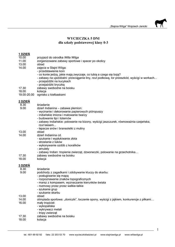 „Stajnia Wilga” Wojciech Janicki WYCIECZKA 5 DNI dla szkoły podstawowej klasy 0-3 1 DZIEŃ 10.00 11.00 13.00 14.00 przyjazd do ośrodka Willa Wilga zorganizowane zabawy sportowe i spacer po okolicy obiad zajęcia w Stajni Wilga: - przedstawienie koni - co konie jedzą, jakie mają zwyczaje, co lubią a czego się boją? - zabawy na ujeżdżalni: przeciąganie liny, rzut podkową, tor przeszkód, wyścigi w workach... - przejażdżki na kucykach - przejażdżki bryczką 17.30 zabawy swobodne na boisku 18.00 kolacja 19.00-20.00 ognisko z kiełbaskami 2 DZIEŃ 8.30 9.00 13.00 14.00 17.30 18.00 3 DZIEŃ 8.30 9.00 13.00 14.00 16.00 17.30 18.00 śniadanie dzień Indianina – zabawa plemion: - wycinanie i dekorowanie papierowych pióropuszy - indiańskie imiona i malowanie twarzy - budowanie tipi i totemów - zabawy indiańskie: polowanie na bizony, wyścigi jaszczurek, równoważnia czejeńska, rzut lassem... - łapacze snów i bransoletki z muliny obiad dzień Indianina cd. - szukanie i wypłukiwanie złota - strzelanie z łuków - wykonywanie ozdób z koralików - amulety - zabawy Indian: tropienie zwierząt, dzwoneczki, polowanie na grzechotnika… zabawy swobodne na boisku kolacja śniadanie podchody z zagadkami i zdobywanie kluczy do skarbu: - posługiwanie się mapą - rozpoznawanie znaków topograficznych - marsz z kompasem, wyznaczanie kierunków świata - rozmowy przez przez walkie-talkie - szukanie grup - szukanie skarbu obiad olimpiada sportowa: „doniczki”, toczenie opony, wyścigi z jajkiem, konkurencje z piłkami… mały tropiciel: - wykopaliska - wykrywacz metali - tropy zwierząt zabawy swobodne na boisku kolacja 1 tel.: 601 69 92 92 faks: 22 203 53 70 www.wycieczkidladzieci.pl www.stajniawilga.pl www.willawilga.pl „Stajnia Wilga” Wojciech Janicki 4 DZIEŃ 8.30 9.00 śniadanie wyprawa Piratów: - budowanie papierowych statków z pirackimi flagami - wyścigi stateczków - wędkowanie - morskie tatuaże - konkurencje pirackie: przejście po trapie, bocianie gniazdo, bitwa morska, wyścigi w płetwach… - pasowanie na pirata - szukanie skarbu z mapą 13.00 obiad 14.00 piesza wycieczka do leśnego mini ZOO w Cyganówce: dziki, sarny, jelenie, daniele, koniki polskie 17.30 zabawy swobodne na boisku 18.00 kolacja 19.00-21.00 dyskoteka 5 DZIEŃ 8.30 9.00 13.00 13.30 14.00 śniadanie survival dla najmłodszych: - wspólne rozpalanie ognia i przyrządzanie posiłków traperskich - proste węzły i zabawy z linkami - budowanie schronienia – szałasy - pierwsza pomoc przedmedyczna: wzywanie pomocy, pozycja bezpieczna, reanimacja, bandażowanie obiad pakowanie i przygotowanie do wyjazdu wyjazd KOSZT WYCIECZKI 41 – 46 dzieci: 520 zł / dziecko 31 – 40 dzieci: 550 zł / dziecko 21 – 30 dzieci: 580 zł / dziecko 15 – 20 dzieci: 610 zł / dziecko CENA OBEJMUJE - zakwaterowanie i pełne wyżywienie - bezpłatne zakwaterowanie i wyżywienie dla 1 opiekuna na każdą rozpoczętą 15-tkę dzieci - organizację wyżej przedstawionego programu - opiekę wychowawców i instruktorów z uprawnieniami podczas zajęć - pamiątkowe znaczki INFORMACJE DODATKOWE - śniadania i kolacje są w formie szwedzkiego stołu, obiad dwudaniowy z napojem i deserem (np.: owoc, galaretka, ciasteczka itp.); - przez cały dzień w jadalni jest dostępna woda i woda z sokiem dla dzieci, kawa i herbata dla opiekunów; - na terenie ośrodka jest jadalnia z salą, recepcja ze sklepikiem (napoje, słodycze, pamiątki), taras, zadaszona wiata, plac zabaw dla dzieci, miejsce na ognisko, piaszczyste boisko do siatkówki, kosz do koszykówki, stadnina, hala, łąki; - cena nie obejmuje transportu (zależy od liczby kilometrów); współpracujemy ze sprawdzonymi przewoźnikami – autokary, busy; Podane ceny zawierają podatek VAT. Przy zmianie programu cena może ulec zmianie. Oferta na rok 2017. 2 tel.: 601 69 92 92 faks: 22 203 53 70 www.wycieczkidladzieci.pl www.stajniawilga.pl www.willawilga.pl