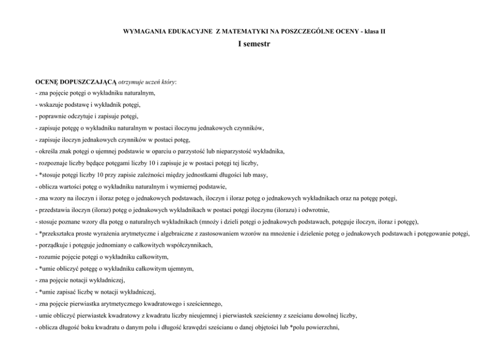 WYMAGANIA EDUKACYJNE Z MATEMATYKI NA POSZCZEGÓLNE OCENY - klasa II I semestr OCENĘ DOPUSZCZAJĄCĄ otrzymuje uczeń który: - zna pojęcie potęgi o wykładniku naturalnym, - wskazuje podstawę i wykładnik potęgi, - poprawnie odczytuje i zapisuje potęgi, - zapisuje potęgę o wykładniku naturalnym w postaci iloczynu jednakowych czynników, - zapisuje iloczyn jednakowych czynników w postaci potęg, - określa znak potęgi o ujemnej podstawie w oparciu o parzystość lub nieparzystość wykładnika, - rozpoznaje liczby będące potęgami liczby 10 i zapisuje je w postaci potęgi tej liczby, - *stosuje potęgi liczby 10 przy zapisie zależności między jednostkami długości lub masy, - oblicza wartości potęg o wykładniku naturalnym i wymiernej podstawie, - zna wzory na iloczyn i iloraz potęg o jednakowych podstawach, iloczyn i iloraz potęg o jednakowych wykładnikach oraz na potęgę potęgi, - przedstawia iloczyn (iloraz) potęg o jednakowych wykładnikach w postaci potęgi iloczynu (ilorazu) i odwrotnie, - stosuje poznane wzory dla potęg o naturalnych wykładnikach (mnoży i dzieli potęgi o jednakowych podstawach, potęguje iloczyn, iloraz i potęgę), - *przekształca proste wyrażenia arytmetyczne i algebraiczne z zastosowaniem wzorów na mnożenie i dzielenie potęg o jednakowych podstawach i potęgowanie potęgi, - porządkuje i potęguje jednomiany o całkowitych współczynnikach, - rozumie pojęcie potęgi o wykładniku całkowitym, - *umie obliczyć potęgę o wykładniku całkowitym ujemnym, - zna pojęcie notacji wykładniczej, - *umie zapisać liczbę w notacji wykładniczej, - zna pojęcie pierwiastka arytmetycznego kwadratowego i sześciennego, - umie obliczyć pierwiastek kwadratowy z kwadratu liczby nieujemnej i pierwiastek sześcienny z sześcianu dowolnej liczby, - oblicza długość boku kwadratu o danym polu i długość krawędzi sześcianu o danej objętości lub *polu powierzchni, -*wie, że druga potęga pierwiastka kwadratowego i trzecia potęga pierwiastka sześciennego jest równa liczbie podpierwiastkowej i stosuje to w obliczeniach, - zna wzory na iloczyn i iloraz pierwiastków tego samego stopnia, - mnoży i dzieli pierwiastki tego samego stopnia zastosowaniem poznanych wzorów, - zna kolejność wykonywania działań, - oblicza wartości prostych dwu-, trzy- lub czterodziałaniowych wyrażeń arytmetycznych zawierających potęgi i pierwiastki, - *zna pojęcie liczby niewymiernej i rzeczywistej, - rozpoznaje liczby wymierne i liczby niewymierne zapisane w postaci pierwiastków kwadratowych i sześciennych. - zna pojęcie koła i okręgu, - wie, czym różni się koło od okręgu, - rysuje koło (okrąg) o danym promieniu lub średnicy, - rozpoznaje i rysuje promień, średnicę, cięciwę koła (okręgu), - zna pojęcie kąta środkowego, - zna pojęcie łuku i pojęcie wycinka koła, - rozpoznaje i rysuje półkole i półokrąg, - zna pojęcie liczby π i przybliżoną wartość liczby π, - zna wzór na obliczanie długości okręgu i pola koła, - oblicza długość okręgu i pole koła mając daną długość promienia lub średnicy, - *oblicza długości łuków jako określonych części okręgów, - *oblicza pola wycinków kół jako określonych części kół, - *oblicza pole półkola i długość półokręgu o danym promieniu. - zna pojęcie wyrażenia algebraicznego, - zna pojęcie jednomianu i sumy algebraicznej, - zna pojęcie jednomianu uporządkowanego, - zna pojęcie jednomianów podobnych, - rozumie zasadę redukowania wyrazów podobnych, - rozumie zasadę nazywania wyrażeń algebraicznych, - umie budować proste wyrażenia algebraiczne, - umie odczytywać wyrażenia algebraiczne, - umie porządkować jednomiany, - umie podać współczynnik liczbowy jednomianu, - umie wskazać jednomiany podobne, - umie redukować wyrazy podobne, - umie dodawać i odejmować sumy algebraiczne, - umie mnożyć sumę algebraiczną przez liczbę i *przez jednomian, - umie dzielić sumę algebraiczną przez liczbę wymierną, - umie obliczyć wartość liczbową wyrażenia algebraicznego dla zmiennych wymiernych bez jego przekształcania, OCENĘ DOSTATECZNĄ otrzymuje uczeń, który: - *potrafi przedstawić dowolną liczbę wymierną w postaci potęgi, - stosuje potęgi liczby 10 przy zapisie zależności między jednostkami oraz do zapisu dużych liczb, - *przedstawia potęgę o wykładniku naturalnym w postaci iloczynu lub ilorazu potęg o takiej samej podstawie oraz jako potęgę potęgi, - oblicza wartości wyrażeń arytmetycznych zawierających potęgi i pierwiastki (bez nawiasów wewnętrznych i ułamków piętrowych), - stosuje twierdzenia dotyczące działań na potęgach i pierwiastkach w celu doprowadzenia wyrażenia do prostszej postaci oraz *ułatwienia obliczeń, - porządkuje i potęguje jednomiany, - włącza czynnik pod znak pierwiastka kwadratowego i sześciennego, - wyłącza czynnik przed znak pierwiastka kwadratowego, - *usuwa niewymierność z mianownika ułamka zawierającego pierwiastek kwadratowy, - zna i rozumie pojęcie liczby niewymiernej i zna podzbiory zbioru liczb rzeczywistych, - rozumie różnicę w rozwinięciu dziesiętnym liczby wymiernej i niewymiernej, - umie oszacować wartość wyrażenia zwierającego pierwiastki. - *wyznacza promień lub średnicę okręgu znając jego długość, - *rozwiązuje zadania tekstowe związane z porównywaniem obwodów figur, - *wyznacza promień lub średnicę koła znając jego pole, - *rozwiązuje zadania tekstowe związane z porównywaniem pól figur, - oblicza długości łuków i pola wycinków kół, znając miary kątów środkowych, - umie obliczyć pole figury złożonej z łuków i odcinków, - umie obliczyć pole figury złożone z wielokątów i wycinków koła. - umie opuszczać nawiasy, - umie mnożyć sumę algebraiczną przez jednomian, - umie doprowadzić wyrażenie algebraiczne do prostszej postaci, - umie wyłączyć wspólny czynnik przed nawias, - umi
