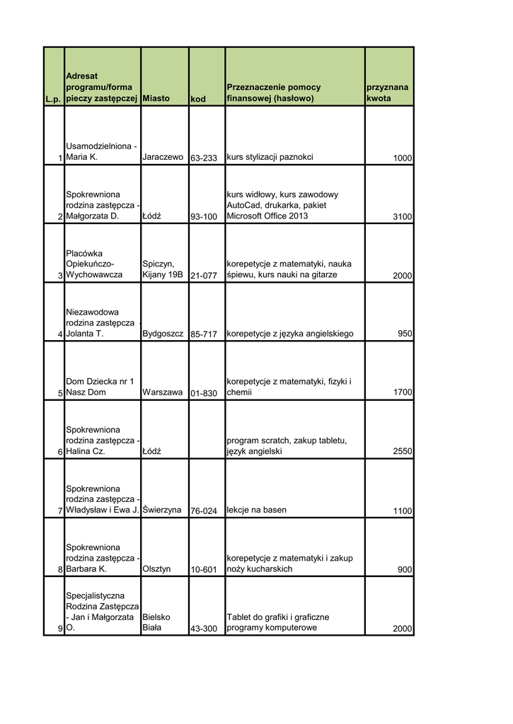 Adresat programu/forma L.p. pieczy zastępczej Miasto kod Przeznaczenie pomocy finansowej (hasłowo) przyznana kwota Usamodzielniona Jaraczewo 63-233 1 Maria K. kurs stylizacji paznokci 1000 Spokrewniona rodzina zastępcza Łódź 2 Małgorzata D. kurs widłowy, kurs zawodowy AutoCad, drukarka, pakiet Microsoft Office 2013 3100 Spiczyn, Kijany 19B 21-077 korepetycje z matematyki, nauka śpiewu, kurs nauki na gitarze 2000 Niezawodowa rodzina zastępcza Bydgoszcz 85-717 4 Jolanta T. korepetycje z języka angielskiego 950 Dom Dziecka nr 1 Warszawa 01-830 5 Nasz Dom korepetycje z matematyki, fizyki i chemii 1700 Spokrewniona rodzina zastępcza Łódź 6 Halina Cz. program scratch, zakup tabletu, język angielski 2550 1100 Placówka Opiekuńczo3 Wychowawcza 93-100 Spokrewniona rodzina zastępcza 7 Władysław i Ewa J. Świerzyna 76-024 lekcje na basen Spokrewniona rodzina zastępcza Olsztyn 8 Barbara K. 10-601 korepetycje z matematyki i zakup noży kucharskich Specjalistyczna Rodzina Zastępcza - Jan i Małgorzata Bielsko Biała 9 O. 43-300 Tablet do grafiki i graficzne programy komputerowe 900 2000 Placówka OpiekuńczoWychowawcza typu rodzinnego 10 Jolanta K. Częstocho wa 42-209 studia aktorskie w Warszawie, lekcje gimnastyki 1200 Spokrewniona rodzina zastępcza Olsztyn 11 Ilona Ć. 10-437 język rosyjski Placówka OpiekuńczoWychowawcza 12 "Mario" 13-230 angielski, prawo jazdy 93-134 matematyka, polski, chemia 950 niemiecki 960 700 Lidzbark Spokrewniona rodzina zastępcza Łódź 13 Krystyna Z. Niezawodowa rodzina zastępcza - Bielsko Biała 14 Iwona T-M. 750 4600 Zawodowa Rodzina Zastępcza Olsztyn 15 - Lidia G. 10-852 włoski Rodzina Zastępcza Kłoczew 16 - Marianna K. 08-550 angielski, kurs prawa jazdy 1000 61-649 kurs operatora wózków widłowych i podnośnikowych, kurs wózków bocznych wysokiego składowania 1000 Usamodzielniona Warszawa 02-482 18 Małgorzata F. angielski 1000 Usamodzielniony - Chrząstow o 20/3 19 Paweł C. opłata semestru w szkole policealnej o specjalności: technik administracji 1000 Usamodzielniony Poznań 17 Daniel J. Usamodzielniona Poznań 20 Damian R. 61-631 kurs prawa jazdy 1000 3000 3000 Dom dla Dzieci 21 TND - Borkowska Kraków 30-438 fizyka, niemiecki, zajęcia plastyczne, kurs szycia, lekcje rysunku Dom dla Dzieci 22 TND - Ruciana Kraków 30-803 angielski, matematyka Niezawodowa rodzina zastępcza - Częstocho wa 23 Anna i Jacek P. kurs tańca towarzyskiego 300 10-041 chemia 960 20-818 siłownia, wędkarstwo, matematyka, angielski, piłka nożna, zajęcia taneczne, uczestniczenie w zajęciach Legii Akademickiej, kurs florystyczny 2500 20-809 kurs prawa jazdy na ciągnik kat T, program graficzny Corel, reszta według uznania 2500 20-037 egzamin zawodowy rzemieślniczy w specjalności kucharz, kurs obsługi kasy fiskalnej 1100 Rodzinny Dom 28 Dziecka - Róża P. Wejherowo 84-200 kurs zawodowy na koparkę lub sztaplarkę, reszta według uznania rodziny 3500 Spokrewniona rodzina zastępcza Warszawa 29 Grażyna W. zajęcia z akrobatyki, karate 1000 Rodzina zastępcza Olsztyn 24 - Marzanna Z. 25 Dom Rodzinny nr 2 Lublin 26 Dom Rodzinny nr 1 Lublin 27 Dom Rodzinny nr 4 Lublin Usamodzielniony Wrocław 30 Krystian B. Zawodowy sprzęt fryzjerski 1000 Całodobowa Placówka OpiekuńczoWychowawcza im. Częstocho wa 31 Św. D. Savio 42-200 kurs makijażu, kurs obsługi wózka widłowego 2500 Usamodzielniona Skórzec 32 Milena K. 08-114 kurs księgowości 1000 Zawodowa Rodzina Zastępcza Opoczno 33 - Urszula P. 26-300 kurs cukiernika 850 zajęcia teatralne 1400 1500 Placówka OpiekuńczoWychowawcza 34 Elżbieta Ścigała 51-515 Blachownia 42-290 Niezawodowa rodzina zastępcza Tuchola 35 Anna T. 89-500 niemiecki, angielski Usamodzielniona Poznań 36 Paulina W. 60-768 matematyka, angielski, niemiecki 500 Konstancin37 Rodzina Zastępcza Jeziorna 05-510 nauka pływania dla 2 dziewczynek: OiV 1000 Usamodzielniona - Lipnica Wielka 38 Maria L. profesjonalny sprzęt do masażu 1000 kurs prawa jazdy 1000 Usamodzielniona Grzybno 39 Wiktoria Ś. 33-323 Zawodowa Rodzina Zastępcza Elbląg 40 - Danuta Ł. 82-300 kurs prawa jazdy 1000 Dom Młodzieży im. Poznań 41 Bł. Laury Vicuni 60-625 angielski, strój sportowy 1464 Spokrewniona rodzina zastępcza Poznań 42 Danuta S. 60-681 piłka nożna - zajęcia i strój 1000 Spokrewniona rodzina zastępcza Jolanta i Bogusław Białystok 43 S. 15-644 indywidualne lekcje śpiewu solowego 990 Usamodzielniona Bystra 44 Agnieszka W-M. 43-360 kurs kosmetyczny 1000 Spokrewniona rodzina zastępcza 45 Marta i Andrzej Ł. Olsztyn 10-685 kurs prawa jazdy 1000 Rodzina Zastępcza Sierpc 46 - Teresa A-Ł. 09-200 obóz artystyczny 1000 Spokrewniona rodzina zastępcza Olsztyn 47 Barbara B. 10-516 włoski 1000 Rodzina Zastępcza Olsztyn 48 - Klaudia G. 10-355 kurs spadochronowy, zajęcia gimnastyczne 2000 Dom Dziecka "Moja Rodzina" Zgromadzenia Św. 49 Michała Archanioła Przemyśl 37-700 prawo jazdy kat. B 3000 Spokrewniona rodzina zastępcza Poznań 50 Teresa K. 61-002 niemiecki, pobyt w bursie szkolnej Szkoła Mistrzostwa Sportowego 2000 Rodzina Zastępcza Bulowice 51 - Janina i Jan H. 32-652 angielski, nauka gry na gitarze 1760 Rodzina Zastępcza - Wiesława i brak 52 Tadeusz M. brak kurs prawa jazdy kat. B 1000 Ośrodek Pomocy Dziecku i Rodzinie w Górze Włodowice 42-421 53 Włodowskiej matematyka Stowarzyszenie na Rzecz Rozwoju Dzieci i Młodzieży Dąbrowa Górnicza 54 "Malolat" 41-303 matematyka, angielski, niemiecki, fizyka 4998 Powiatowy Zespół Placówek Opiekuńczo55 Wychowawczych Gostynin 09-500 kurs wizażu 1290 60-625 kurs operatora wózków widłowych, kurs językowy 1800 Niezawodowa rodzina zastępcza Zofia i Mieczysław Włosiennic a 57 L. 32-642 kurs pracownik administracyjnobiurowy 1000 Rodzina Zastępcza Piaseczno 58 - Jadwiga B. angielski, niemiecki, matematyka 1000 sprzęt sportowy - dot. Kobiecej Piłki Nożnej 1000 Dom Młodzieży im. Św. Dominika Poznań 56 Savio 05-502 Ostrów Usamodzielniona - Mazowieck a 59 Joanna Ż. 