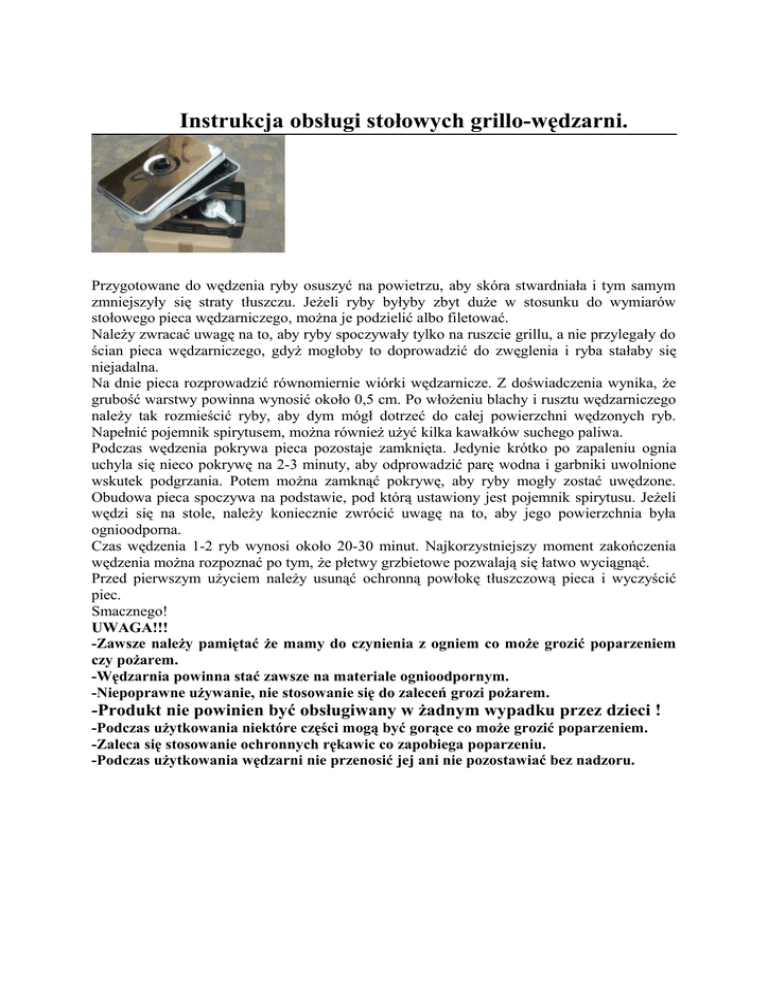Instrukcja obsługi stołowych grillo-wędzarni. Przygotowane do wędzenia ryby osuszyć na powietrzu, aby skóra stwardniała i tym samym zmniejszyły się straty tłuszczu. Jeżeli ryby byłyby zbyt duże w stosunku do wymiarów stołowego pieca wędzarniczego, można je podzielić albo filetować. Należy zwracać uwagę na to, aby ryby spoczywały tylko na ruszcie grillu, a nie przylegały do ścian pieca wędzarniczego, gdyż mogłoby to doprowadzić do zwęglenia i ryba stałaby się niejadalna. Na dnie pieca rozprowadzić równomiernie wiórki wędzarnicze. Z doświadczenia wynika, że grubość warstwy powinna wynosić około 0,5 cm. Po włożeniu blachy i rusztu wędzarniczego należy tak rozmieścić ryby, aby dym mógł dotrzeć do całej powierzchni wędzonych ryb. Napełnić pojemnik spirytusem, można również użyć kilka kawałków suchego paliwa. Podczas wędzenia pokrywa pieca pozostaje zamknięta. Jedynie krótko po zapaleniu ognia uchyla się nieco pokrywę na 2-3 minuty, aby odprowadzić parę wodna i garbniki uwolnione wskutek podgrzania. Potem można zamknąć pokrywę, aby ryby mogły zostać uwędzone. Obudowa pieca spoczywa na podstawie, pod którą ustawiony jest pojemnik spirytusu. Jeżeli wędzi się na stole, należy koniecznie zwrócić uwagę na to, aby jego powierzchnia była ognioodporna. Czas wędzenia 1-2 ryb wynosi około 20-30 minut. Najkorzystniejszy moment zakończenia wędzenia można rozpoznać po tym, że płetwy grzbietowe pozwalają się łatwo wyciągnąć. Przed pierwszym użyciem należy usunąć ochronną powłokę tłuszczową pieca i wyczyścić piec. Smacznego! UWAGA!!! -Zawsze należy pamiętać że mamy do czynienia z ogniem co może grozić poparzeniem czy pożarem. -Wędzarnia powinna stać zawsze na materiale ognioodpornym. -Niepoprawne używanie, nie stosowanie się do zaleceń grozi pożarem. -Produkt nie powinien być obsługiwany w żadnym wypadku przez dzieci ! -Podczas użytkowania niektóre części mogą być gorące co może grozić poparzeniem. -Zaleca się stosowanie ochronnych rękawic co zapobiega poparzeniu. -Podczas użytkowania wędzarni nie przenosić jej ani nie pozostawiać bez nadzoru.