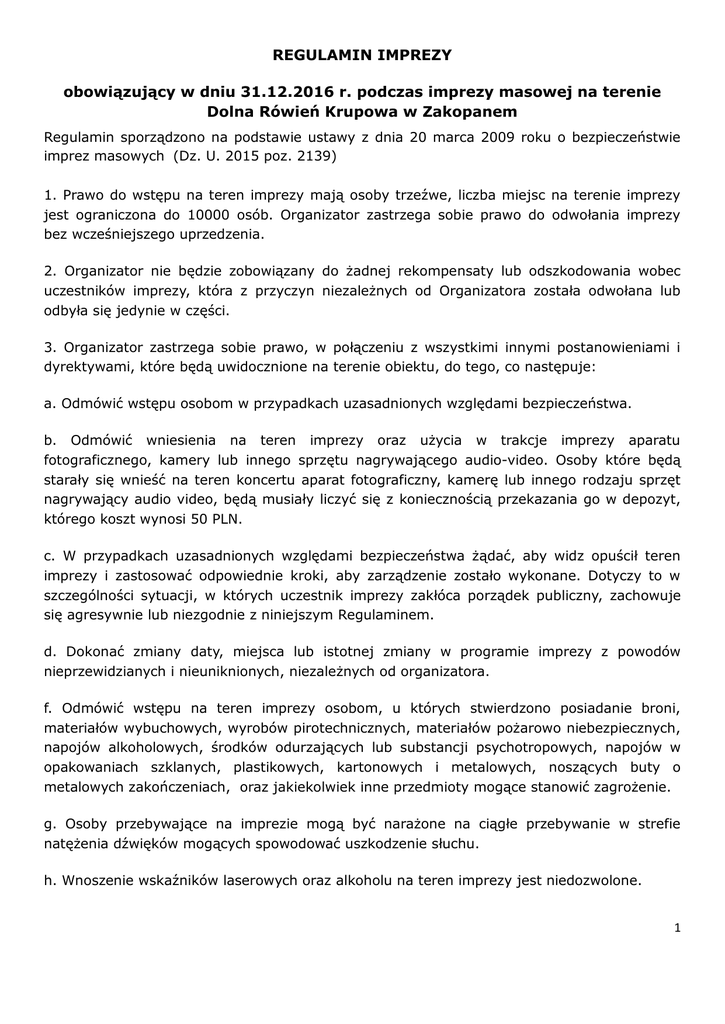 REGULAMIN IMPREZY obowiązujący w dniu 31.12.2016 r. podczas imprezy masowej na terenie Dolna Rówień Krupowa w Zakopanem Regulamin sporządzono na podstawie ustawy z dnia 20 marca 2009 roku o bezpieczeństwie imprez masowych (Dz. U. 2015 poz. 2139) 1. Prawo do wstępu na teren imprezy mają osoby trzeźwe, liczba miejsc na terenie imprezy jest ograniczona do 10000 osób. Organizator zastrzega sobie prawo do odwołania imprezy bez wcześniejszego uprzedzenia. 2. Organizator nie będzie zobowiązany do żadnej rekompensaty lub odszkodowania wobec uczestników imprezy, która z przyczyn niezależnych od Organizatora została odwołana lub odbyła się jedynie w części. 3. Organizator zastrzega sobie prawo, w połączeniu z wszystkimi innymi postanowieniami i dyrektywami, które będą uwidocznione na terenie obiektu, do tego, co następuje: a. Odmówić wstępu osobom w przypadkach uzasadnionych względami bezpieczeństwa. b. Odmówić wniesienia na teren imprezy oraz użycia w trakcje imprezy aparatu fotograficznego, kamery lub innego sprzętu nagrywającego audio-video. Osoby które będą starały się wnieść na teren koncertu aparat fotograficzny, kamerę lub innego rodzaju sprzęt nagrywający audio video, będą musiały liczyć się z koniecznością przekazania go w depozyt, którego koszt wynosi 50 PLN. c. W przypadkach uzasadnionych względami bezpieczeństwa żądać, aby widz opuścił teren imprezy i zastosować odpowiednie kroki, aby zarządzenie zostało wykonane. Dotyczy to w szczególności sytuacji, w których uczestnik imprezy zakłóca porządek publiczny, zachowuje się agresywnie lub niezgodnie z niniejszym Regulaminem. d. Dokonać zmiany daty, miejsca lub istotnej zmiany w programie imprezy z powodów nieprzewidzianych i nieuniknionych, niezależnych od organizatora. f. Odmówić wstępu na teren imprezy osobom, u których stwierdzono posiadanie broni, materiałów wybuchowych, wyrobów pirotechnicznych, materiałów pożarowo niebezpiecznych, napojów alkoholowych, środków odurzających lub substancji psychotropowych, napojów w opakowaniach szklanych, plastikowych, kartonowych i metalowych, noszących buty o metalowych zakończeniach, oraz jakiekolwiek inne przedmioty mogące stanowić zagrożenie. g. Osoby przebywające na imprezie mogą być narażone na ciągłe przebywanie w strefie natężenia dźwięków mogących spowodować uszkodzenie słuchu. h. Wnoszenie wskaźników laserowych oraz alkoholu na teren imprezy jest niedozwolone. 1 i. Oficjalne programy i gadżety będą sprzedawane wyłączne na terenie imprezy j. Wstęp osób małoletnich na teren imprezy masowej jest możliwy wyłącznie z opiekunem prawnym. 5. Miejsca nieprzeznaczone dla publiczności to: scena, zaplecze sceny, strefa produkcji, garderoby artystów. 6. Kto nie wykonuje polecenia porządkowego, wydanego na podstawie ustawy przez służby porządkowe lub służby informacyjne, podlega karze ograniczenia wolności albo grzywny nie niższej niż 2 000 zł. 7.Kto w czasie trwania imprezy masowej przebywa w miejscu nieprzeznaczonym dla publiczności, podlega karze ograniczenia wolności albo grzywny nie niższej niż 2 000 zł. 8. Kto nie wykonuje polecenia wydanego przez Policję lub Żandarmerię Wojskową, w miejscu i w czasie trwania imprezy masowej, podlega karze ograniczenia wolności albo grzywny nie niższej niż 2 000 zł. 9. Kto wbrew przepisom ustawy wnosi lub posiada na imprezie masowej napoje alkoholowe, podlega karze ograniczenia wolności albo grzywny nie niższej niż 2 000 zł. 10. Kto wnosi lub posiada na imprezie masowej broń, w rozumieniu ustawy z dnia 21 maja 1999 r. o broni i amunicji (Dz. U. z 2004 r. Nr 52, poz. 525, z późn. zm.), wyroby pirotechniczne, materiały pożarowo niebezpieczne lub inne niebezpieczne przedmioty lub materiały wybuchowe, podlega grzywnie nie mniejszej niż 180 stawek dziennych, karze ograniczenia wolności albo pozbawienia wolności od 3 miesięcy do lat 5. 11. Kto w czasie trwania imprezy masowej rzuca przedmiot, mogący stanowić zagrożenie dla życia, zdrowia lub bezpieczeństwa osób przebywających na terenie lub w obiekcie, gdzie odbywa się impreza masowa, albo w inny, równie niebezpieczny sposób zakłóca przebieg tej imprezy, podlega grzywnie nie mniejszej niż 120 stawek dziennych, karze ograniczenia wolności albo pozbawienia wolności do lat 2. 12. Kto w czasie i w miejscu trwania imprezy masowej narusza nietykalność cielesną członka służby porządkowej lub służby informacyjnej, podlega grzywnie nie mniejszej niż 120 stawek 2