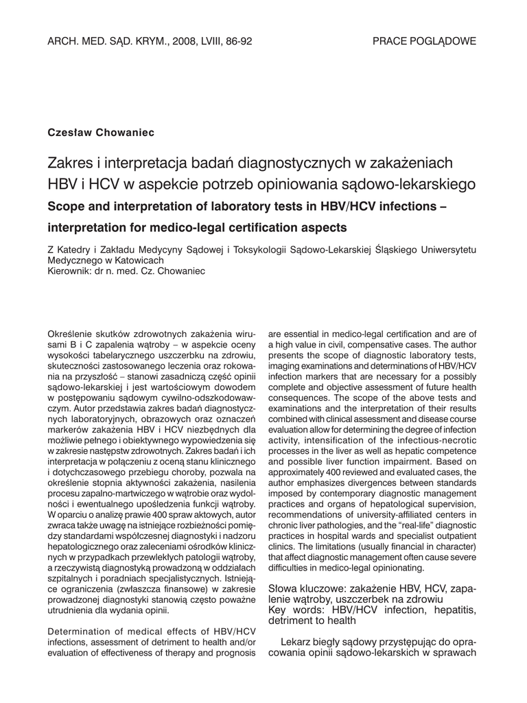 ARCH. MED. SąD. KRYM., 2008, LvIII, 86-92 PRACE POGLąDOWE Czesław Chowaniec Zakres i interpretacja badań diagnostycznych w zakażeniach HBv i HCv w aspekcie potrzeb opiniowania sądowo-lekarskiego Scope and interpretation of laboratory tests in HBV/HCV infections – interpretation for medico-legal certification aspects Z Katedry i Zakładu Medycyny Sądowej i Toksykologii Sądowo-Lekarskiej śląskiego Uniwersytetu Medycznego w Katowicach Kierownik: dr n. med. Cz. Chowaniec Określenie skutków zdrowotnych zakażenia wirusami B i C zapalenia wątroby – w aspekcie oceny wysokości tabelarycznego uszczerbku na zdrowiu, skuteczności zastosowanego leczenia oraz rokowania na przyszłość – stanowi zasadniczą część opinii sądowo-lekarskiej i jest wartościowym dowodem w postępowaniu sądowym cywilno-odszkodowawczym. Autor przedstawia zakres badań diagnostycznych laboratoryjnych, obrazowych oraz oznaczeń markerów zakażenia HBv i HCv niezbędnych dla możliwie pełnego i obiektywnego wypowiedzenia się w zakresie następstw zdrowotnych. Zakres badań i ich interpretacja w połączeniu z oceną stanu klinicznego i dotychczasowego przebiegu choroby, pozwala na określenie stopnia aktywności zakażenia, nasilenia procesu zapalno-martwiczego w wątrobie oraz wydolności i ewentualnego upośledzenia funkcji wątroby. W oparciu o analizę prawie 400 spraw aktowych, autor zwraca także uwagę na istniejące rozbieżności pomiędzy standardami współczesnej diagnostyki i nadzoru hepatologicznego oraz zaleceniami ośrodków klinicznych w przypadkach przewlekłych patologii wątroby, a rzeczywistą diagnostyką prowadzoną w oddziałach szpitalnych i poradniach specjalistycznych. Istniejące ograniczenia (zwłaszcza finansowe) w zakresie prowadzonej diagnostyki stanowią często poważne utrudnienia dla wydania opinii. Determination of medical effects of HBv/HCv infections, assessment of detriment to health and/or evaluation of effectiveness of therapy and prognosis are essential in medico-legal certification and are of a high value in civil, compensative cases. The author presents the scope of diagnostic laboratory tests, imaging examinations and determinations of HBv/HCv infection markers that are necessary for a possibly complete and objective assessment of future health consequences. The scope of the above tests and examinations and the interpretation of their results combined with clinical assessment and disease course evaluation allow for determining the degree of infection activity, intensification of the infectious-necrotic processes in the liver as well as hepatic competence and possible liver function impairment. Based on approximately 400 reviewed and evaluated cases, the author emphasizes divergences between standards imposed by contemporary diagnostic management practices and organs of hepatological supervision, recommendations of university-affiliated centers in chronic liver pathologies, and the “real-life” diagnostic practices in hospital wards and specialist outpatient clinics. The limitations (usually financial in character) that affect diagnostic management often cause severe difficulties in medico-legal opinionating. Słowa kluczowe: zakażenie HBv, HCv, zapalenie wątroby, uszczerbek na zdrowiu Key words: HBv/HCv infection, hepatitis, detriment to health Lekarz biegły sądowy przystępując do opracowania opinii sądowo-lekarskich w sprawach Nr 2-3 ZAKAżENIA HBv I HCv cywilno-odszkodowawczych, ale także (co prawda) rzadziej karnych i ubezpieczeniowych, staje często przed poważnym problemem diagnostycznym i decyzyjnym. Jak uczy własna praktyka opiniodawcza, zgromadzony w aktach sprawy materiał dowodowy najczęściej jest niepełny. Braki dotyczą nie tylko istotnych dla określenia czasu, miejsca i źródła zakażenia ustaleń epidemiologicznych, co w rezultacie przenosi się na trudności w ustaleniu związku przyczynowego pomiędzy zakażeniem wirusem a szeroko pojętym kontaktem ze służbą zdrowia, tj. wykonanymi procedurami medycznymi w „podejrzanym zakładzie opieki zdrowotnej” ale także dokumentacji medycznej [1]. W szczególności istotne są braki w zakresie pełnych oznaczeń markerów zakażenia HBv i HCv – w tym z wykorzystaniem dostępnych technik molekularnych HBv-DNA oraz HCv-RNA met. PCR), diagnostyki różnicowej i badań uzupełniających laboratoryjnych, które pozwalałyby na ocenę charakteru zakażenia, jego początku, dotychczasowego przebiegu klinicznego choroby, badań obiektywizujących stopień uszkodzenia miąższu wątroby. Niewystarczająca jest kontrola ambulatoryjna w odniesieniu do przypadków przewlekłych zakażeń skutkujących rozwinięciem się przewlekłego zapalenia wątroby, a także monitorowanie efektów terapeutycznych stosowanego leczenia [2, 3]. Praktycznie pomija się w ogóle problematykę pozawątrobowych uszkodzeń narządowych w przebiegu zakażenia HBv, a zwłaszcza HCv [4]. Oddzielną kwestią jest brak oceny histopatologicznej bioptatu wątroby z okresu przed podjęciem leczenia i następnie kontrolnej po upływie 12-24 miesięcy od jego zakończenia [3, 5]. Wyniki badań ultrasonograficznych jamy brzusznej, wykonywane poza ośrodkami klinicznymi, są z reguły zupełnie nieprzydatne, gdyż zawierają rutynowe sformułowania dot. oceny ultrasonograficznej narządów bez informacji istotnych w przypadkach podejrzenia przewlekłej patologii wątroby. Powyższe braki stanowią znaczące utrudnienie dla wydania opinii. Zadanie przed jakim staje biegły jest wówczas tym trudniejsze, jeśli wziąć pod uwagę złożoność zakażeń wirusami B i C zapalenia wątroby, możliwie zróżnicowany ich przebieg kliniczny, panujące wśród biegłych subiektywizm i dowolność interpretacyjna wyników badań dodatkowych w odniesieniu do przewidzianej tabelami możliwości określenia wysokości uszczerbku na zdrowiu związanego z zakażeniem wirusami hepatotropowymi HBv 87 i HCv (od 0 do 100%). Postęp