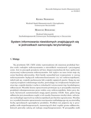 Roczniki Kolegium Analiz Ekonomicznych nr 29/2013 K esra Nermend Wydział Nauk Ekonomicznych i Zarządzania Uniwersytet Szczeciński Mariusz Borawski Wydział Informatyki Zachodniopomorski Uniwersytet Technologiczny w Szczecinie System informowania niewidomych znajdujących się w jednostkach samorządu terytorialnego 1. Wstęp Na przełomie XX i XIX wieku wprowadzono do masowej produkcji bardzo wiele rodzajów mikrosystemów o niewielkich rozmiarach i przystępnej cenie. Jest to początek przejścia od fazy eksperymentalnej do fazy społecznie użytecznej wykorzystania mikrosystemów. Ich wpływ na nasz świat staje się coraz bardziej odczuwalny. Dziś każdy samochód jest wyposażony w szereg mikrosystemów będących mikromechanizmami czy też mikroczujnikami, takich jak np. czujniki parkowania lub czujniki zapiętych pasów. Stają się one częścią urządzeń codziennego użytku, pozwalając na zwiększenie bezpieczeństwa (np. czujniki dotyku i ruchu w żelazkach) i użyteczności (np. bezobsługowe odkurzacze). Wysokie koszty opracowania prototypu są w przypadku masowej produkcji rekompensowane przez niskie ceny mikroczujników, które przy dużych, hurtowych zamówieniach mogą spaść poniżej 1 EUR. Tam, gdzie krąg odbiorców jest stosunkowo wąski, a ich zasoby finansowe niezbyt duże, wdrażanie technologii opartych na mikroczujnikach jest bardzo ograniczone. Wynika to z wysokich kosztów opracowania rozwiązania rozkładającego się na niewielką liczbę sprzedanych egzemplarzy produktu. Problem ten pojawia się w przypadku osób niepełnosprawnych, stanowiących dość wąskie grono odbiorców, których potrzeby zależą od rodzaju niepełnosprawności. W przypadku osób 206 Kesra Nermend, Mariusz Borawski iewidomych mikroczujniki mogą częściowo zastąpić zmysł wzroku, stanowiąc n nowocześniejsze i bardziej użyteczne rozwiązanie od stosowanych do tej pory. W biurach i urzędach, w których niewidomi są petentami, mogą w znacznym stopniu usamodzielnić ich poruszanie się, a także pozwolić na pozyskiwanie informacji bez udziału osób trzecich. Według raportu1, obecnie najpopularniejszym sposobem dostosowania budynków administracji publicznej do potrzeb osób niewidomych i niedowidzących jest dodatkowa osobista pomoc pracownika (68% budynków). Ponadto czasami spotyka się także specjalnie przystosowane windy (15%). W publikacji2 wskazano, że bardzo mało jest witryn internetowych instytucji publicznych dostosowanych do potrzeb osób niewidomych i niedowidzących (20%). Zalecenia w zakresie dostosowania budynków dla osób niepełnosprawnych w głównej mierze skupiają się na zapewnieniu właściwej nawierzchni, odpowiedniej przestrzeni oraz prostych rozwiązań technicznych, brakuje zaleceń w zakresie systemów automatycznego przekazywania informacji3. Aktualnie dostępne rozwiązania techniczne dla osób niewidomych skupiają się na zamianie informacji wizualnej na dźwiękową (mówiące urządzenia, skanery z oprogramowaniem odczytującym tekst)4. Prowadzi się jednak intensywne badania nad wprowadzeniem nowych, innowacyjnych rozwiązań, np. specjalnej odzieży5, tablic dotykowych6, dotykowych map7 itp. Celem niniejszego artykułu jest przedstawienie urządzeń i rozwiązań, które mają wspomagać niepełnosprawnych i nad którymi aktualnie trwają prace, 1 Raport z badania na temat dostępności budynków administracji rządowej i urzędów centralnych dla osób niepełnosprawnych, Biuro Pełnomocnika Rządu do Spraw Osób Niepełnosprawnych, Ministerstwo Pracy i Polityki Społecznej, Warszawa, marzec 2008, s. 11–14. 2 K. Wiśniewski, Dostępność witryn internetowych instytucji publicznych dla osób niewidomych – raport Rzecznika Praw Obywatelskich, Warszawa 2010. 3 J. Budny, Dostosowanie budynków użyteczności publicznej – teoria i narzędzia, Stowarzyszenie Przyjaciół Integracji, Warszawa 2009. 4 S. Jakubowski, A. Adamowicz-Hummel, Wykorzystanie urządzeń technicznych w tworzeniu stanowisk pracy dla osób z dysfunkcją wzroku, w: Poradnik pracodawcy osób niewidomych i słabowidzących, Fundacja AWARE Europe, Warszawa 2000. 5 R. Velázquez, Wearable Assistive Devices for the Blind, w: Wearable and Autonomous Biomedical Devices and Systems for Smart Environment, red. A. Lay-Ekuakille, S. C. Mukhopadhyay, Springer, Berlin 2010, s. 331–349. 6 C. Wagner, S. Lederman, R. Howe, Design and performance of a tactile shape display using RC servomotors, w: Proc. of 10th Symposium on Haptic Interfaces for Virtual Environment and Teleoperator Systems, Orlando (Fl) 2002, s. 354–355. 7 R. Velazquez, E. Fontaine, E. Pissaloux, Coding the environment in tactile maps for real-time guidance of the visually impaired, w: Proc. of IEEE International Symposium on Micro-NanoMechatronics and Human Science, Nagoya (Japan) 2006. System informowania niewidomych znajdujących się w jednostkach samorządu terytorialnego 207 oraz propozycji usprawnień pozwalających osobom niewidomym na bardziej niezależne korzystanie z usług biur i urzędów administracji publicznej. 2. Istniejące rozwiązania Na rynku można znaleźć wiele urządzeń wspomagających pracę niewidomych, jednak w dość ograniczonym zakresie; istnieją urządzenia biurowe, jak np. kserokopiarki umożliwiające przekazywanie informacji w sposób głosowy. Izraelska firma CRMC opracowała system do pracy osób niewidomych w call center. Jest on wyposażony w klawiaturę Braille’a i system audio pozwalający opisywać, co znajduje się na ekranie. Rozwiązanie takie nie zawsze jest wystarczające, dlatego opracowane zostały monitory Braille’a. Tego typu rozwiązania sprawdziły się dobrze w edukacji osób niewidomych. Rozwój technologii sieci komputerowych oraz szerokie zastosowanie komputerów spowodowały pojawienie się nowych rozwiązań umożliwiających edukację na odległość. Tak zwany e-learning poprzez podłączenie do komputera klawiatury Braille’a oraz synte