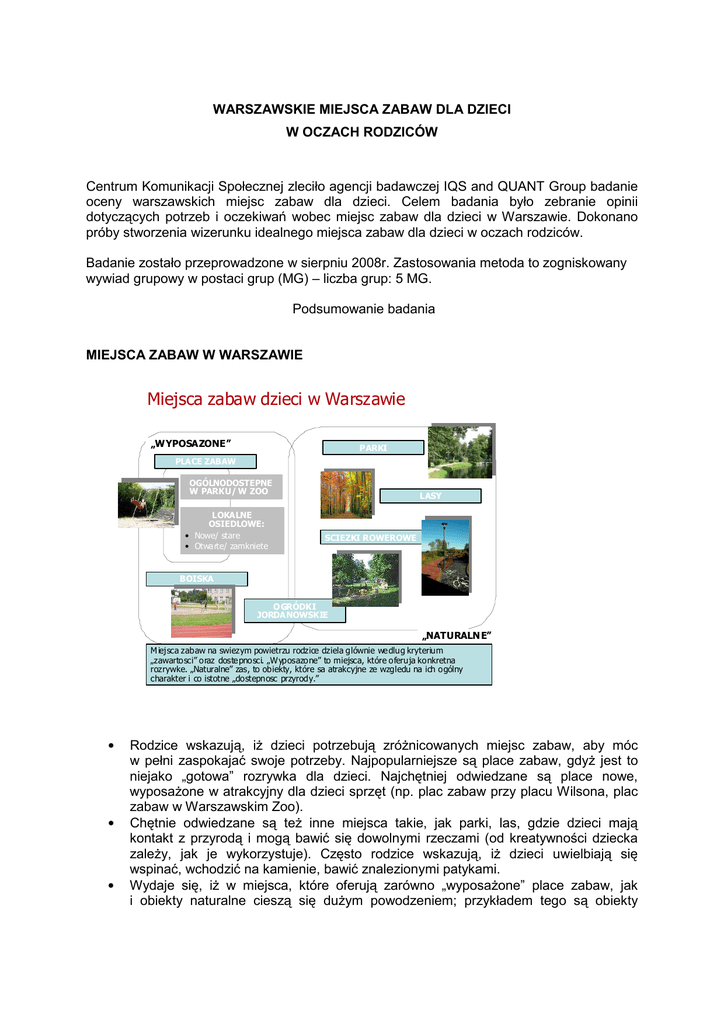 WARSZAWSKIE MIEJSCA ZABAW DLA DZIECI W OCZACH RODZICÓW Centrum Komunikacji Społecznej zleciło agencji badawczej IQS and QUANT Group badanie oceny warszawskich miejsc zabaw dla dzieci. Celem badania było zebranie opinii dotyczących potrzeb i oczekiwań wobec miejsc zabaw dla dzieci w Warszawie. Dokonano próby stworzenia wizerunku idealnego miejsca zabaw dla dzieci w oczach rodziców. Badanie zostało przeprowadzone w sierpniu 2008r. Zastosowania metoda to zogniskowany wywiad grupowy w postaci grup (MG) – liczba grup: 5 MG. Podsumowanie badania MIEJSCA ZABAW W WARSZAWIE Miejsca zabaw dzieci w Warszawie „WYPOSAZONE” PARKI PLACE ZABAW OGÓLNODOSTEPNE W PARKU/ W ZOO LOKALNE OSIEDLOWE: • Nowe/ stare • Otwa rte/ zamkniete LASY SCIEZKI ROWEROWE BOISKA O GRÓDKI JORDANOWSKIE „NATURALN E” M iejsca zabaw na swiezym powietrzu rodzice dziela glównie we dlug kryterium „zawartosci” oraz doste pnosci. „Wyposazone” to miejsca, które oferuja konkretna rozrywke. „Naturalne” zas, to obiekty, które sa atrakcyjne ze wzgledu na ich ogólny charakter i co istotne „dostepnosc przyrody.” • • • Rodzice wskazują, iŜ dzieci potrzebują zróŜnicowanych miejsc zabaw, aby móc w pełni zaspokajać swoje potrzeby. Najpopularniejsze są place zabaw, gdyŜ jest to niejako „gotowa” rozrywka dla dzieci. Najchętniej odwiedzane są place nowe, wyposaŜone w atrakcyjny dla dzieci sprzęt (np. plac zabaw przy placu Wilsona, plac zabaw w Warszawskim Zoo). Chętnie odwiedzane są teŜ inne miejsca takie, jak parki, las, gdzie dzieci mają kontakt z przyrodą i mogą bawić się dowolnymi rzeczami (od kreatywności dziecka zaleŜy, jak je wykorzystuje). Często rodzice wskazują, iŜ dzieci uwielbiają się wspinać, wchodzić na kamienie, bawić znalezionymi patykami. Wydaje się, iŜ w miejsca, które oferują zarówno „wyposaŜone” place zabaw, jak i obiekty naturalne cieszą się duŜym powodzeniem; przykładem tego są obiekty • • • parkowe, w których zostały wybudowane place zabaw. Dzieci po zabawie na placu mogą doświadczać dodatkowych wraŜeń w „naturalnym” otoczeniu. Wydaje się takŜe, iŜ nic nie przeszkadza temu, aby w ramach placów zabaw równieŜ oferować dzieciom obiekty naturalne, które mogą wykorzystywać do zabaw np. trawnik z miękką trawą, po którym moŜna chodzić, raczkować w okresie niemowlęctwa, tunele z krzewów, pagórki, na które moŜna się wspinać (niewiele bowiem placów zabaw znajduje się na rozległych terenach zielonych, wiele z nich to osiedlowe place). Coraz więcej nowych placów zabaw jest ogradzana (co cieszy większość rodziców), w pewnym stopniu gwarantuje to, iŜ przestrzeń ta nie będzie tak zanieczyszczona jak ogólnodostępne parki. Parki i las to miejsca chętnie wykorzystywane do zabaw równieŜ dlatego, iŜ oferują duŜą przestrzeń, moŜna ją wykorzystać do jazdy na rowerze, rolkach, co jest szczególnie atrakcyjne dla dzieci w wieku szkolnym. Co waŜne, do tej zabawy mogą takŜe włączać się rodzice. Niektóre dzieci chętnie odwiedzają teŜ boiska (dzieci w wieku szkolnym). Okazuje się jednak, iŜ wstęp na szkole boiska bywa utrudniany (zakaz wstępu, zamknięta furtka itp.). Rodzice najstarszych dzieci nie wiedzieli, iŜ obowiązuje przepis, w imię którego ich pociechy mogą swobodnie korzystać ze szkolnych boisk. OCENA MIEJSC ZABAW W WARSZAWIE • • • • • • • W prowadzonym badaniu rozmawiano na temat dostępnej oferty miejsc zabaw z rodzicami, którzy świadomie wybierają miejsca dla swoich dzieci, poproszono ich równieŜ o ocenę warszawskiej oferty. W opinii rodziców w Warszawie powstaje coraz więcej ciekawych i atrakcyjnych zarówno dla dzieci, jak i dla nich samych placów zabaw. O ich dobrej ocenie decyduje fakt, iŜ są to miejsca: − bezpieczne (dla rodziców oznacza to, iŜ są wyposaŜone w miękkie podłoŜe, nowe zabawki oraz ogrodzone) − atrakcyjne dla dzieci (oferują zróŜnicowane zabawki, często dopasowane do zróŜnicowanego wieku uŜytkowników placów zabaw) Jednak placów tych, w opinii rodziców, jest wciąŜ zbyt mało, w związku z tym na najpopularniejszych bywa czasem tak tłoczno, iŜ zabawa przestaje być moŜliwa (dzieci czekają w kolejce do zabawek, trudno znaleźć wolne miejsce do odpoczynku). Co więcej, atrakcyjne place zabaw, które opisują rodzice, są najczęściej w ogólnodostępnych miejscach np. parku miejskim – brak ich natomiast na osiedlach. To zmusza rodziców do przemieszczania się po mieście w celu zapewnienia dziecku odpowiedniej rozrywki. Przykładowo rodzice pragną, aby standardy obecne na placach zabaw takich jak w np. w Ogrodzie Saskim, za halą Mirowską były równieŜ standardem na placach osiedlowych, do których mają łatwy dostęp i są blisko ich miejsca zamieszkania, a to jest rzadkie. Rodzice wskazują teŜ na inne problemy związane z miejscem zabaw: − Zepsute sprzęty (brak szczebelka w drabince, odrapane urządzenia) − Sprzęt nie dostosowany do potrzeb dzieci (np. zbyt wysoka zjeŜdŜalnia – uŜytkownicy małych placów) − Brak toalety lub toaleta niedostosowana do potrzeb dzieci (dotyczy to duŜych placów) Jednak niezaleŜnie od typu problemu dominuje model odpowiedzialności zewnętrznej (administrator, spółdzielnia/wspólnota, „miasto”). Rodzice nie czują się osobiście odpowiedzialni za powstające problemy. Proponowane rozwiązania to głównie monitoring (kamery) lub nadzór osobisty (dozorca obiektu), który na bieŜąco rozwiązywałby wszystkie problemy. KRYTERIA WYBORU MIEJSCA ZABAW Podstawowe kryteria wyboru miejsca zabaw to: • atrakcyjność obiektu (na ile dziecko chętnie bawi się wyposaŜeniem, czy spotyka tam rówieśników) • bezpieczeństwo obiektu (na ile rodzic swobodnie pozwala dziecku bawić się samemu, np. w ogrodzonych placach) • odległość od miejsca zamieszkania (związane są z tym takie czynniki, jak ilość czasu, którą rodzice mog
