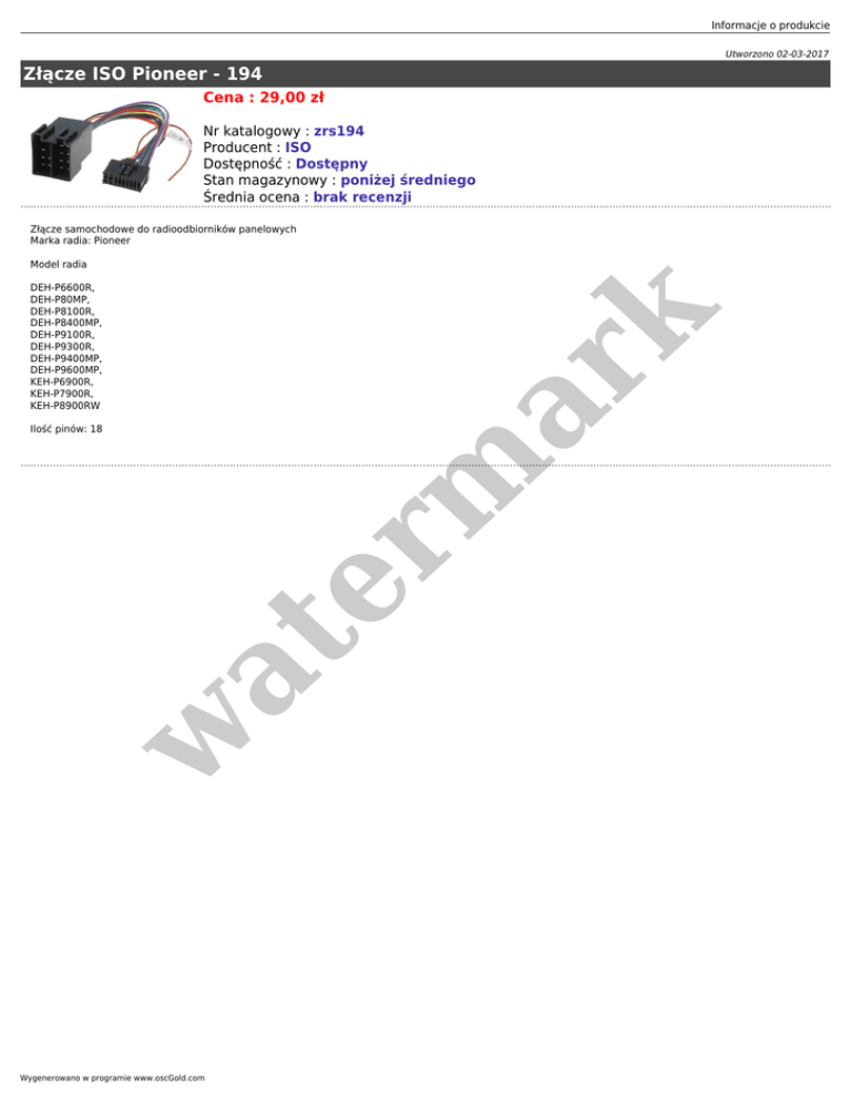 Informacje o produkcie Utworzono 02-03-2017 Złącze ISO Pioneer - 194 Cena : 29,00 zł Nr katalogowy : zrs194 Producent : ISO Dostępność : Dostępny Stan magazynowy : poniżej średniego Średnia ocena : brak recenzji Złącze samochodowe do radioodbiorników panelowych Marka radia: Pioneer Model radia er m ar k DEH-P6600R, DEH-P80MP, DEH-P8100R, DEH-P8400MP, DEH-P9100R, DEH-P9300R, DEH-P9400MP, DEH-P9600MP, KEH-P6900R, KEH-P7900R, KEH-P8900RW w at Ilość pinów: 18 Wygenerowano w programie www.oscGold.com