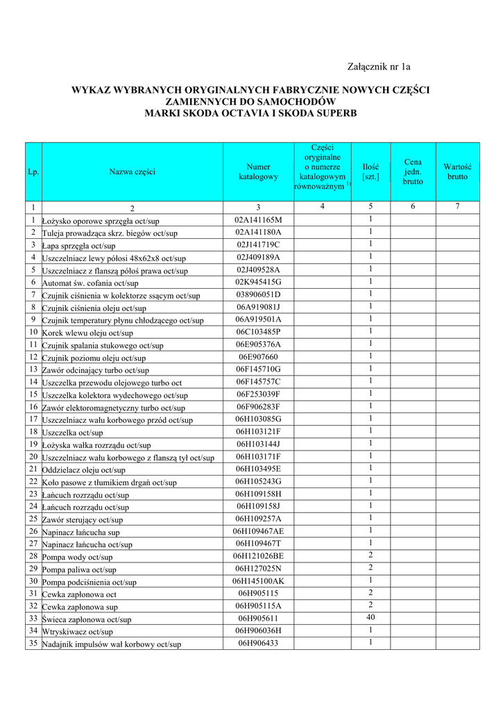 Załącznik nr 1a WYKAZ WYBRANYCH ORYGINALNYCH FABRYCZNIE NOWYCH CZĘŚCI ZAMIENNYCH DO SAMOCHODÓW MARKI SKODA OCTAVIA I SKODA SUPERB Lp. 1 1 2 3 4 5 6 7 8 9 10 11 12 13 14 15 16 17 18 19 20 21 22 23 24 25 26 27 28 29 30 31 32 33 34 35 Nazwa części 2 ŁoŜysko oporowe sprzęgła oct/sup Tuleja prowadząca skrz. biegów oct/sup Łapa sprzęgła oct/sup Uszczelniacz lewy półosi 48x62x8 oct/sup Uszczelniacz z flanszą półoś prawa oct/sup Automat św. cofania oct/sup Czujnik ciśnienia w kolektorze ssącym oct/sup Czujnik ciśnienia oleju oct/sup Czujnik temperatury płynu chłodzącego oct/sup Korek wlewu oleju oct/sup Czujnik spalania stukowego oct/sup Czujnik poziomu oleju oct/sup Zawór odcinający turbo oct/sup Uszczelka przewodu olejowego turbo oct Uszczelka kolektora wydechowego oct/sup Zawór elektoromagnetyczny turbo oct/sup Uszczelniacz wału korbowego przód oct/sup Uszczelka oct/sup ŁoŜyska wałka rozrządu oct/sup Uszczelniacz wału korbowego z flanszą tył oct/sup Oddzielacz oleju oct/sup Koło pasowe z tłumikiem drgań oct/sup Łańcuch rozrządu oct/sup Łańcuch rozrządu oct/sup Zawór sterujący oct/sup Napinacz łańcucha sup Napinacz łańcucha oct/sup Pompa wody oct/sup Pompa paliwa oct/sup Pompa podciśnienia oct/sup Cewka zapłonowa oct Cewka zapłonowa sup Świeca zapłonowa oct/sup Wtryskiwacz oct/sup Nadajnik impulsów wał korbowy oct/sup Numer katalogowy 3 02A141165M 02A141180A 02J141719C 02J409189A 02J409528A 02K945415G 038906051D 06A919081J 06A919501A 06C103485P 06E905376A 06E907660 06F145710G 06F145757C 06F253039F 06F906283F 06H103085G 06H103121F 06H103144J 06H103171F 06H103495E 06H105243G 06H109158H 06H109158J 06H109257A 06H109467AE 06H109467T 06H121026BE 06H127025N 06H145100AK 06H905115 06H905115A 06H905611 06H906036H 06H906433 Części oryginalne o numerze katalogowym równowaŜnym 1) 4 Ilość [szt.] 5 1 1 1 1 1 1 1 1 1 1 1 1 1 1 1 1 1 1 1 1 1 1 1 1 1 1 1 2 2 1 2 2 40 1 1 Cena jedn. brutto Wartość brutto 6 7 36 37 38 39 40 41 42 43 44 45 46 47 48 49 50 51 52 53 54 55 56 57 58 59 60 61 62 63 64 65 66 67 68 69 70 71 72 73 74 75 76 77 78 79 80 Miska olejowa oct/sup Koło zamachowe oct/sup Filtr oleju 1,8 tfsi oct/sup Uszczelka kolektora ssącego oct/sup Tarcza sprzęgła i docisk oct/sup TurbospręŜarka oct/sup Sterownik turbiny podciśnieniowy oc/sup Pasek wielorowkowy oct/sup Napinacz paska wielorowkowego oct/sup Czujnik ciśnienia paliwa oct Przepływomierz oct/sup Potencjometr w kolektorze ssącym oct/sup Nadajnik impulsow wałek rozrządu oct/sup Uszczelniacz wałka sprzęgłowego oct/sup Osłona tłoczka zacisku tył oct/sup Zbiorniczek wyrównawczy płynu chł. Oct/sup Filtr powietrza oct/sup Chłodnica powietrza doładowania oct/sup Przewód turbiny oct/sup Przewód turbiny oct/sup Przewód turbiny oct/sup Przewód turbiny oct/sup Tulejka osadcza wahacza przedniego tylna lewa oct/sup Tulejka osadcza wahacza przedniego tylna prawa oct/sup ŁoŜe silnika Poduszka zawieszenia skrzyni l.octavia ii Poduszka belki silnika - góra oct Poduszka belki silnika - dół oct Poduszka belki silnika - góra sup Poduszka belki silnika - dół sup Filtr paliwa oct/sup Zbiornik wegla aktywnego oct/sup Uszczelka oct/sup Uszczelka oct/sup Opaska podwójna wydechu oct/sup Tłumik środkowy oct Katalizator oct/sup Wahacz p.l. oct/sup Wahacz p.p. oct/sup Element metalowo gumowy wahacza przedniego przednia oct/sup Przegub kulisty wahacza l oct/sup Przegub kulisty wahacza p oct/sup SpręŜyna zawieszenia przód oct Stabilizator oct Stabilizator sup 06J103600T 06J105266B 06J115403C 06J129717 06J141015HX 06J145702CX 06J145716 06J260849D 06J903133A 06J906051D 06J906461B 06J998386 07L905163B 085311113 1J0698671 1K0121407A 1K0129620D 1K0145803T 1K0145828F 1K0145832J 1K0145834AM 1K0145838AG 1K0199231J 1K0199232J 1K0199262M 1K0199555M 1K0199867A 1K0199867Q 1K0199868A 1K0199868Q 1K0201051K 1K0201797AE 1K0253115AB 1K0253115K 1K0253141L 1K0253209CS 1K0254508PX 1K0407151T 1K0407152T 1K0407182 1K0407365C 1K0407366C 1K0411105AQ 1K0411303AM 1K0411303BJ 1 1 20 1 2 1 1 4 4 1 1 1 1 1 1 1 20 1 1 1 1 1 1 1 1 1 1 1 1 1 20 1 1 1 1 2 2 6 6 6 6 6 4 4 4 81 Łącznik stabilizatora oct/sup 82 Odbojnik amortyzatora przód oct/sup 83 ŁoŜyskowanie kolumny mc persona oct/sup 84 DrąŜek kierowniczy oct/sup 85 Końcówka drąŜka kierowniczego lewa oct/sup 86 Końcówka drąŜka kierowniczego prawa oct/sup 87 Przegub zewnętrzny oct/sup 88 Przegub wewnętrzny oct/sup 89 Osłona przegubu zewnętrzna oct/sup 90 Osłona przegubu wewnętrzna oct/sup 91 DrąŜek kierowniczy tył lewy oct/sup 92 DrąŜek kierowniczy tył prawy oct/sup 93 Wahacz wzdłuŜny tylny lewy oct/sup 94 Wahacz wzdłuŜny tylny prawy oct/sup 95 Wachacz poprzeczny oct/sup 96 Wahacz poprzeczny tył-góra oct/sup 97 Lacznik stabilizatora tył oct/sup 98 Sprezyna śrubowa tył oct 99 Sprezyna śrubowa tył sup 100 Amortyzator gazowy tył oct 101 Amortyzator gazowy tył sup 102 Rura ochronna amortyzatora oct/sup 103 Tarcza hamulcowa przednia sup 104 Tarcza hamulcowa przednia oct 106 Tarcza hamulcowa tył sup 107 Tarcza hamulcowa tył oct 108 Klocki hamulcowe tył oct/sup 109 Zestaw osłon trzpieni prowadzących oct/sup 110 Komplet uszczelek do zacisków hamulc.tar oct/sup 111 Skraplacz klimatyzacji oct/sup 112 Kompresor klimatyzacji oct/sup 113 Osłona podwozia lewa oct 114 Osłona podwozia prawa oct 115 Osłona podsilnikowa oct/sup 116 Przekładnia kierownicza oct/sup 117 Wkład filtra przeciwpyłkowego oct/sup 118 Tłumik końcowy oct 119 Amortyzator przód oct 120 Piasta koła przód oct/sup 121 Piasta koła tył oct/sup 122 Kołpak ozdobny felgi vega oct 123 Osłona nadkola p.p.oct 124 Nadkole p.l. oct 125 Nadkole p.p. oct 126 Podnośnik szyby t.l. oct 127 Podnośnik szyby t.p. oct 128 Kierunkowskaz w lusterku bocznym lewy oct 1K0411315K 1K0412303B 1K0412331B 1K0423810A 1K0423811K 1K0423812K 1K0498099BX 1K0498103AX 1K0498201A 1K0498203A 1K0501529F 1K0501530C 1K0505223K 1K0505224K 1K0505311AB 1K0505323N 1K0505465K 1K0511115B