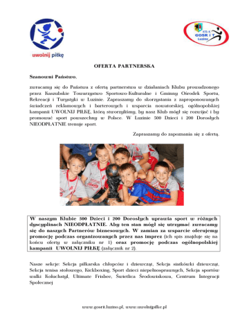 OFERTA PARTNERSKA Szanowni Państwo, zwracamy się do Państwa z ofertą partnerstwa w działaniach Klubu prowadzonego przez Kaszubskie Towarzystwo Sportowo-Kulturalne i Gminny Ośrodek Sportu, Rekreacji i Turystyki w Luzinie. Zapraszamy do skorzystania z zaproponowanych świadczeń reklamowych i barterowych i wsparcia nowatorskiej, ogólnopolskiej kampanii UWOLNIJ PIŁKĘ, którą stworzyliśmy, by nasz Klub mógł się rozwijać i by promować sport powszechny w Polsce. W Luzinie 500 Dzieci i 200 Dorosłych NIEODPŁATNIE trenuje sport. Zapraszamy do zapoznania się z ofertą. W naszym Klubie 500 Dzieci i 200 Dorosłych uprawia sport w różnych dyscyplinach NIEODPŁATNIE. Aby ten stan mógł się utrzymać zwracamy się do naszych Partnerów biznesowych. W zamian za wsparcie oferujemy promocję podczas organizowanych przez nas imprez (ich spis znajduje się na końcu oferty w załączniku nr 1) oraz promocję podczas ogólnopolskiej kampanii UWOLNIJ PIŁKĘ (załącznik nr 2). Nasze sekcje: Sekcja piłkarska chłopców i dziewcząt, Sekcja siatkówki dziewcząt, Sekcja tenisa stołowego, Kickboxing, Sport dzieci niepełnosprawnych, Sekcja sportów walki Koluchstyl, Ultimate Frisbee, Świetlica Środowiskowa, Centrum Integracji Społecznej www.gosrit.luzino.pl, www.uwolnijpilke.pl PAKIETY PARTNERSKIE PARTNER STRATEGICZNY pakiet o wartości 100 000 PLN PARTNER SEKCJI pakiet o wartości 10 000 PLN PARTNER IMPREZY (imprezy są wymienione na końcu oferty jako załącznik nr 1, wartość pakietu waha się od 500 PLN do 18 000 PLN w zależności, czy chodzi np. o pojedynczy mecz, czy cykl w rodzaju Kaszub Cup) Klub z Luzina jest jednym z ostatnich na mapie Polski, który kultywuje ideę bezpłatnego sportu powszechnego dla dzieci. Dzięki takim działaniom młodzież może się rozwijać niezależnie od statusu materialnego rodziców. PARTNER STRATEGICZNY pakiet o wartości 100 000 PLN Tytuł Głównego „Przyjaciela Luzińskiego Sportu” Umieszczenie logo firmy na wszystkich materiałach Klubu (dyplomy, plakaty, materiały informacyjne) Umieszczenie baneru reklamowego firmy podczas wszystkich zawodów organizowanych przez Klub (frekwencja na naszej hali to ok. 4000 osób tygodniowo) Dołączenie nazwy firmy do nazw wybranych imprez sportowych (do indywidualnego uzgodnienia) i tym samym informacja o Partnerze Strategicznym w przekazach medialnych Umieszczenie logo firmy w centralnym miejscu na koszulkach, dresach i torbach zawodników (forma do indywidualnego uzgodnienia) Umieszczenie logo firmy na www.gosrit.luzino.pl (notujemy około 23 000 unikalnych wejść na stronę miesięcznie, dotychczas zanotowaliśmy w sumie 1 668 958 unikalnych wejść na stronie Klubu) i na www.kts-k.e-luzino.pl Możliwość skorzystania z 10 zdjęć zawodników podczas akcji promocyjnych firmy (szczegóły do indywidualnych negocjacji) Możliwość organizacji imprezy integracyjnej dla Partnera Strategicznego, tj. treningu prowadzonego przez Rafała Kaczmarczyka, znanego jako zawodnika m. in. Lechii Gdańsk, Widzewa Łódź, Górnika Zabrze czy Dyskobolii Grodzisk Wielkopolski Możliwość przeprowadzenia puli 15 bezpłatnych indywidualnych treningów dla dziecka pracownika firmy (o równowartości 200 PLN za godzinę) www.gosrit.luzino.pl, www.uwolnijpilke.pl Udostępnienie boiska i obiektu wraz z nagłośnieniem, trybunami i zapleczem na imprezę integracyjną firmy w terminie uzgodnionym przez obie strony (o równowartości 500 PLN za godzinę) ORAZ promocja przy okazji kampanii UWOLNIJ PIŁKĘ, a w szczególności: Umieszczenie logo Partnera biznesowego na stronie internetowej www.uwolnijpilke.pl: - na stronie głównej - na podstronie FILMIKI - na podstronie REKORD GUINESSA - na podstronie 1 % Nagranie spotu reklamowego Partnera Strategicznego z udziałem naszych zawodników Umieszczenie baneru Partnera Strategicznego podczas bicia rekordu Guinessa na naszej hali PARTNER SEKCJI Tytuł „Przyjaciela Luzińskiego Sportu” Umieszczenie logo firmy na materiałach Klubu (dyplomy, plakaty, materiały informacyjne) Umieszczenie baneru reklamowego firmy podczas zawodów organizowanych przez Klub (frekwencja na naszej hali to ok. 4000 osób tygodniowo, szczegóły do indywidualnych negocjacji) Umieszczenie logo firmy na www.gosrit.luzino.pl (notujemy około 23 000 unikalnych wejść na stronę miesięcznie, dotychczas zanotowaliśmy w sumie 1 668 958 unikalnych wejść na stronie Klubu) i na www.kts-k.e-luzino.pl Dołączenie nazwy firmy do nazwy Sekcji i tym samym informacja o Partnerze Sekcji w przekazach medialnych Możliwość skorzystania z 2 zdjęć zawodników Sekcji podczas (szczegóły do indywidualnych negocjacji) akcji promocyjnych firmy Możliwość organizacji imprezy integracyjnej dla Partnera Sekcji, tj. treningu prowadzonego przez Rafała Kaczmarczyka, znanego jako zawodnika m. in. Lechii Gdańsk, Widzewa Łódź, Górnika Zabrze czy Dyskobolii Grodzisk Wielkopolski Możliwość przeprowadzenia puli 6 bezpłatnych indywidualnych treningów dla dziecka pracownika firmy (o równowartości 200 PLN za godzinę) ORAZ promocja przy okazji kampanii UWOLNIJ PIŁKĘ, a w szczególności (rozwinięcie na kolejnej stronie): www.gosrit.luzino.pl, www.uwolnijpilke.pl Umieszczenie logo Partnera Sekcji na stronie internetowej www.uwolnijpilke.pl: - na stronie głównej - na podstronie REKORD GUINESSA Umieszczenie baneru Partnera Sekcji podczas bicia rekordu Guinessa na naszej hali PARTNER IMPREZY wartość pakietu waha się od 500 PLN do 18 000 PLN w zależności, czy chodzi np. o pojedynczy mecz, czy cykl w rodzaju Kaszub Cup – poniżej zamieszczamy przykłady świadczeń (negocjowane w zależności od wysokości wkładu Partnera) Tytuł „Przyjaciela Luzińskiego Sportu” Umieszczenie logo firmy na materiałach Klubu związanych z imprezą (dyplomy, plakaty, materiały informacyjne) Umieszczenie baneru reklamowego firmy w centralnym miejscu podczas imprezy (frekwencja na naszej hali to ok. 4000 osób tyg